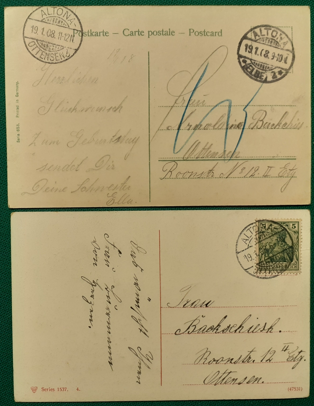 am 19.1.1908 innerhalb Altonas bei Hamburg mit Absende- und Empfangsstempel,