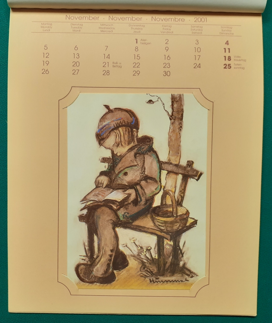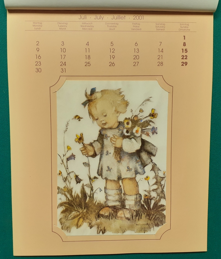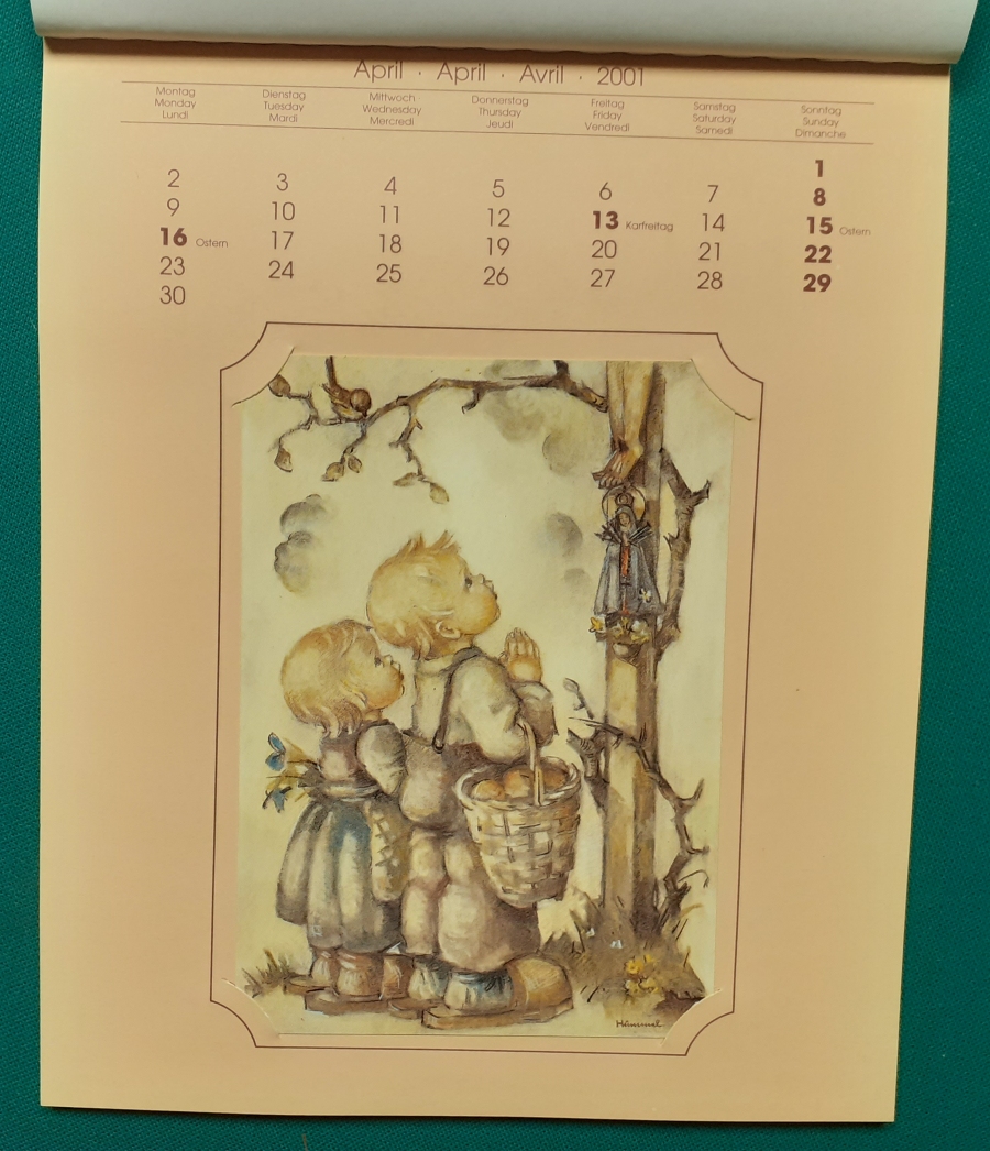 Berta Maria Innocentia Hummel im Format 24,5 x 19 cm; Abreißkalender mit Klarsichtfolie auf der Vorderseite; mit 12 montierten neuen Postkarten (je Monat eine) mit Motiven von Berta Hummel; alle Karten natürlich ungelaufen und neu; neuwertiger Zustand - alle 12 Postkarten sind selbstverständlich auch demontierbar, weil sie nur in passende Schlitze auf dem Kalenderblatt eingesteckt sind. Komplettpreis des Kalenders: 9 EURO Inhalt: (Motive der einzelnen Karten) |