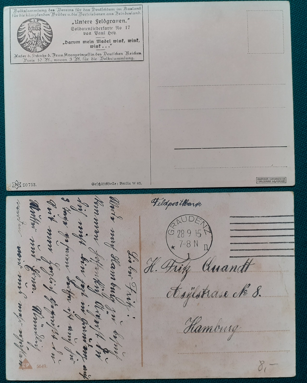 zugestellt am 28.9.1915 von Graudenz nach Hamburg, sehr