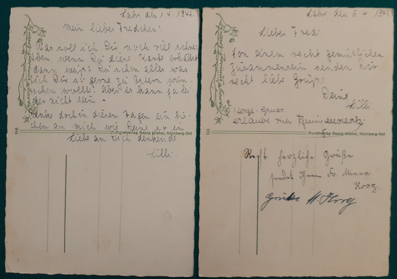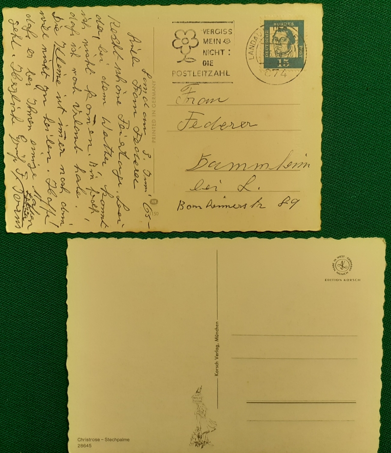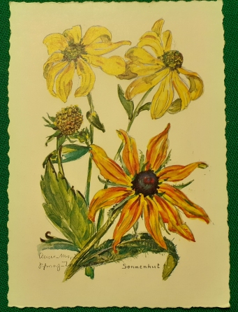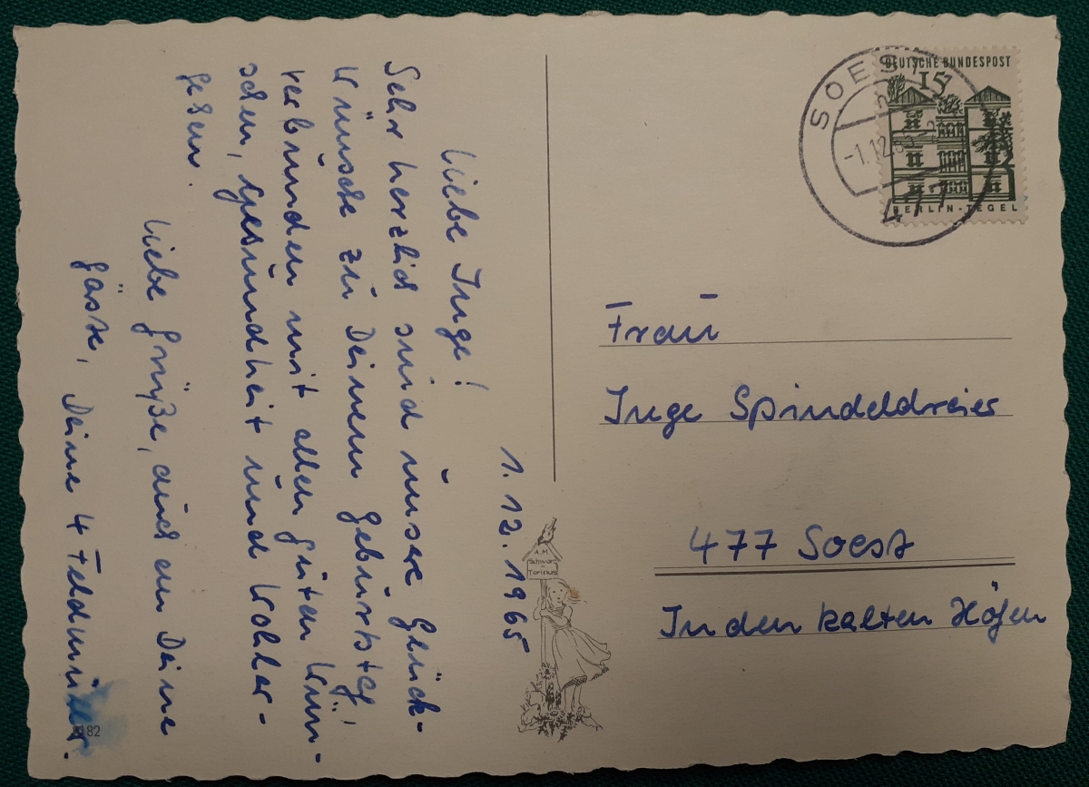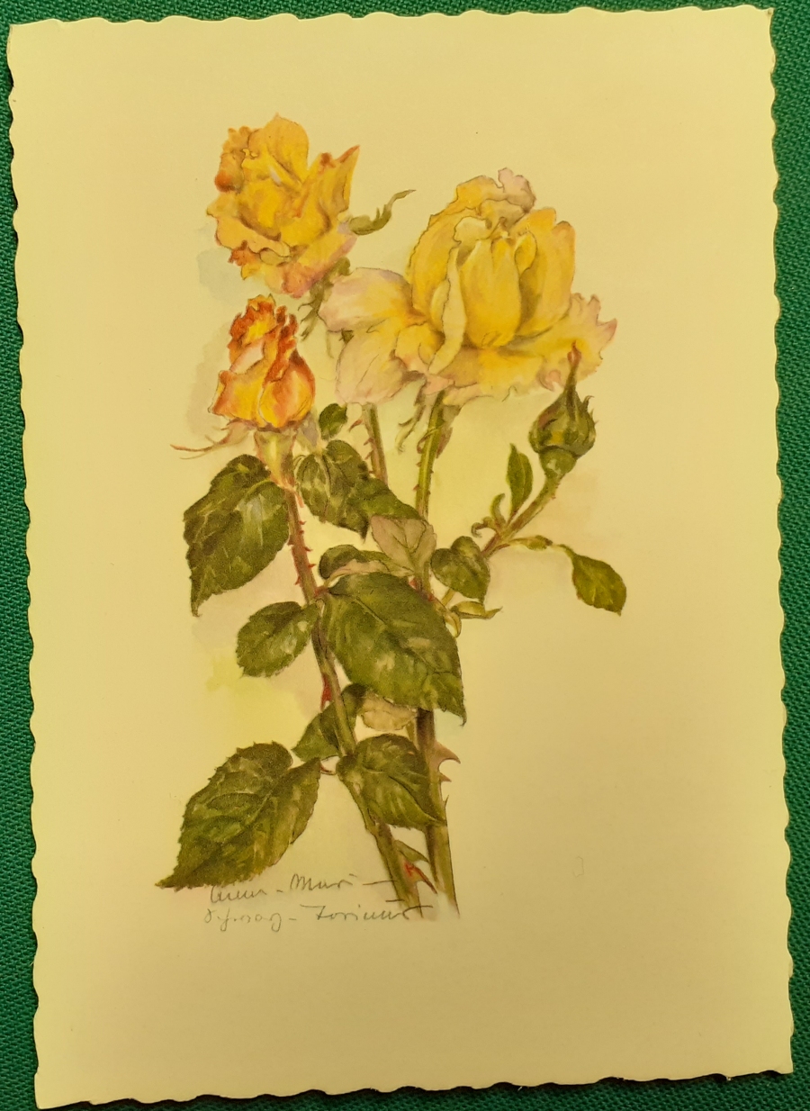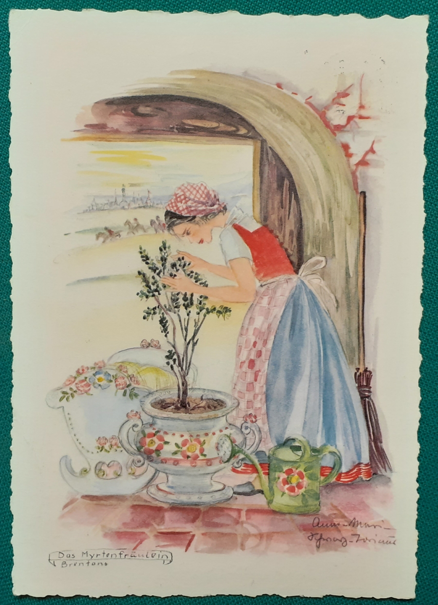 Geboren 1907: Deutsche Malerin und Zeichnerin: In den 1940er Jahren hat sie einige Märchen- und Kinderbücher illustriert. Auch sind ihre Motive als Postkarten im Kunstverlag Michel / Edition Korsch reproduziert worden. Die Signatur der Künstlerin auf ihren Karten siehe oben |