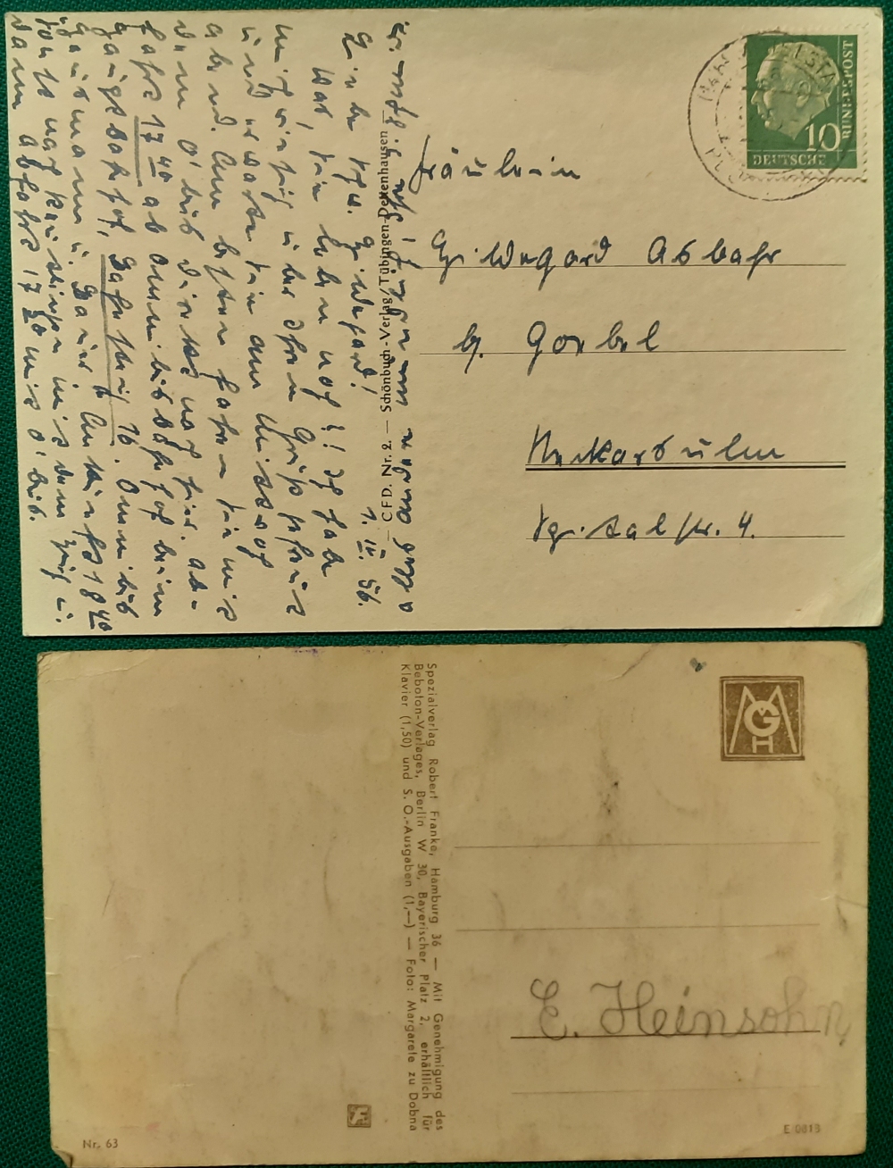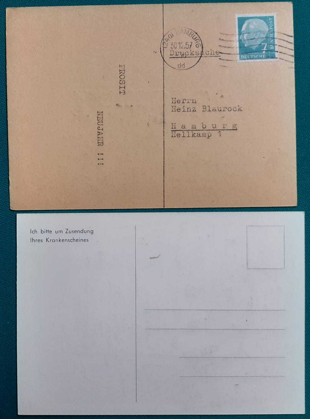 gelaufen am 30.12.1957 als Drucksache innerhalb Hamburgs mit schönem Rundstempel;