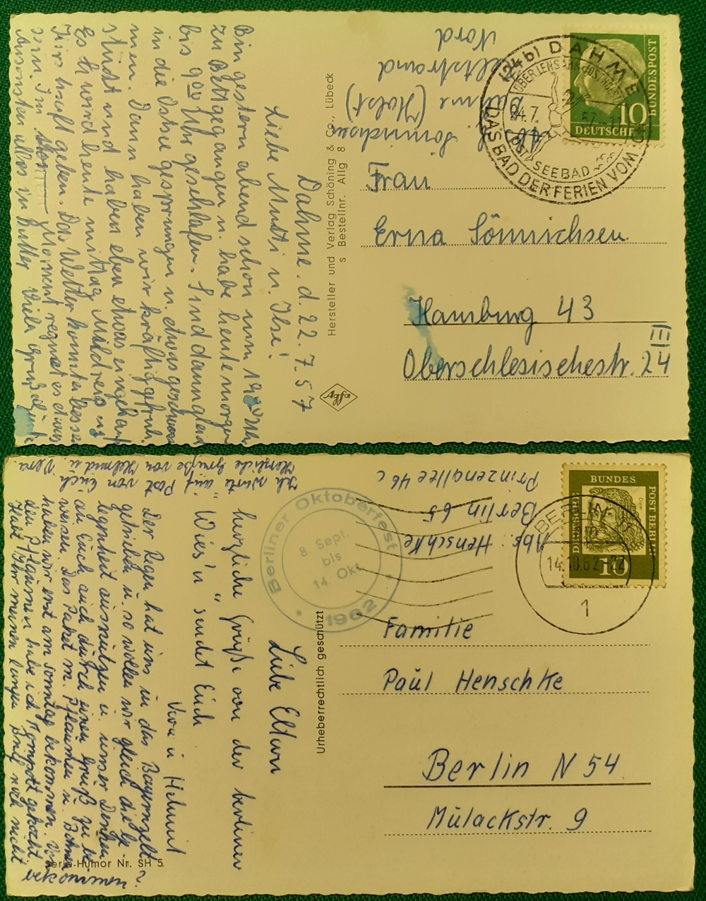 Marke 1957 und schönem Sonderstempel Dahme; rechts innerhalb Berlins 1962