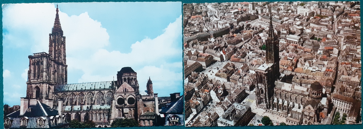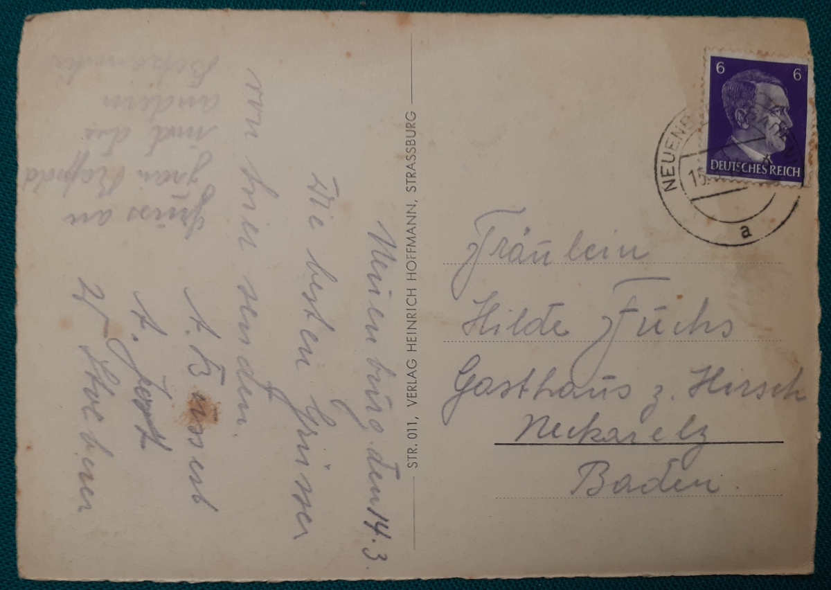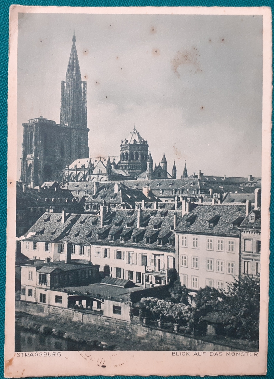 Karte Strassburg 1 Blick auf das Münster zugestellt am 15.3.1944 von Neuenburg nach Neckarelz; schöner Rundstempel; Briefmarke 6 Rpf. Hitler; an den Kanten etwas bestoßen, etwas geblfleckig; noch recht guter altersgemäßer Zustand Preis 2 EURO |