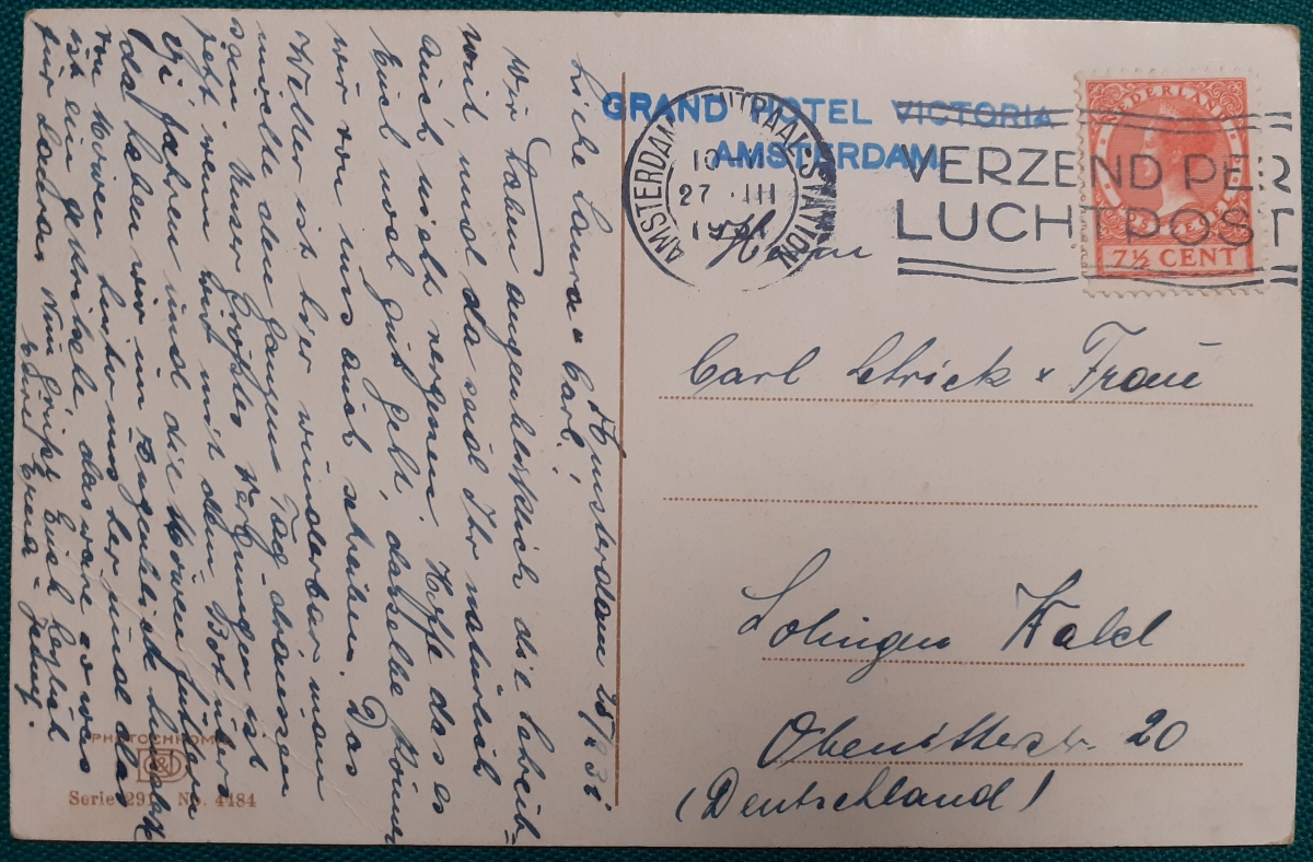 Karte Volendam Frauen in Tracht zugestellt am 27.11.1931 von Amsterdam (Grand Hotel Victoria) nach Solingen; schöner Rundstempel; schöner Sonderstempel "Verzend per Luchtpost"; Briefmarke 7,5 Cent; an den Kanten etwas bestoßen, Knick rechts oben; noch recht guter altersgemäßer Zustand Preis 2 EURO |