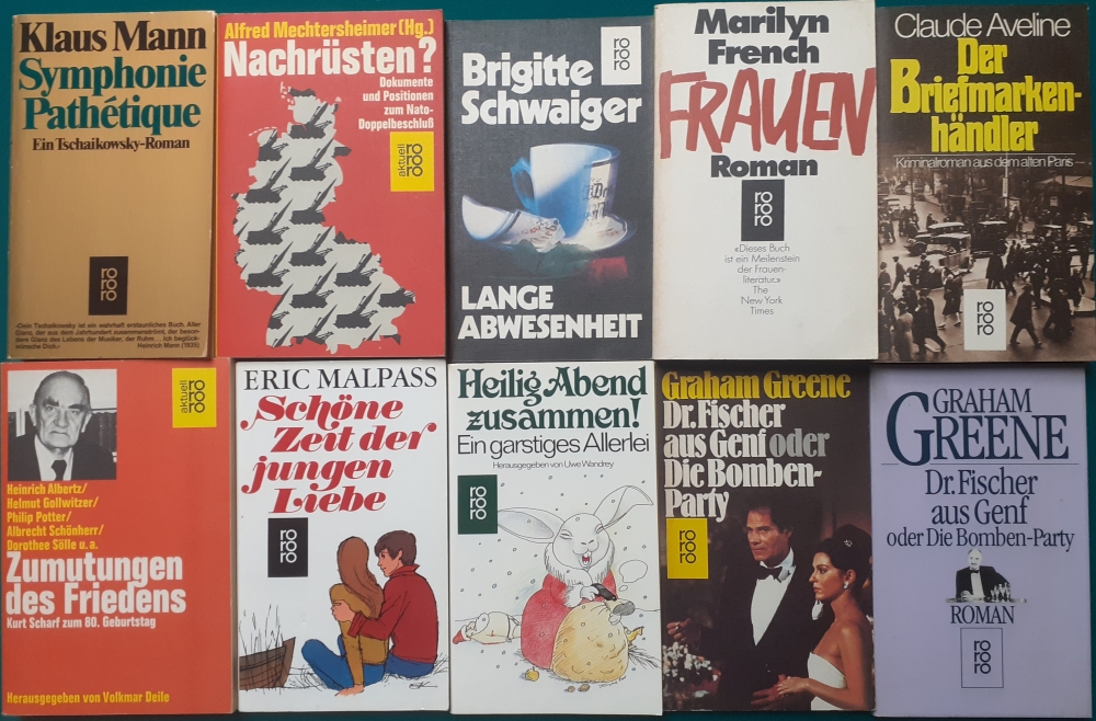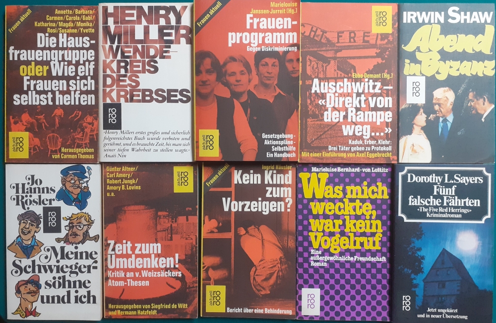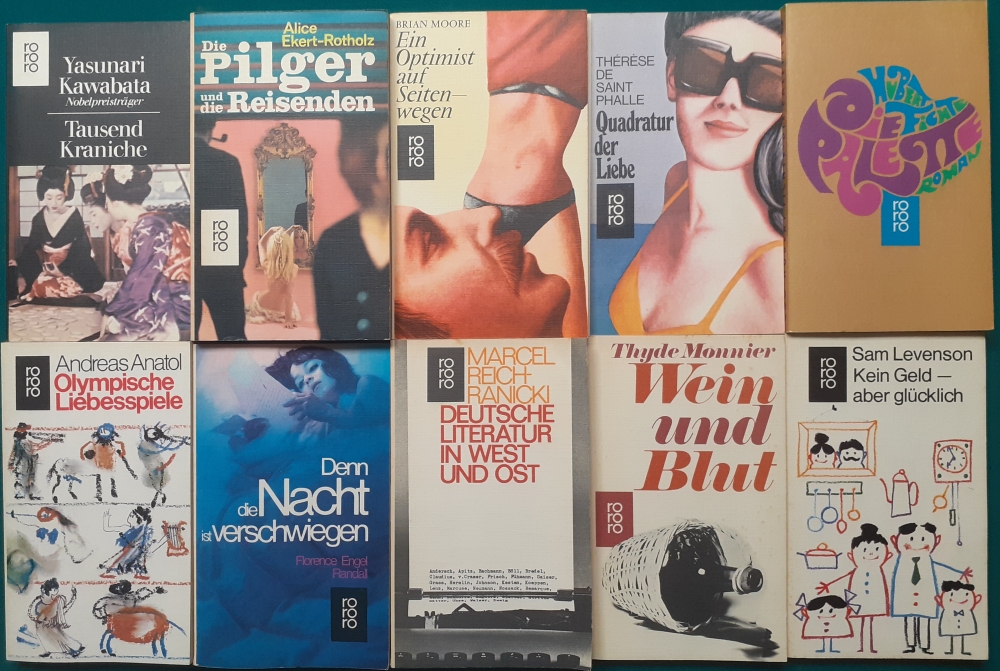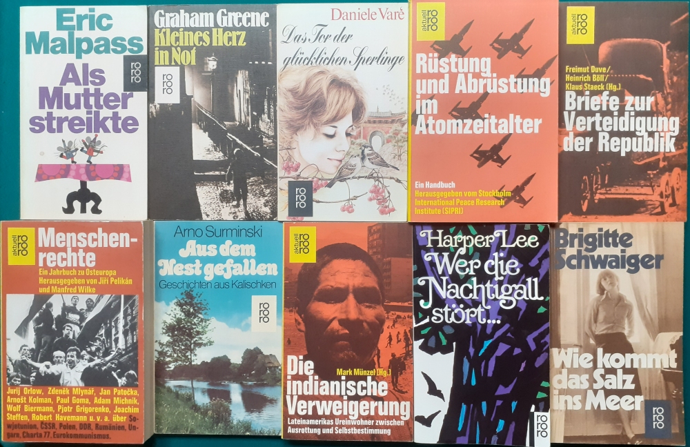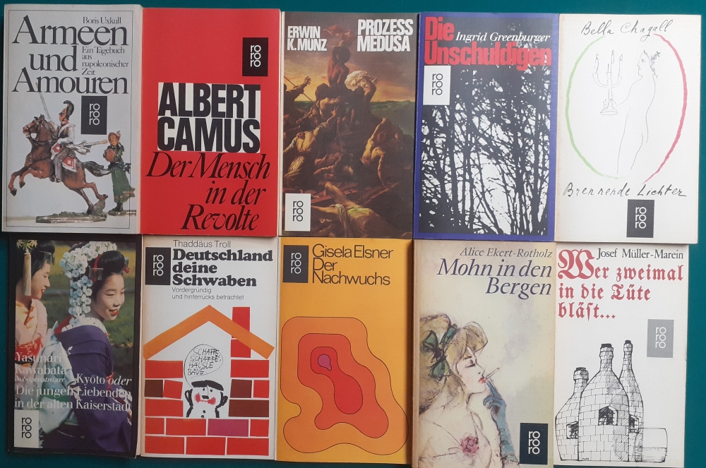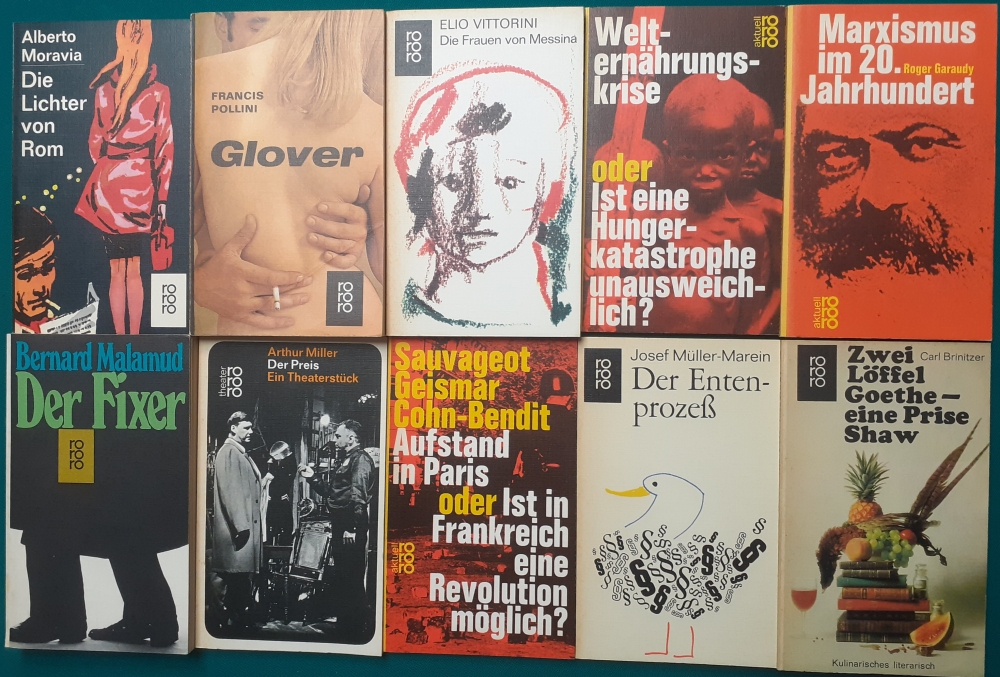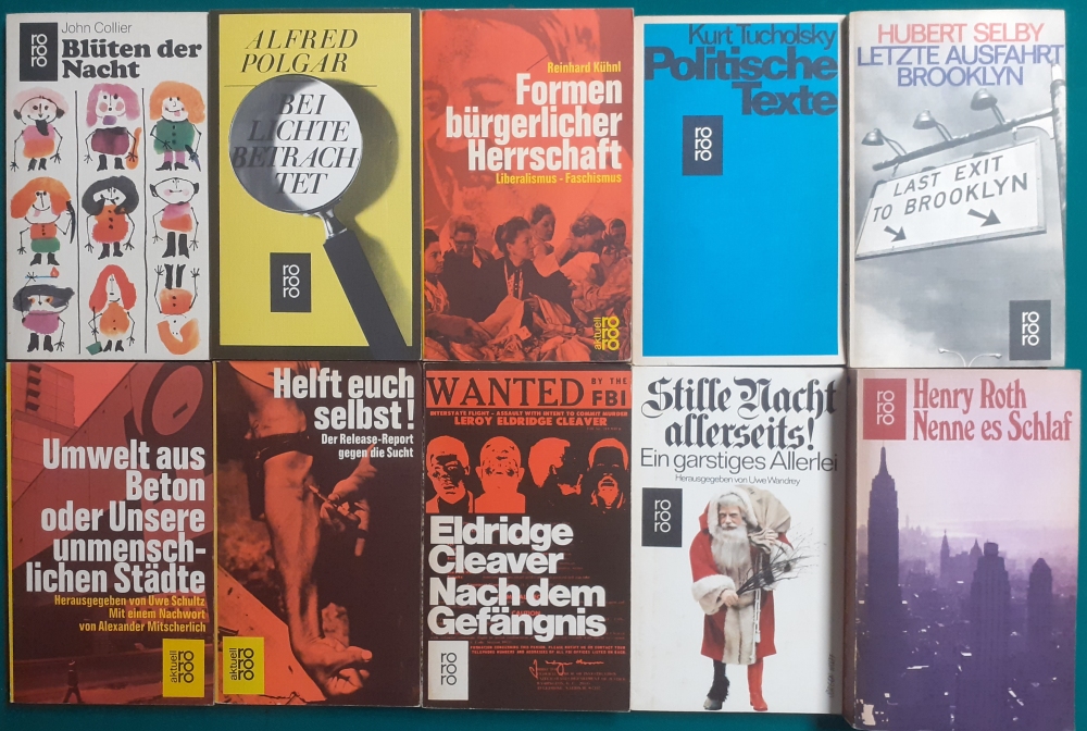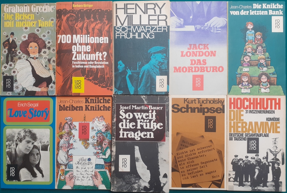 Die Bände sind nach ihren Nummern und damit nach Erscheinungsdatum sortiert. Alle hier angebotenen Bände sind antiquarische Einzelstücke; es ist durchaus möglich, dass vorn innen Namenseinträge sind, ohne dass in den Bemerkungen extra darauf hingewiesen wird. Innerhalb der normalen Nummerierung erschienen Sonderreihen, zum Beispiel "rororo aktuell" sowie "rororo modernes theater" (siehe Abbildungen). In unserer Auflistung sind die Nummern der Reihe "rororo aktuell" zum schnelleren Auffinden rot markiert, die Nummern der Reihe "rororo modernes theater" grün. |