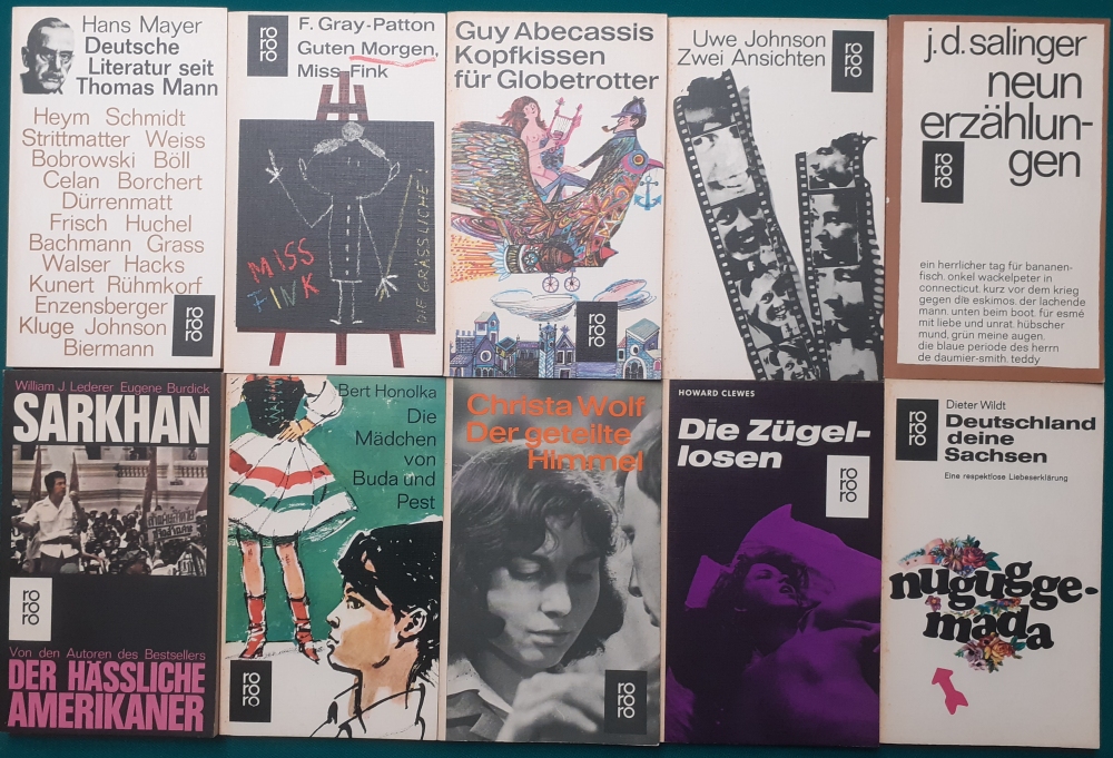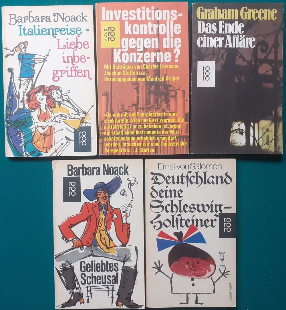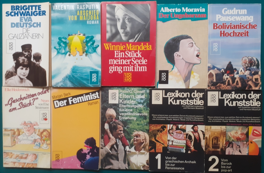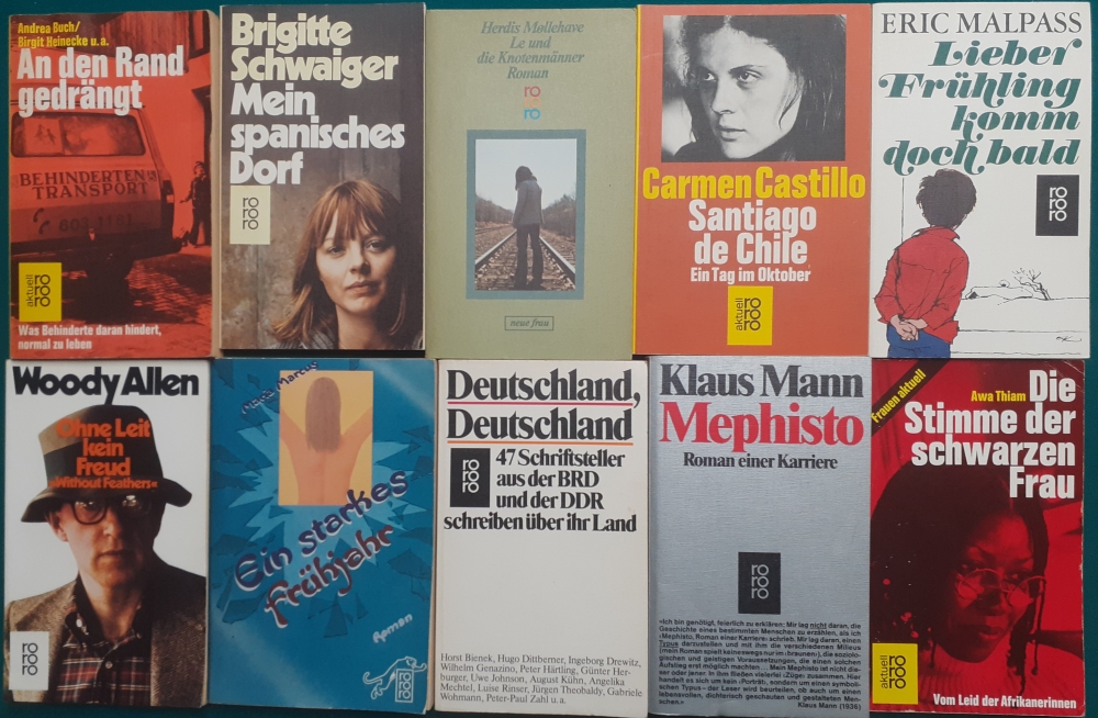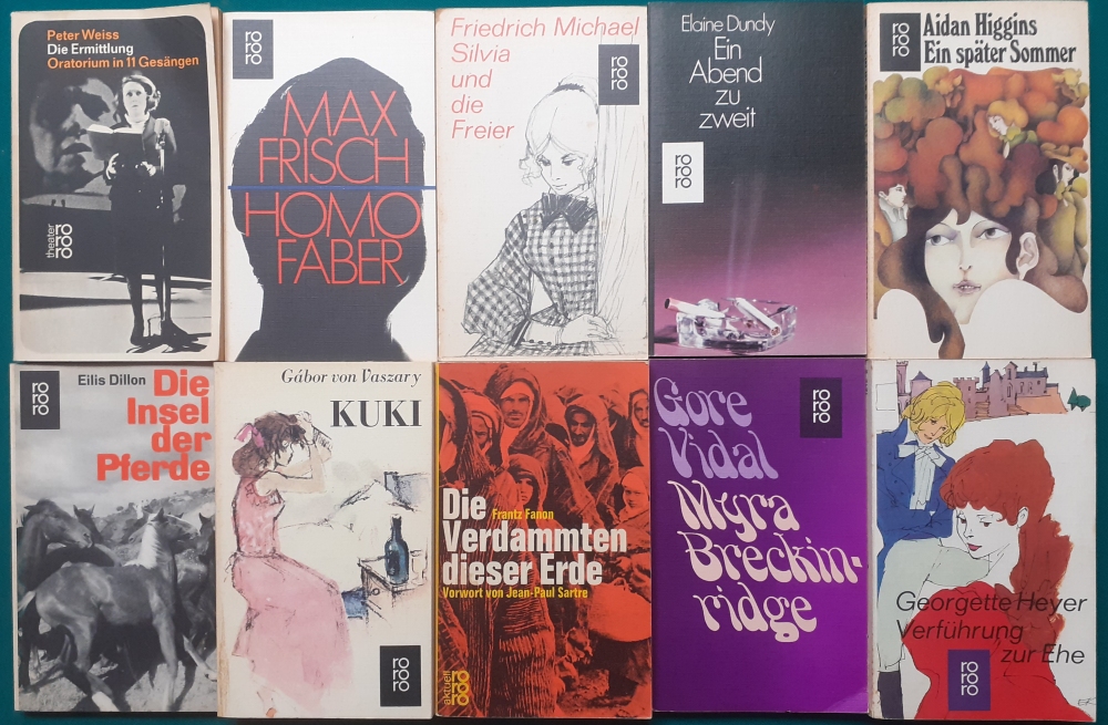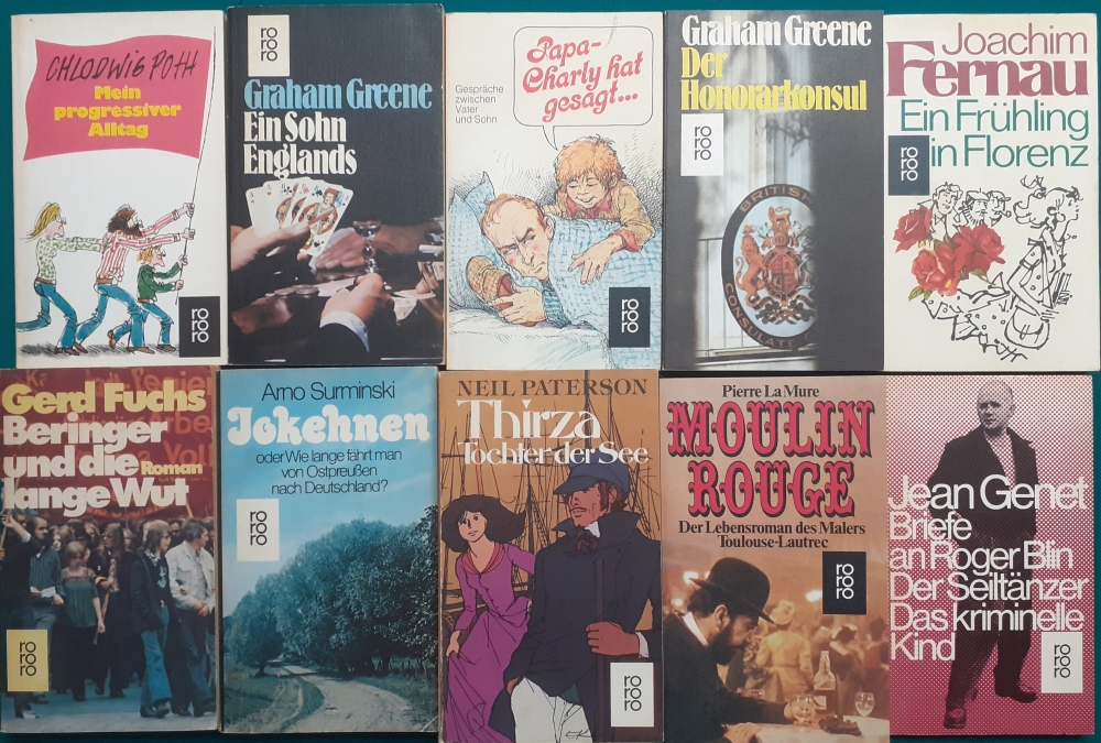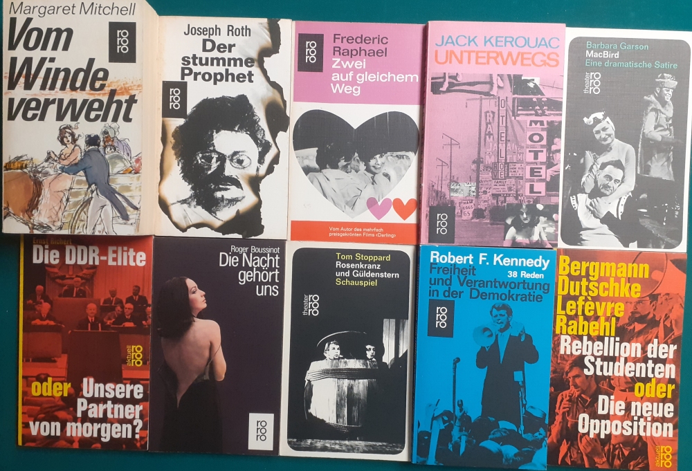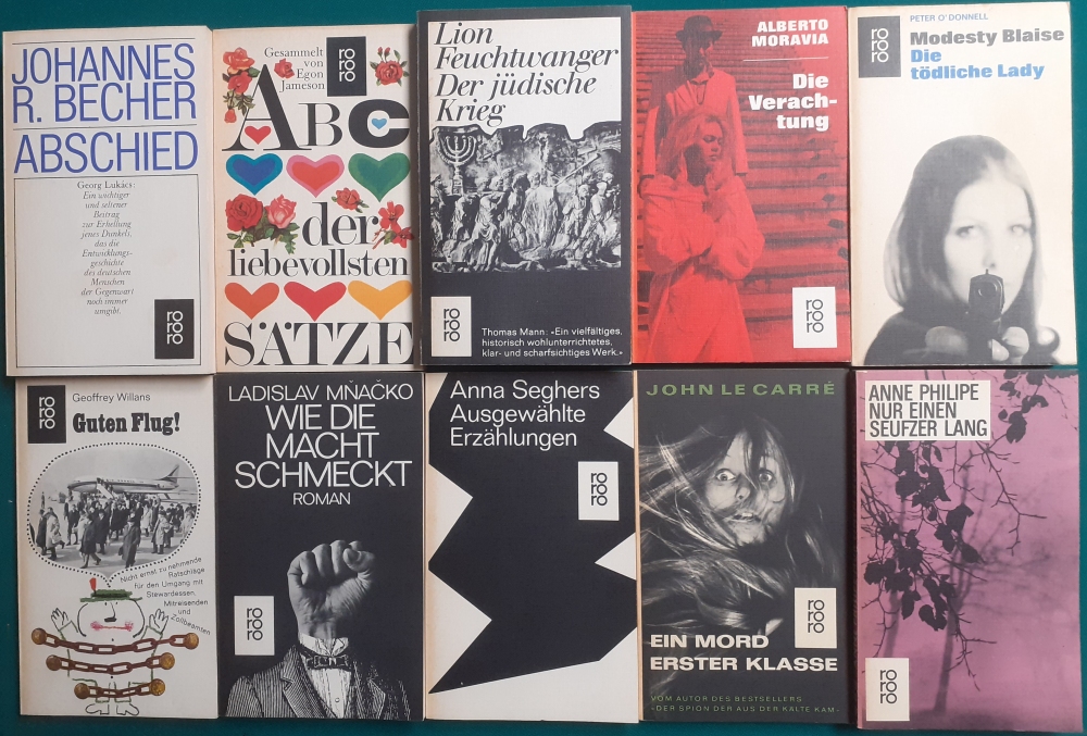 Die Bände sind nach ihren Nummern und damit nach Erscheinungsdatum sortiert. Alle hier angebotenen Bände sind antiquarische Einzelstücke; es ist durchaus möglich, dass vorn innen Namenseinträge sind, ohne dass in den Bemerkungen extra darauf hingewiesen wird. Innerhalb der normalen Nummerierung erschienen Sonderreihen, zum Beispiel "rororo aktuell" sowie "rororo modernes theater" (siehe Abbildungen). In unserer Auflistung sind die Nummern der Reihe "rororo aktuell" zum schnelleren Auffinden rot markiert, die Nummern der Reihe "rororo modernes theater" grün. |