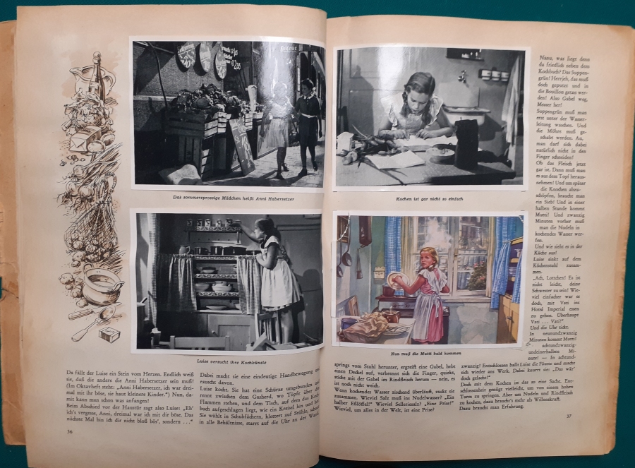 - Sammelalbum Ausgabe von 1952, nach dem Roman und gleichnamigen Film und Roman von Erich Kästner. Das Buch hat 64 Seiten und ist mit 66 der insgesamt 96 farbigen Sammelbildern im Format von meist jeweils 14 x 10 cm beklebt, es fehlen also 30 Bilder!!!; Format des Albums: 32 x 23 cm, Pappeinband. die Albumkanten sind bestoßen, der Einband hat leider viele Knicke und ist beschädigt und mit Tesafilm repariert worden. Alle Blätter innen aber fest; insgesamt ist das Buch in sich wellig; ausreichender altersgemäßer Zustand. Die Bilder stammen aus dem Carlton-Film; nacherzählt wurde die Geschichte von Ursula Kotthaus. Die Hauptrollen spielen Isa und Jutta Günther, Peter Mosbacher und Antje Weissgerber u.v.a. Preis: 7 EURO |