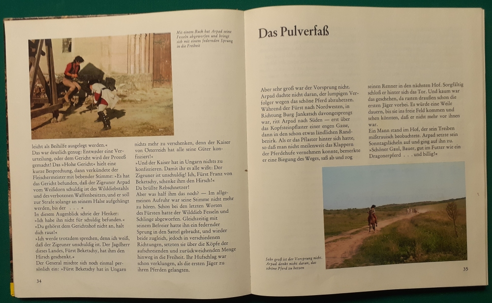 Thomas Münster: im Penny Verlag Neu-Isenburg, Ausgabe von 1973, Buch mit Rundum-Hochglanzeinband im Format 24 x 21 cm, 136 Seiten, mit 50 komplett und sorgfältig eingeklebten farbigen Sammelbildern im Format 13 x 8,5 cm; insgesamt in sehr gutem altersgemäßen Zustand. Die Bilder sind der Fernsehserie ARPAD der Zigeuner entnommen. Preis: 15 EURO Fernseh-Abenteuerbücher der Reihe ARPAD der Zigeuner siehe unter Kinderbücher - Fernseh-Abenteuerbände |