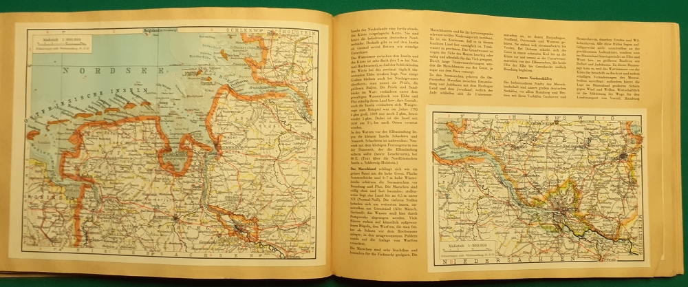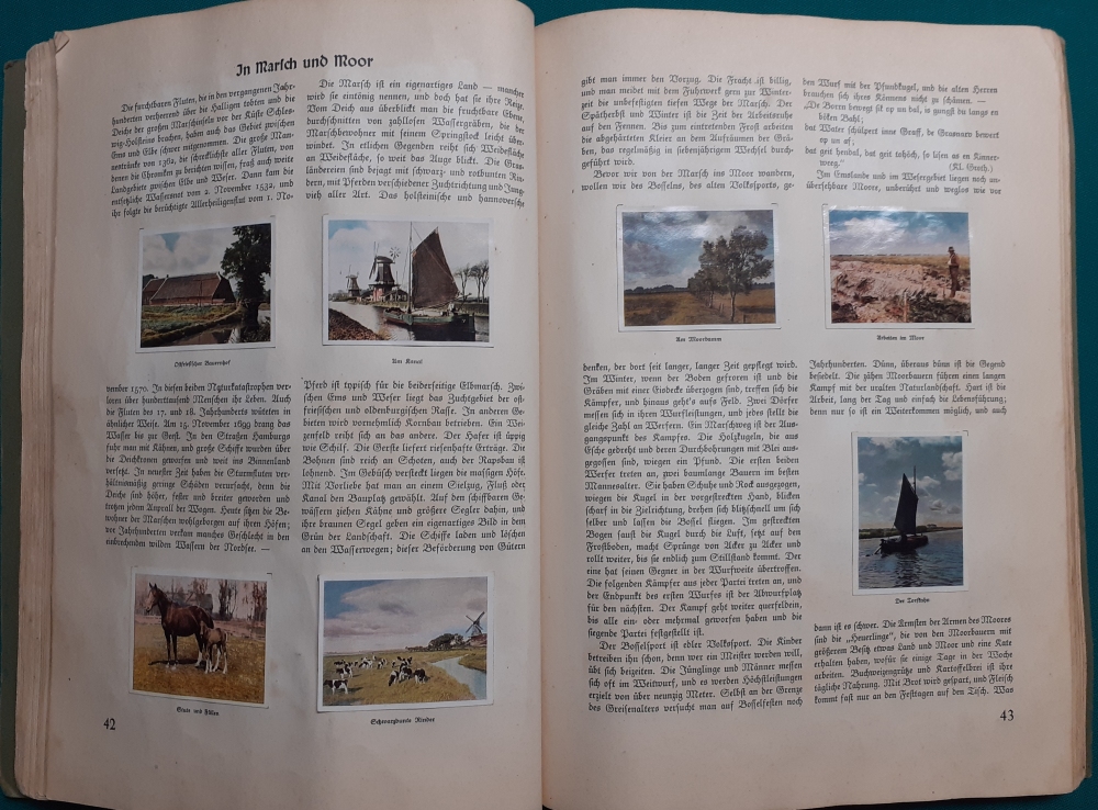 Hans von der Nordmark: Erstausgabe von 1935, Kiel, Album im Pappeinband mit 80 Seiten im Format 30,5 x 23,5 cm, 31 Abschnitte von Dithmarschen bis Spreewald und Ostmark, mit allen 291 Sammelbildern vollständig beklebt, das Buch ist innen ziemlich wellig und braunfleckig, zum Teil mit Randläsuren, Einband sehr fleckig, an den Albumkanten bestoßen; innen alles gut lesbar und insgesamt noch befriedigender altersgemäßer Zustand Preis: 24 EUR |