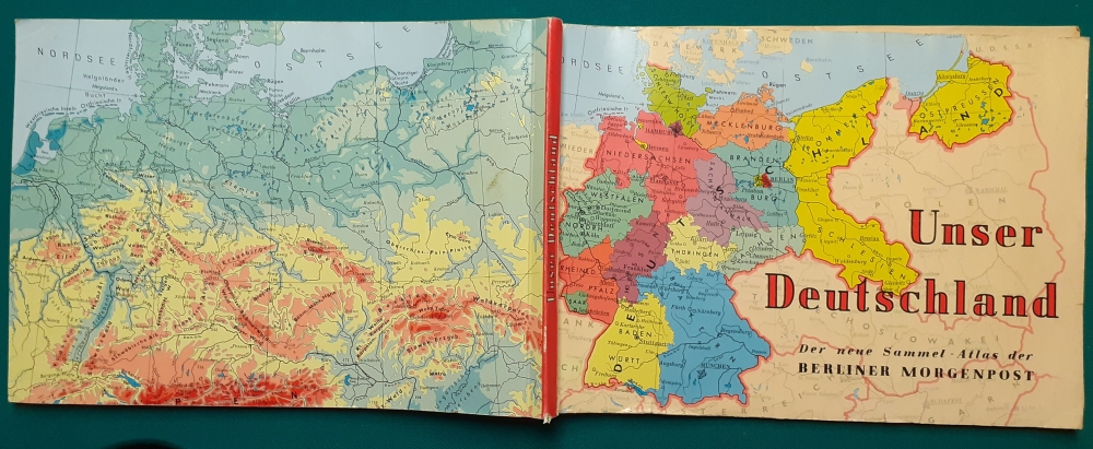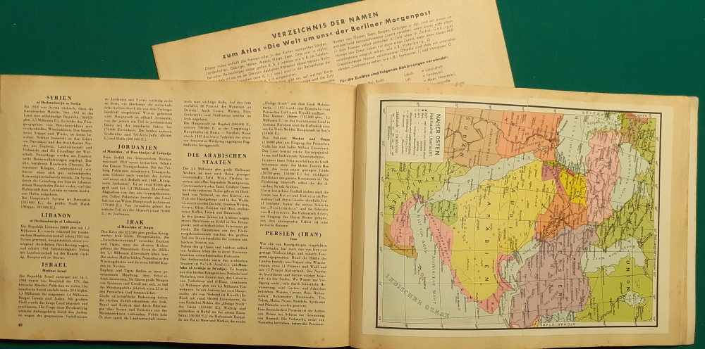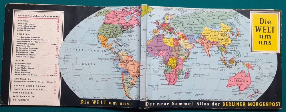Die Welt um uns Hrsg. Berliner Morgenpost, Ausgabe von 1956, 54 Seiten im Hartpappeinband im Format 21 x 30 cm; mit 53 farbigen vollständig eingeklebten Sammelbildern (Kartenteile) versehen, dazu gehört ein 24seitiges Namensverzeichnis zum Atlas, Format der Sammelbilder meist 26 x 19 cm, guter altersgemäßer Zustand Preis 13 EUR |