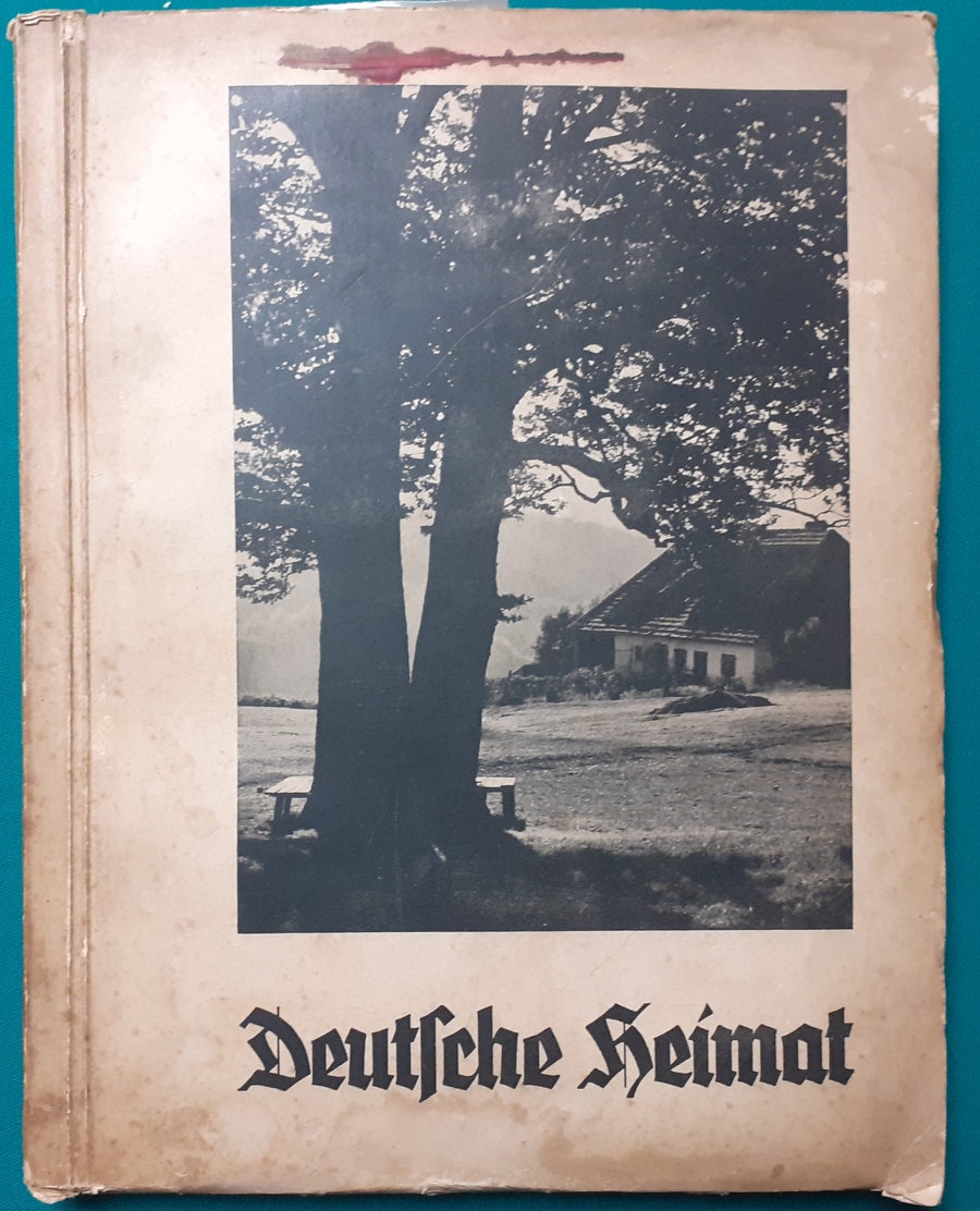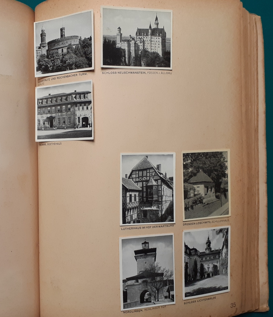 Deutsche Heimat Hrsg. Yramos Zigarettenfabrik Dresden - Serie E, Ausgabe um 1930, Album im Format 32 x 24 cm, mit 283 von 286 Bildern sauber beklebt - es fehlen die Bilder 70, 130 und 155, Pappeinband mit Pappseiten; an den Albumkanten bestoßen und mit Knicken am Blattrand, Einband fleckig; innen z.T. gelbfleckig; insgesamt noch befriedigender altersgemäßer Zustand zum Inhalt: Preis 15 EUR |