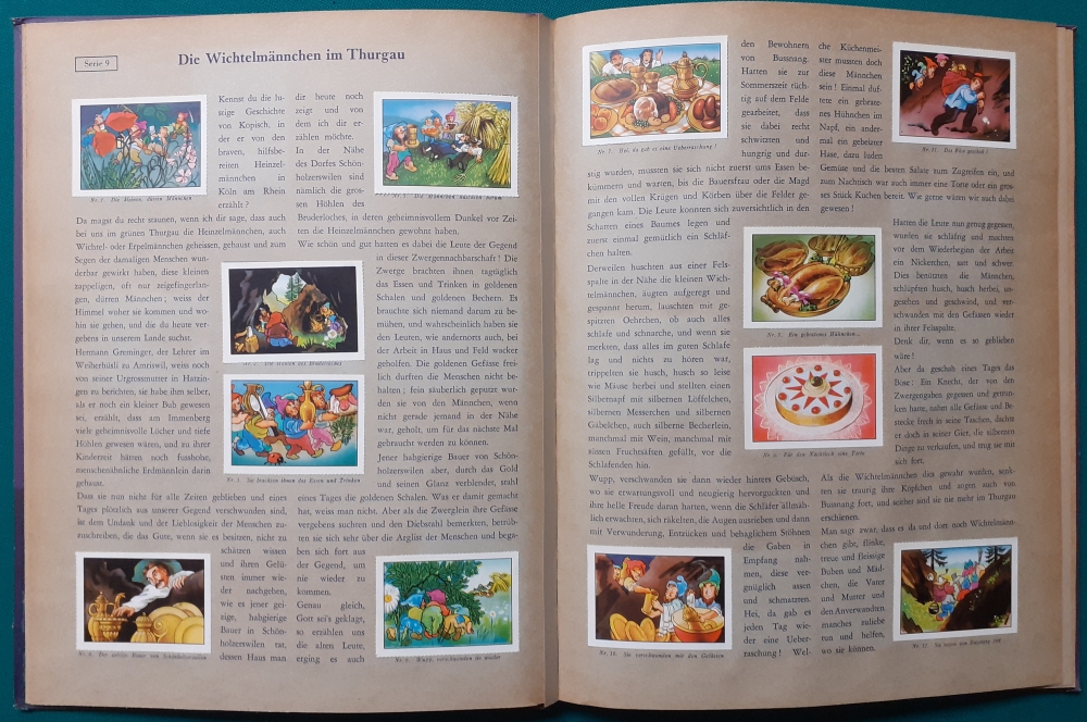 Schöne Schweizer Sagen herausgegeben 1951 by Aktiengesellschaft für Nestlé-Produkte in der Schweiz / Switzerland; weiters von Chocolats, Peter Cailler Kohler; 76 Seiten, enthalten sind 24 Serien mit je 12 Bildern; alle 288 Bilder komplett und sehr sauber eingeklebt, Leinenrücken mit Hartpappeinband; sehr guter altersgemäßer Zustand; Album im Format 28 x 22,5 cm.