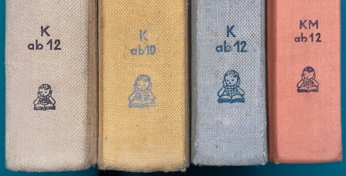 Embleme von links nach rechts: a) Die Ausgabe (mit Leinenrücken) um 1940 mit FSV-Emblem im Oval b) Ausgabe von 1951 mit dem FSV-Schriftzug c) Ausgabe um 1952 mit dem lesenden Kind ohne roten Punkt d) Ausgabe von 1953 mit dem lesenden Kind und dem hellroten Punkt (zum 40jährigen Jubiläum des Verlages) |