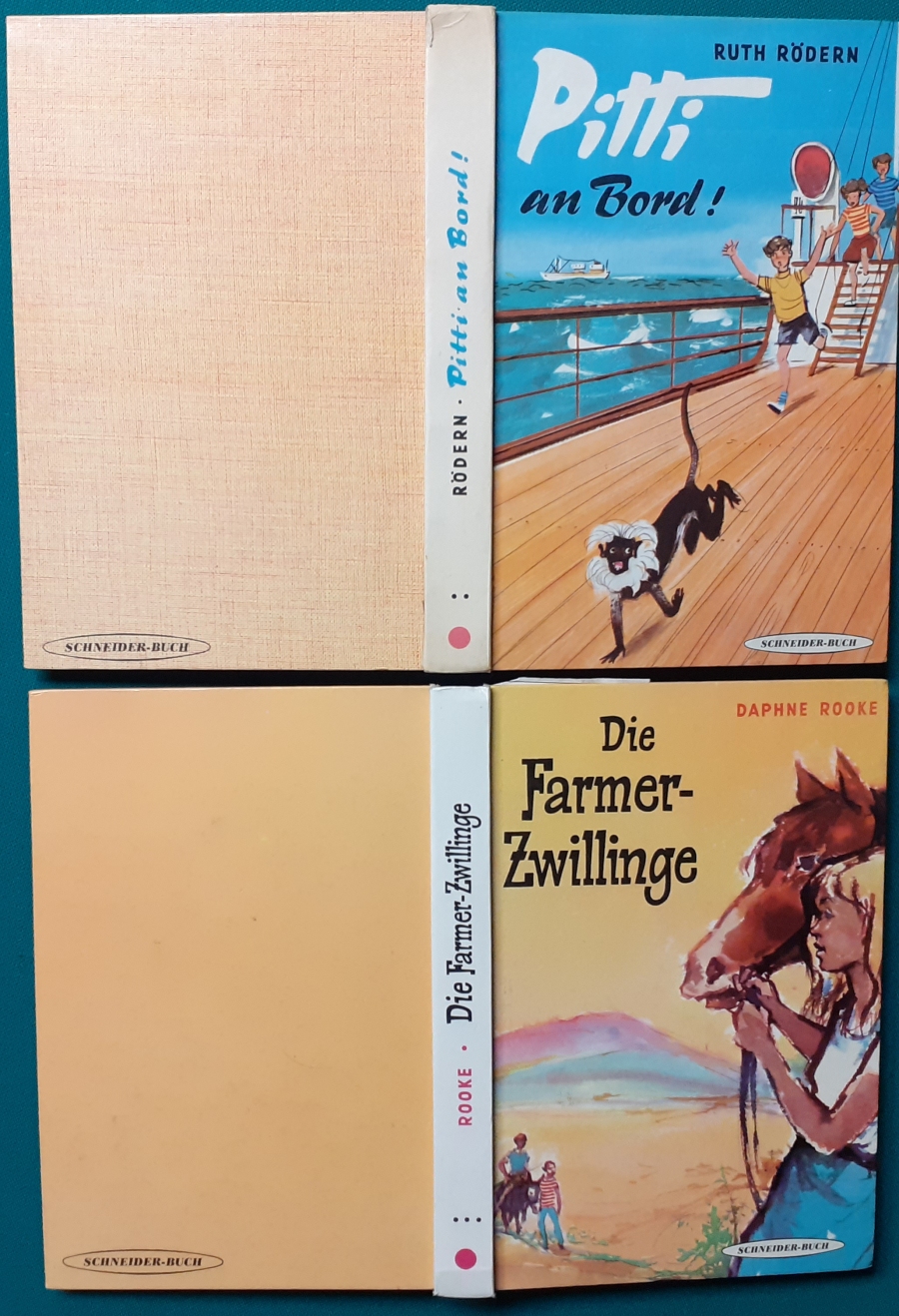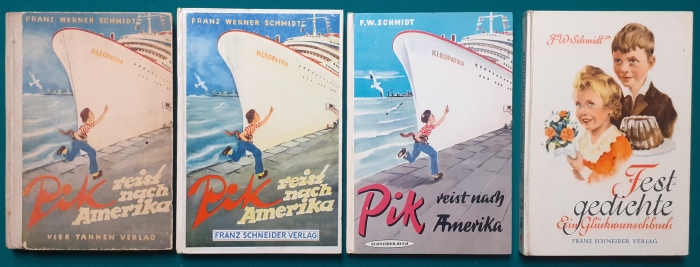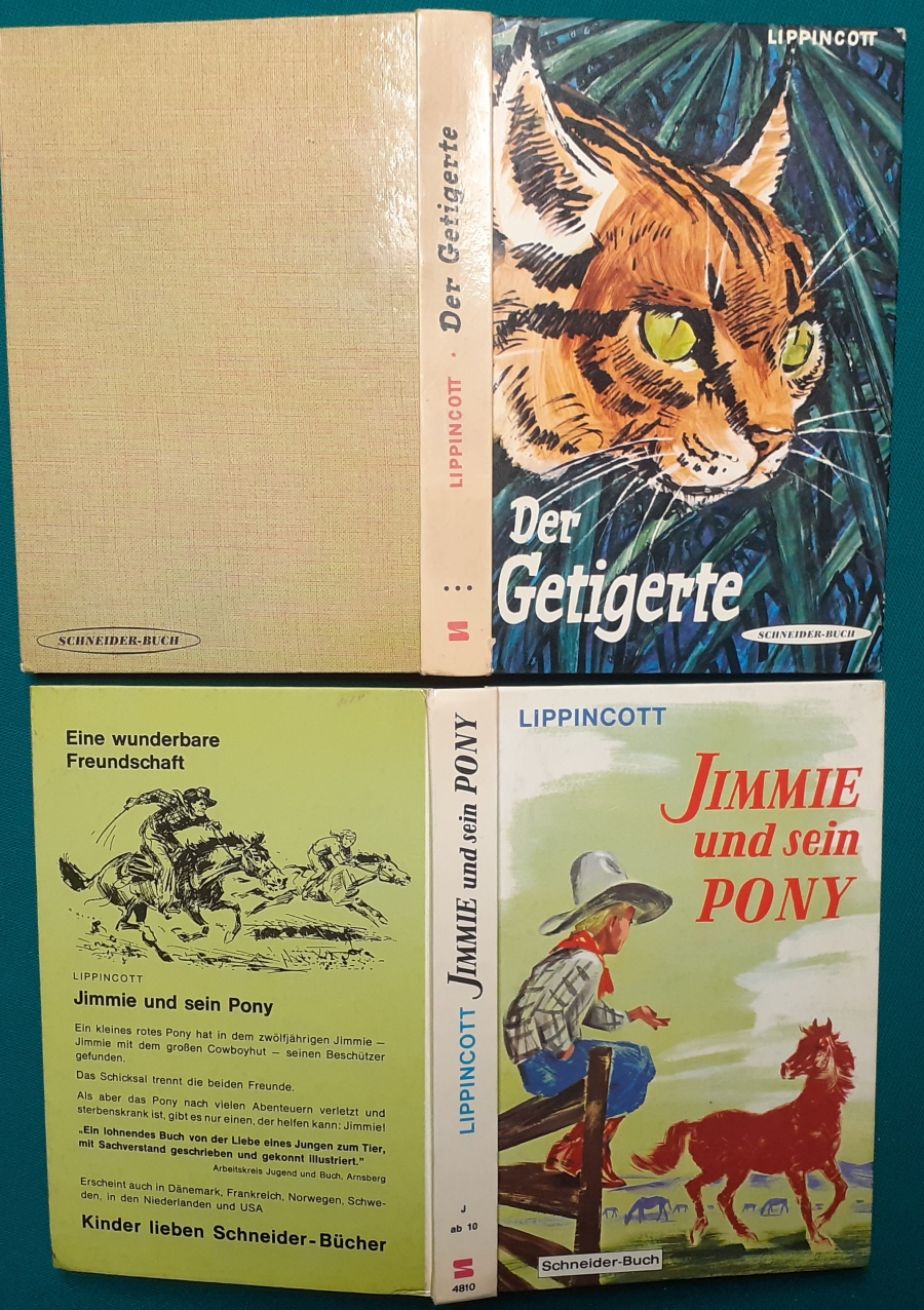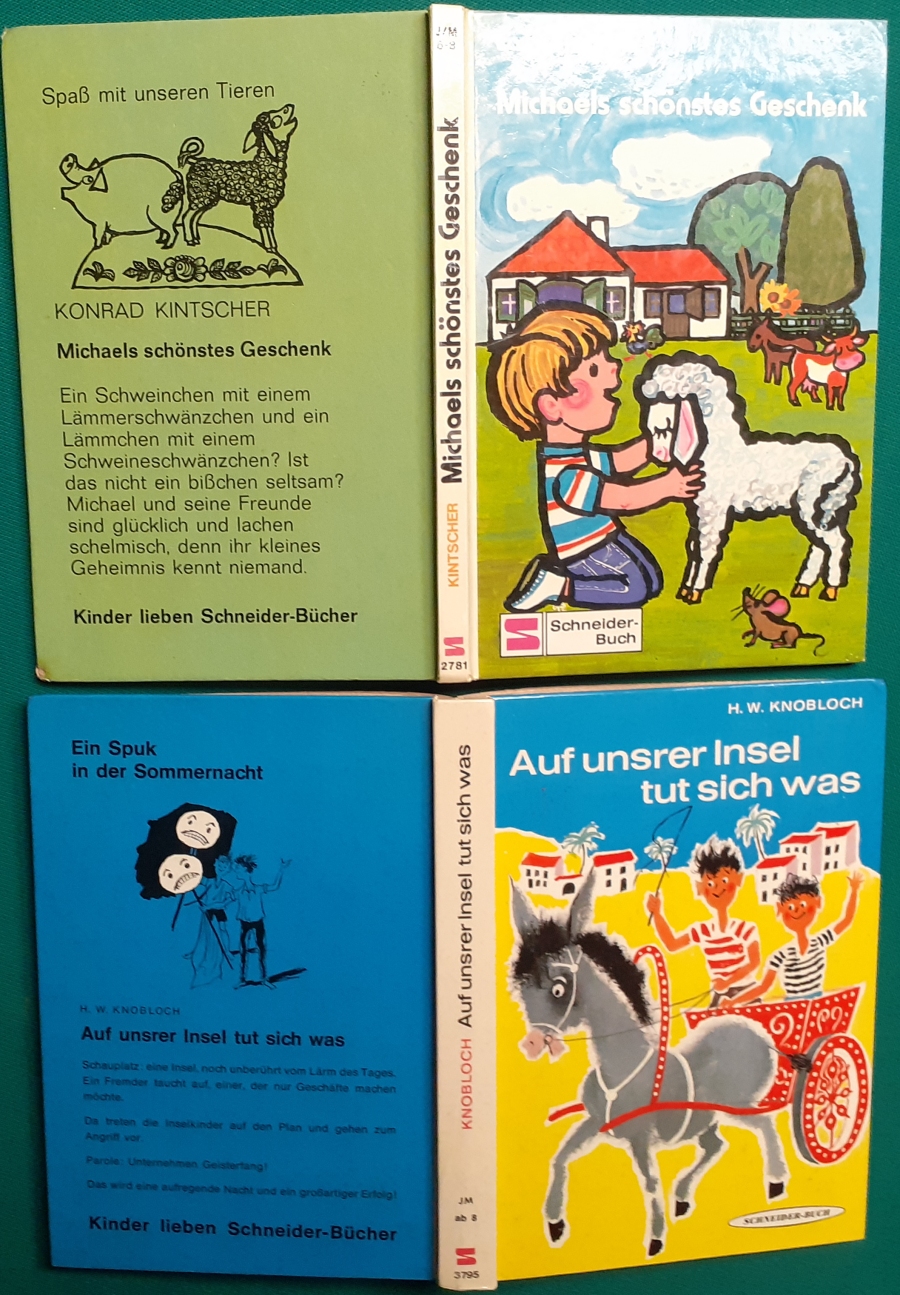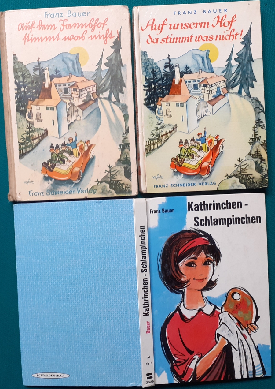 Schneider Verlag: Franz Bauer: Verschiedene Versionen: Links die Original-Ausgabe um 1934: Alter Titel: Auf dem Jannshof stimmt was nicht mit Leinenrücken; 64 Seiten, Illustrationen von Hans Kossatz; im Cover etwas fleckig, auch innen z.T. gelbfleckig; Buchblock im Gelenk etwas gelockert - aber noch alle Seiten fest; am Rücken oben und unten leicht beschädigt; insgesamt aber noch recht guter altersgemäßer Zustand Preis: 8 EUR rechts die Ausgabe um 1952Auf unserem Hof - da stimmt was nicht! 64 Seiten, Illustrationen von Hans Kossatz; guter altersgemäßer Zustand Preis: 9 EUR Hier zur Illustratoren-Galerie mit typischen Arbeiten von Hans Kossatz