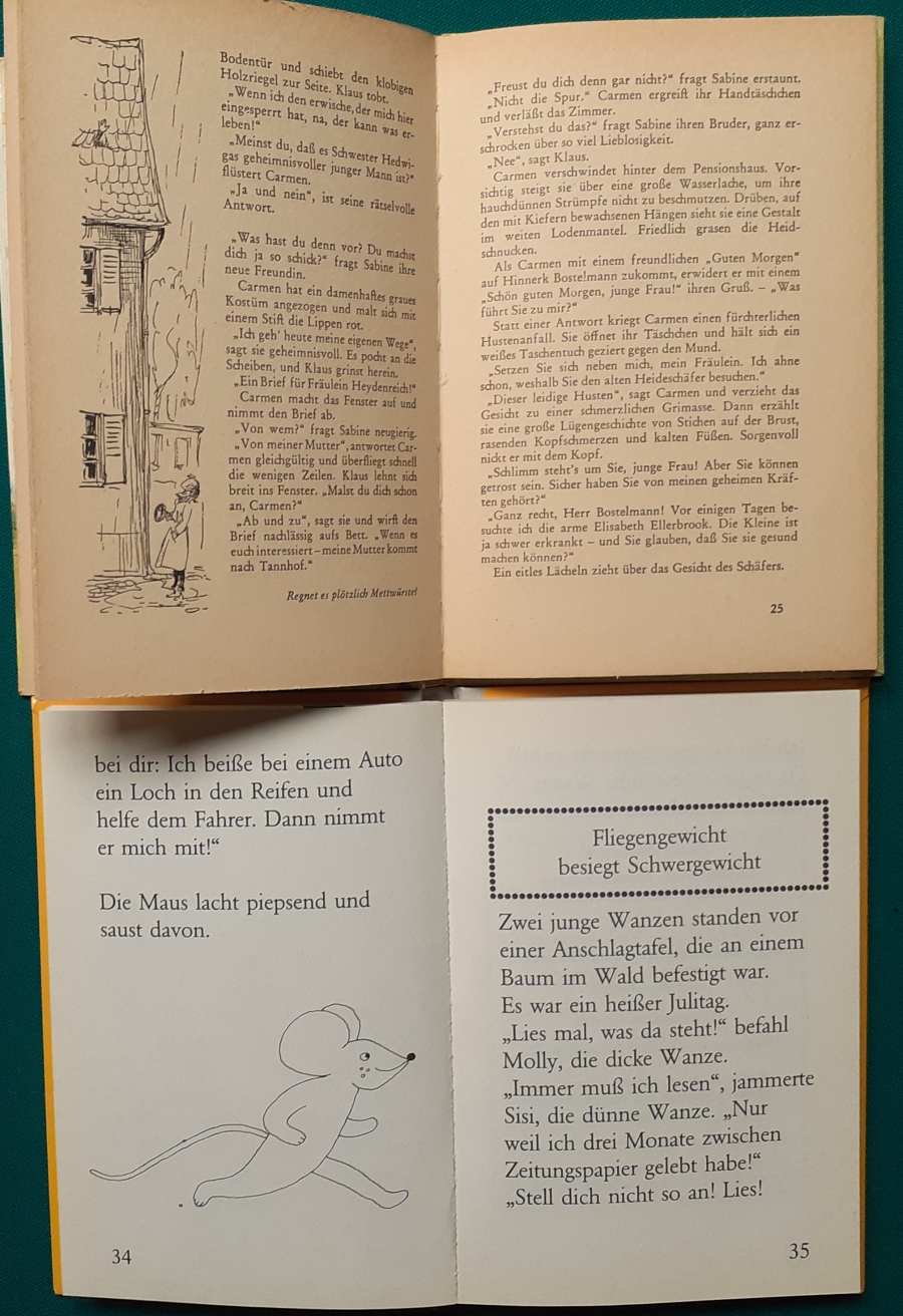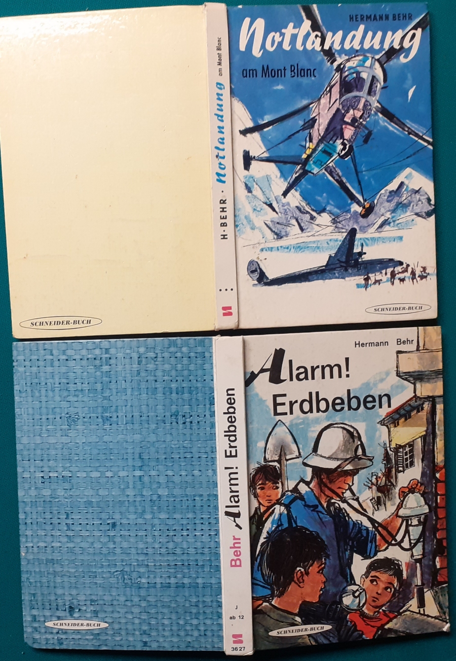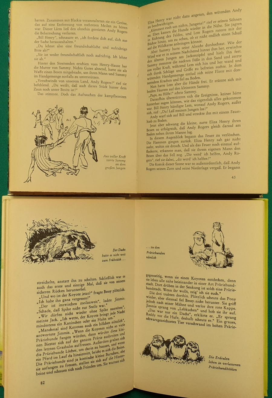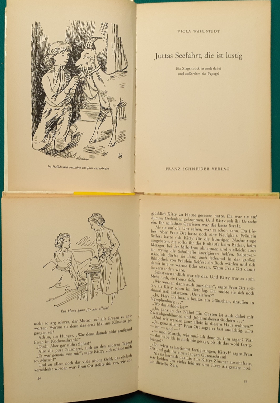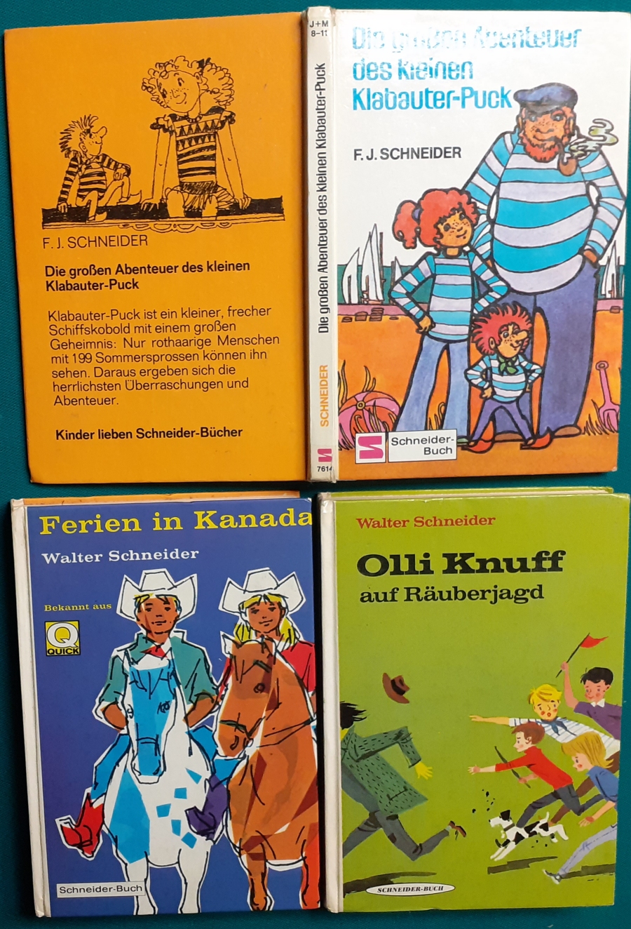 Schneider Verlag: Franz Bauer: Verschiedene Versionen: Links die Original-Ausgabe um 1934: Alter Titel: Auf dem Jannshof stimmt was nicht mit Leinenrücken; 64 Seiten, Illustrationen von Hans Kossatz; im Cover etwas fleckig, auch innen z.T. gelbfleckig; Buchblock im Gelenk etwas gelockert - aber noch alle Seiten fest; am Rücken oben und unten leicht beschädigt; insgesamt aber noch recht guter altersgemäßer Zustand Preis: 8 EUR rechts die Ausgabe um 1952Auf unserem Hof - da stimmt was nicht! 64 Seiten, Illustrationen von Hans Kossatz; guter altersgemäßer Zustand Preis: 9 EUR Hier zur Illustratoren-Galerie mit typischen Arbeiten von Hans Kossatz
