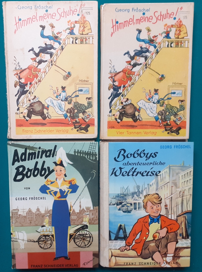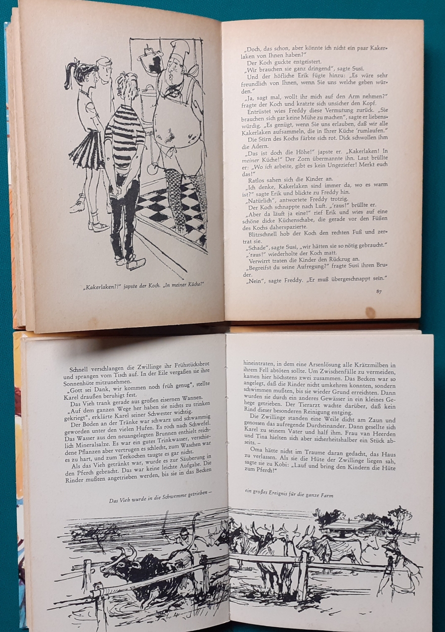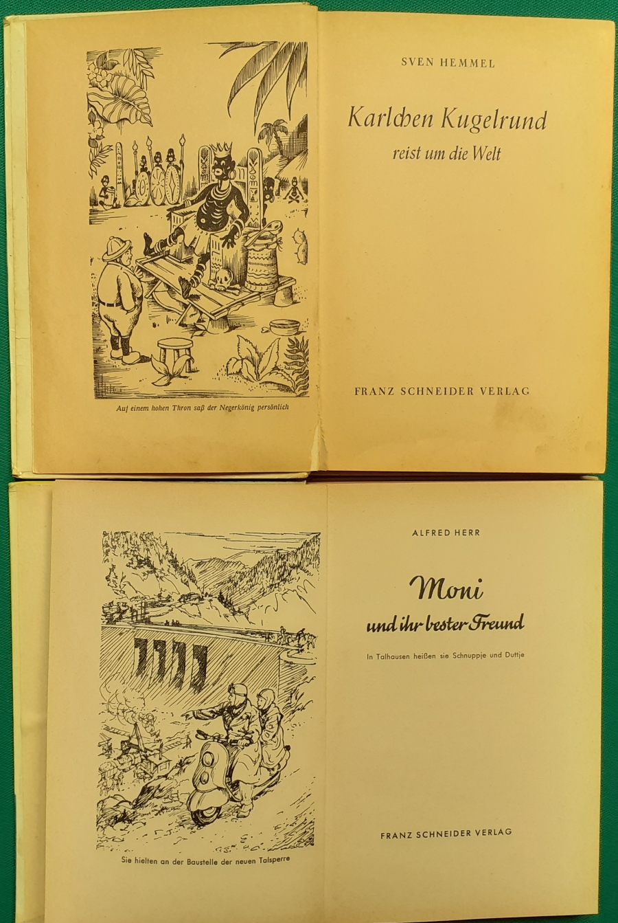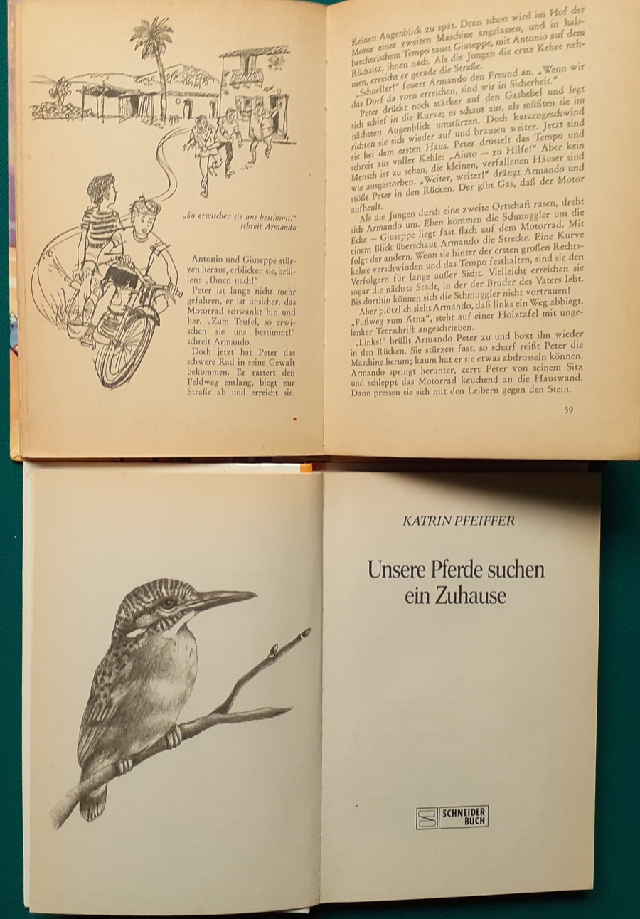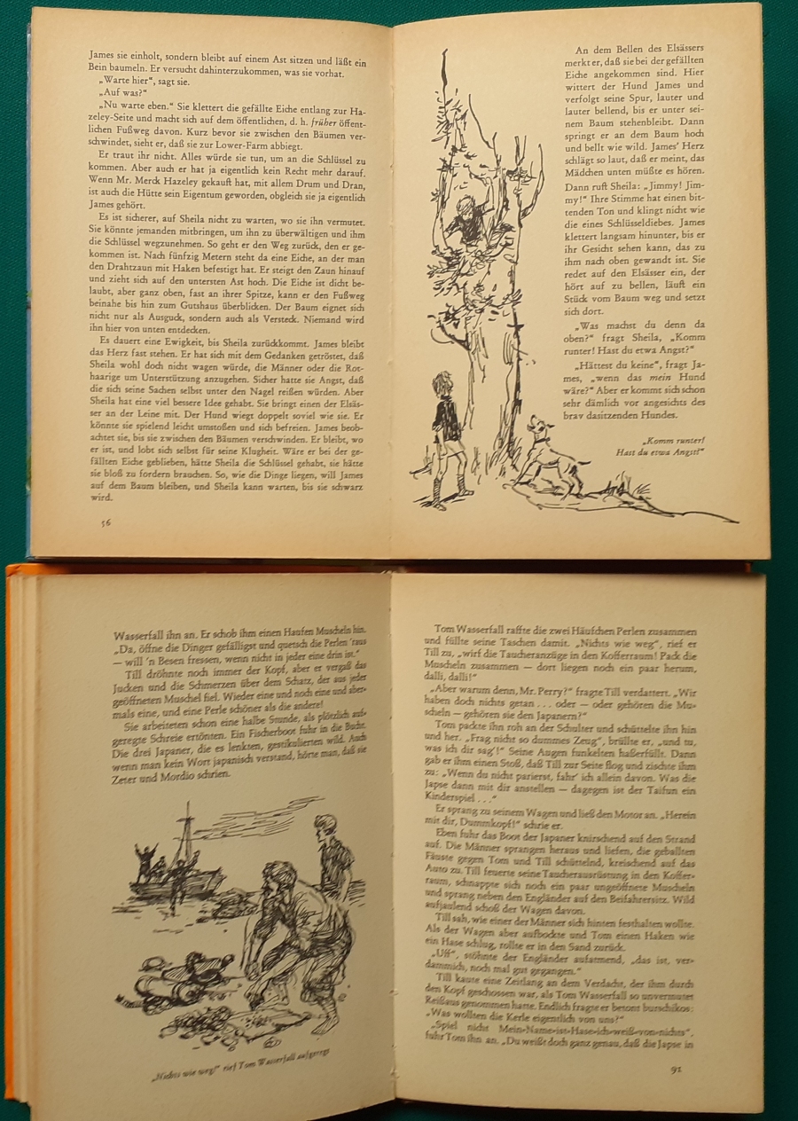 Schneider Verlag: Franz Bauer: Verschiedene Versionen: Links die Original-Ausgabe um 1934: Alter Titel: Auf dem Jannshof stimmt was nicht mit Leinenrücken; 64 Seiten, Illustrationen von Hans Kossatz; im Cover etwas fleckig, auch innen z.T. gelbfleckig; Buchblock im Gelenk etwas gelockert - aber noch alle Seiten fest; am Rücken oben und unten leicht beschädigt; insgesamt aber noch recht guter altersgemäßer Zustand Preis: 8 EUR rechts die Ausgabe um 1952Auf unserem Hof - da stimmt was nicht! 64 Seiten, Illustrationen von Hans Kossatz; guter altersgemäßer Zustand Preis: 9 EUR Hier zur Illustratoren-Galerie mit typischen Arbeiten von Hans Kossatz