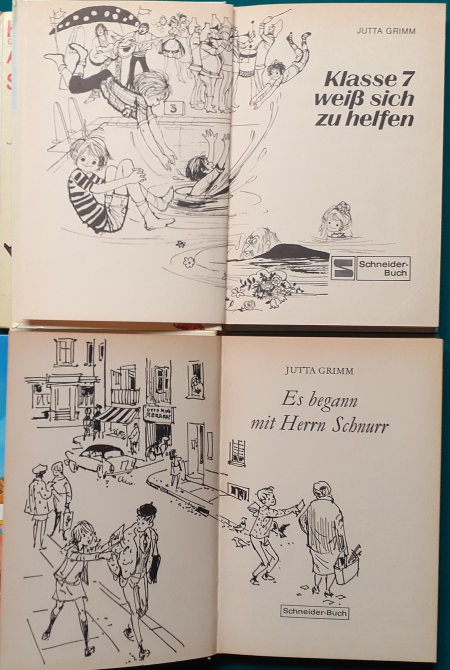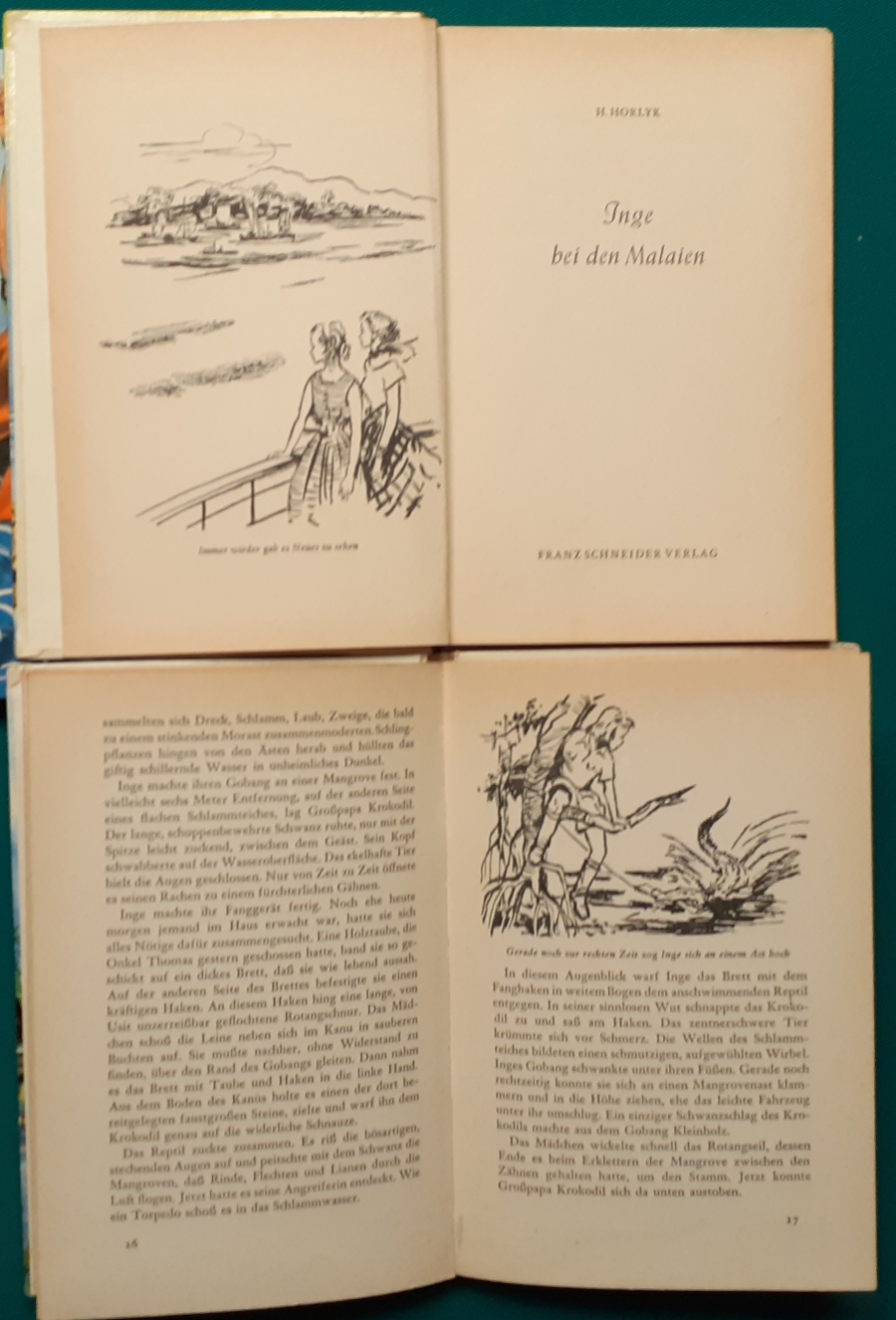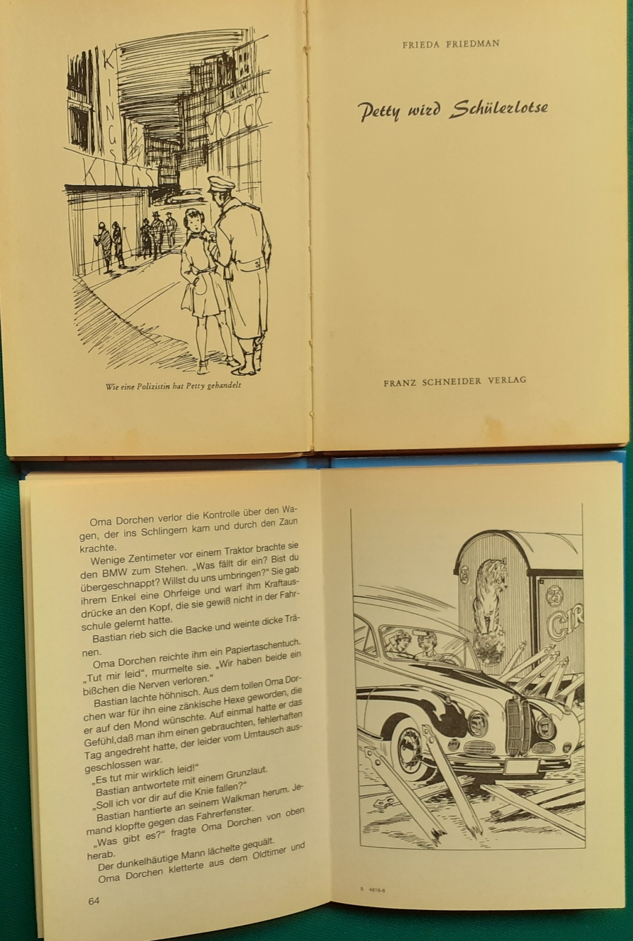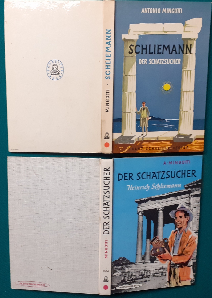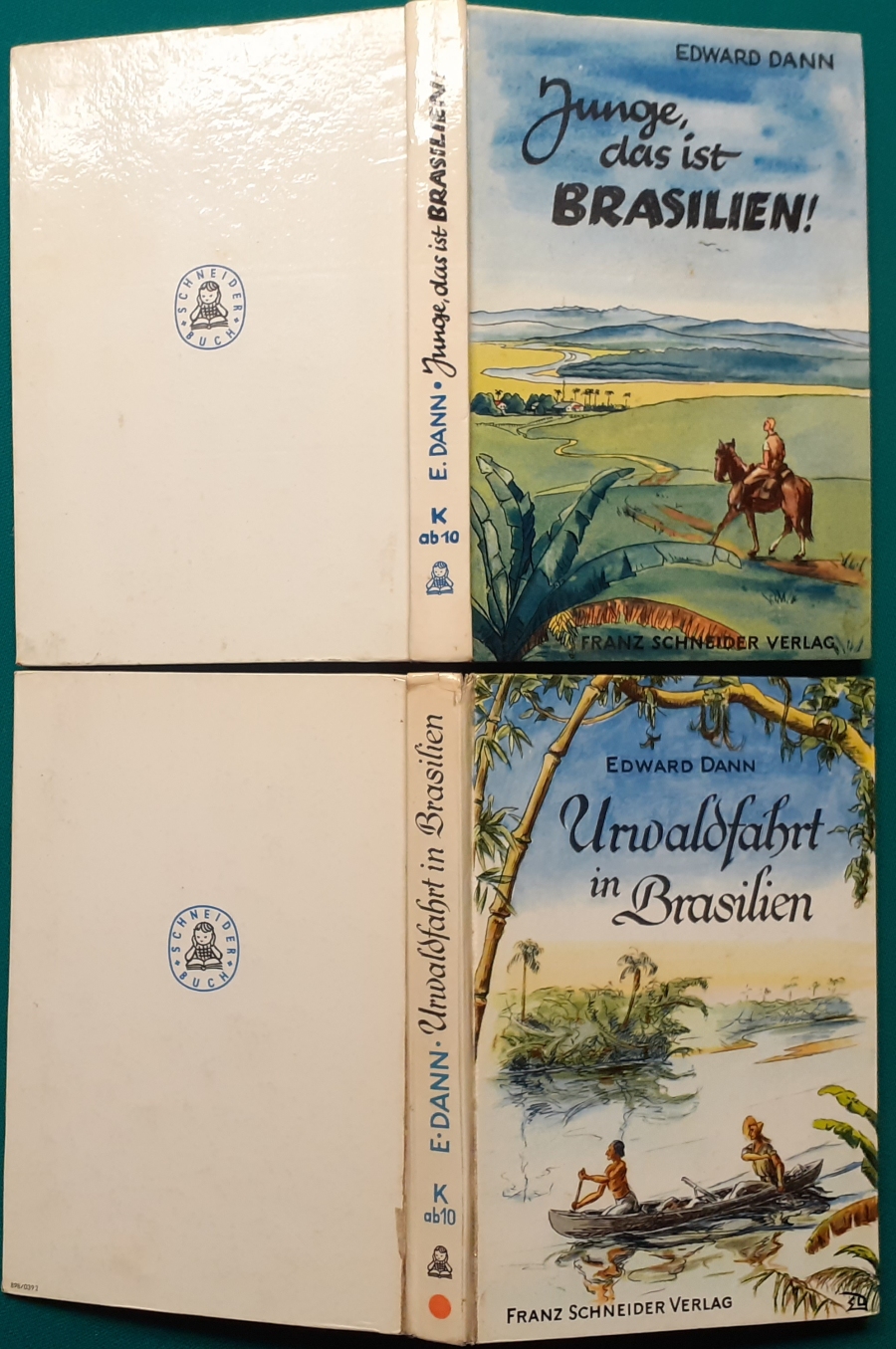 Schneider Verlag: Franz Bauer: Verschiedene Versionen: Links die Original-Ausgabe um 1934: Alter Titel: Auf dem Jannshof stimmt was nicht mit Leinenrücken; 64 Seiten, Illustrationen von Hans Kossatz; im Cover etwas fleckig, auch innen z.T. gelbfleckig; Buchblock im Gelenk etwas gelockert - aber noch alle Seiten fest; am Rücken oben und unten leicht beschädigt; insgesamt aber noch recht guter altersgemäßer Zustand Preis: 8 EUR rechts die Ausgabe um 1952Auf unserem Hof - da stimmt was nicht! 64 Seiten, Illustrationen von Hans Kossatz; guter altersgemäßer Zustand Preis: 9 EUR Hier zur Illustratoren-Galerie mit typischen Arbeiten von Hans Kossatz