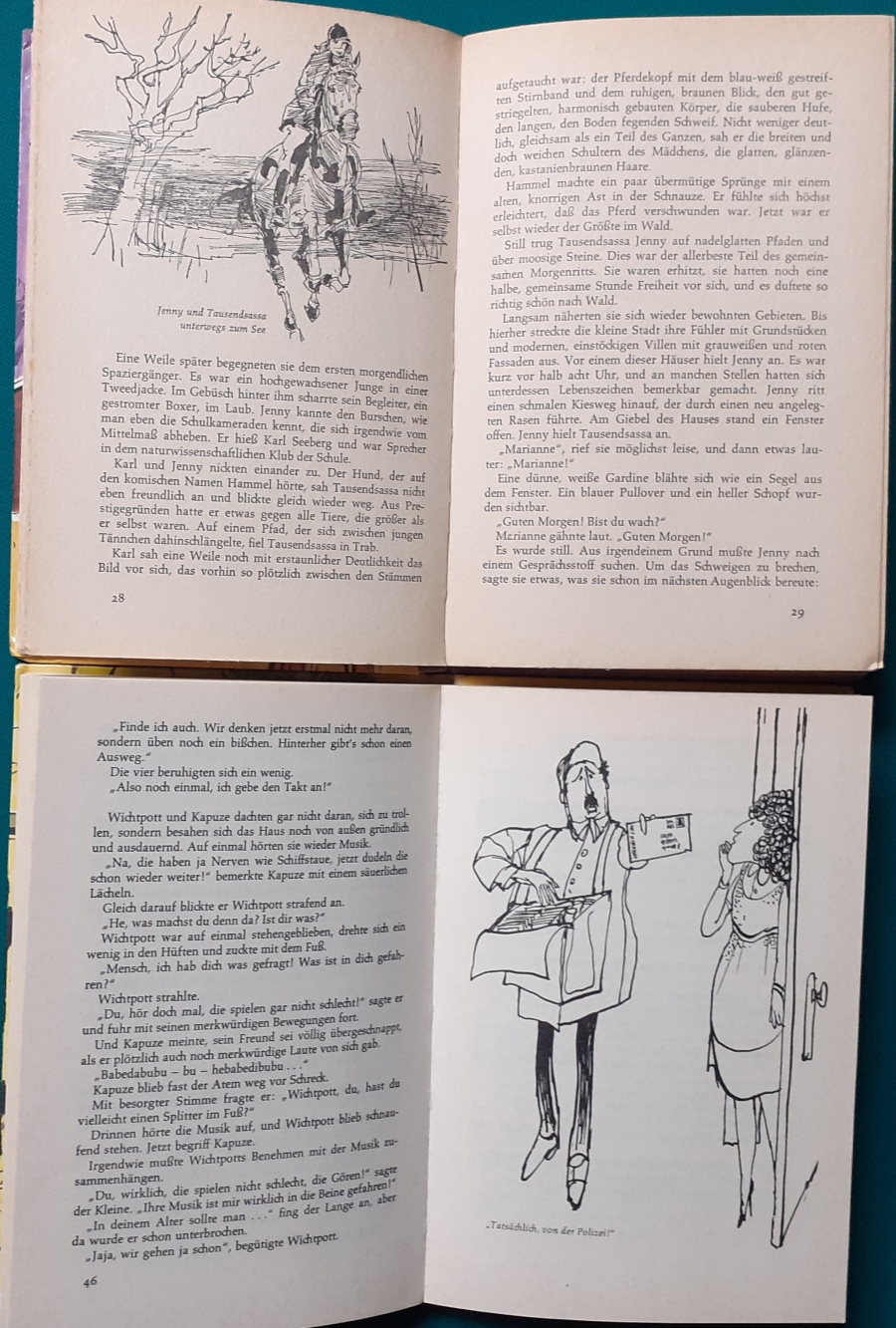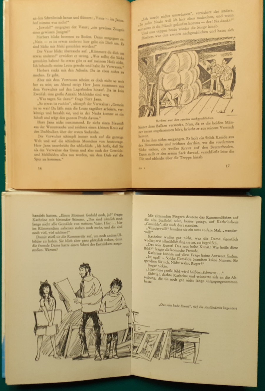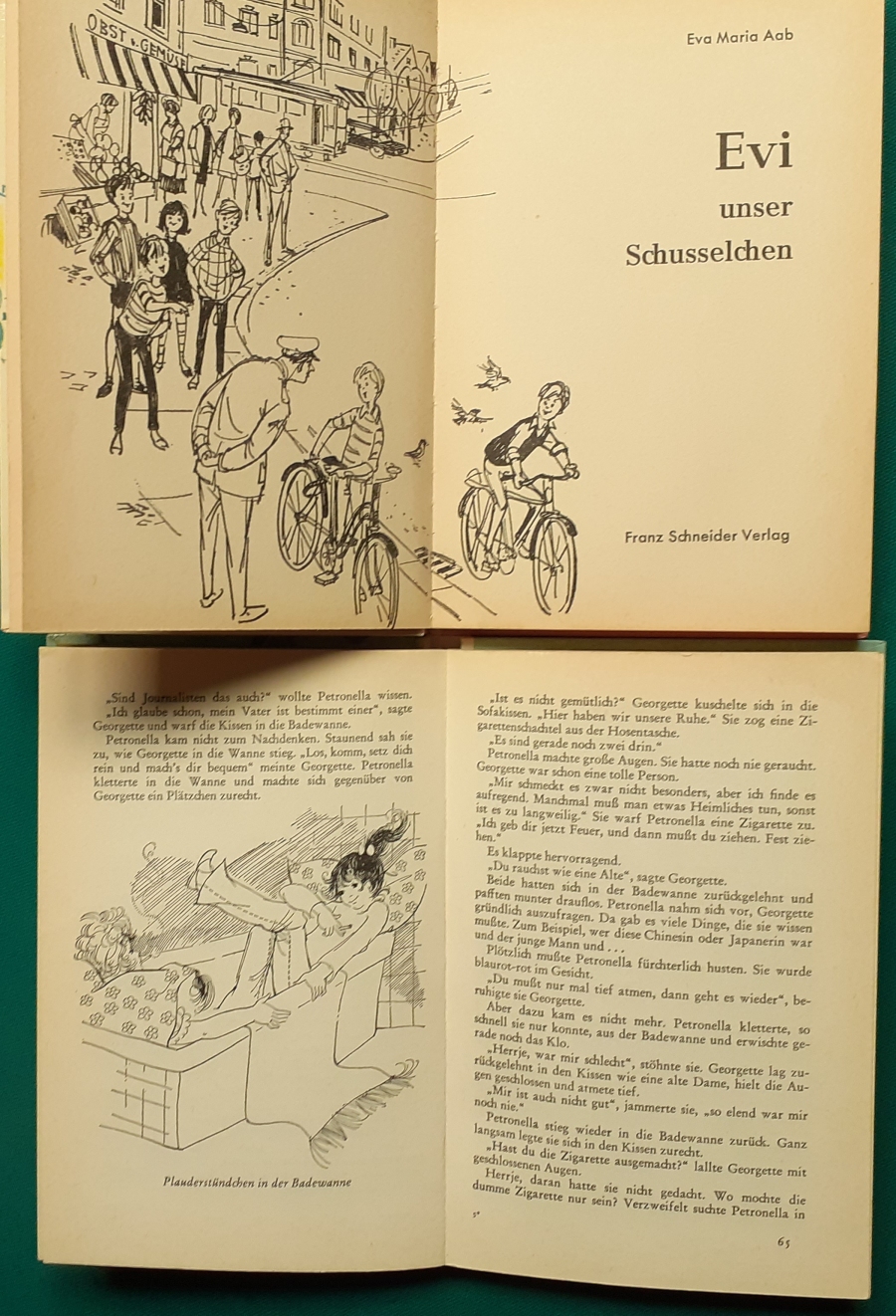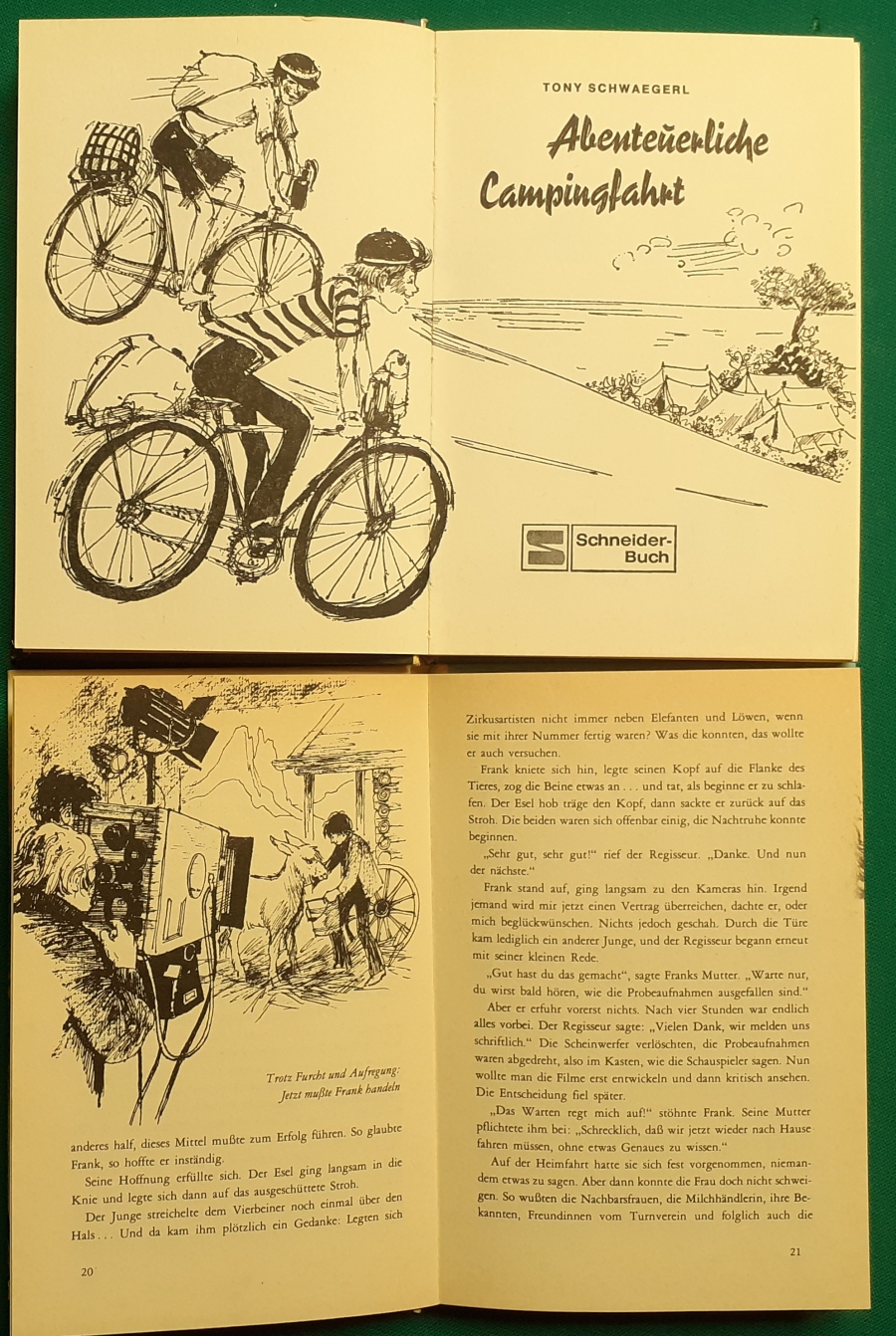 Schneider Verlag: Franz Bauer: Verschiedene Versionen: Links die Original-Ausgabe um 1934: Alter Titel: Auf dem Jannshof stimmt was nicht mit Leinenrücken; 64 Seiten, Illustrationen von Hans Kossatz; im Cover etwas fleckig, auch innen z.T. gelbfleckig; Buchblock im Gelenk etwas gelockert - aber noch alle Seiten fest; am Rücken oben und unten leicht beschädigt; insgesamt aber noch recht guter altersgemäßer Zustand Preis: 8 EUR rechts die Ausgabe um 1952Auf unserem Hof - da stimmt was nicht! 64 Seiten, Illustrationen von Hans Kossatz; guter altersgemäßer Zustand Preis: 9 EUR Hier zur Illustratoren-Galerie mit typischen Arbeiten von Hans Kossatz