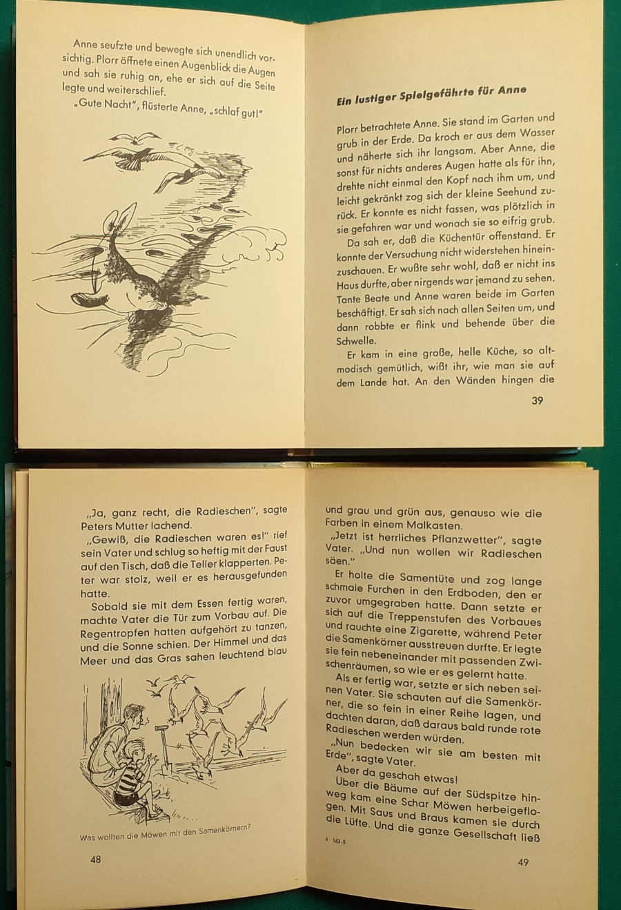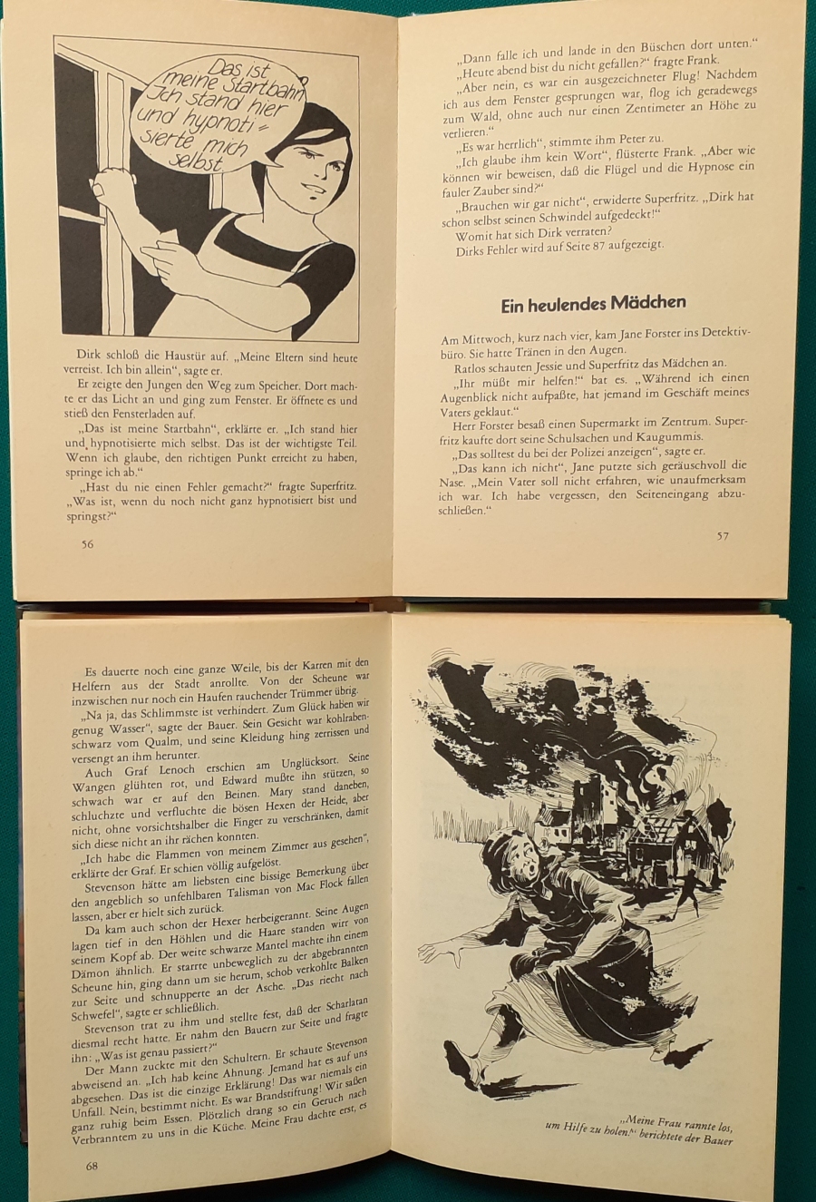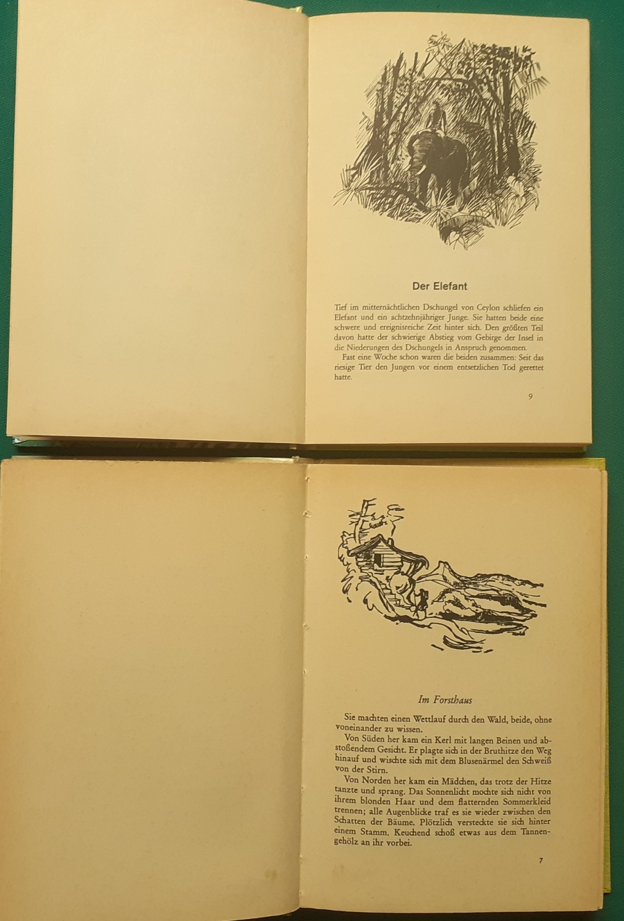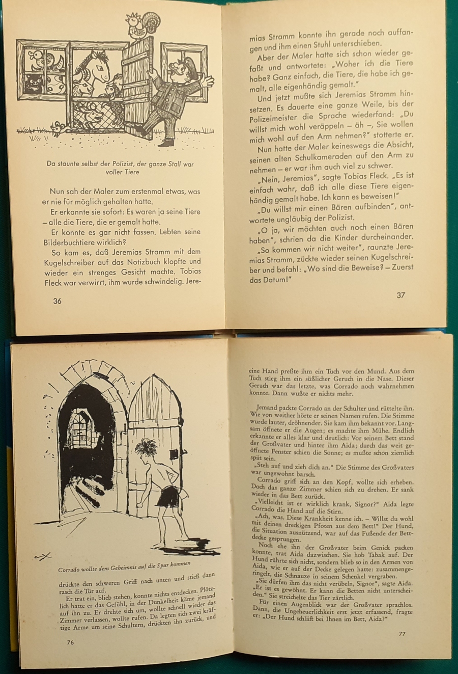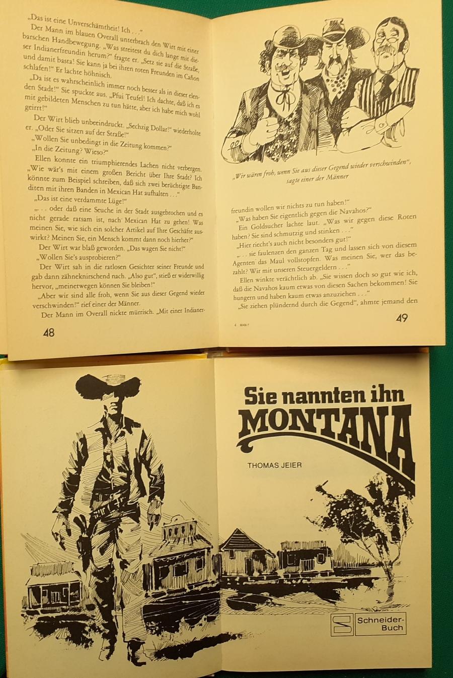 Schneider Verlag: Franz Bauer: Verschiedene Versionen: Links die Original-Ausgabe um 1934: Alter Titel: Auf dem Jannshof stimmt was nicht mit Leinenrücken; 64 Seiten, Illustrationen von Hans Kossatz; im Cover etwas fleckig, auch innen z.T. gelbfleckig; Buchblock im Gelenk etwas gelockert - aber noch alle Seiten fest; am Rücken oben und unten leicht beschädigt; insgesamt aber noch recht guter altersgemäßer Zustand Preis: 8 EUR rechts die Ausgabe um 1952Auf unserem Hof - da stimmt was nicht! 64 Seiten, Illustrationen von Hans Kossatz; guter altersgemäßer Zustand Preis: 9 EUR Hier zur Illustratoren-Galerie mit typischen Arbeiten von Hans Kossatz