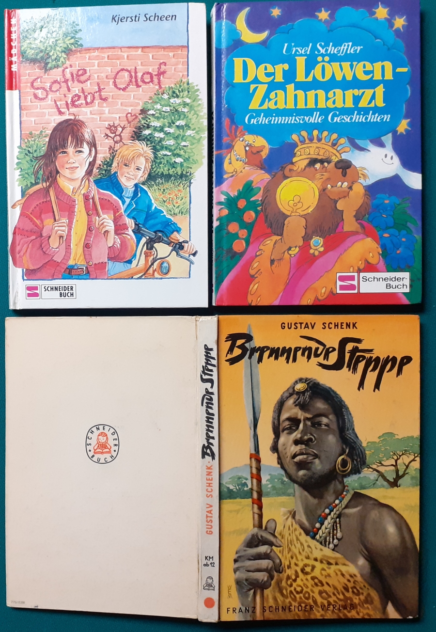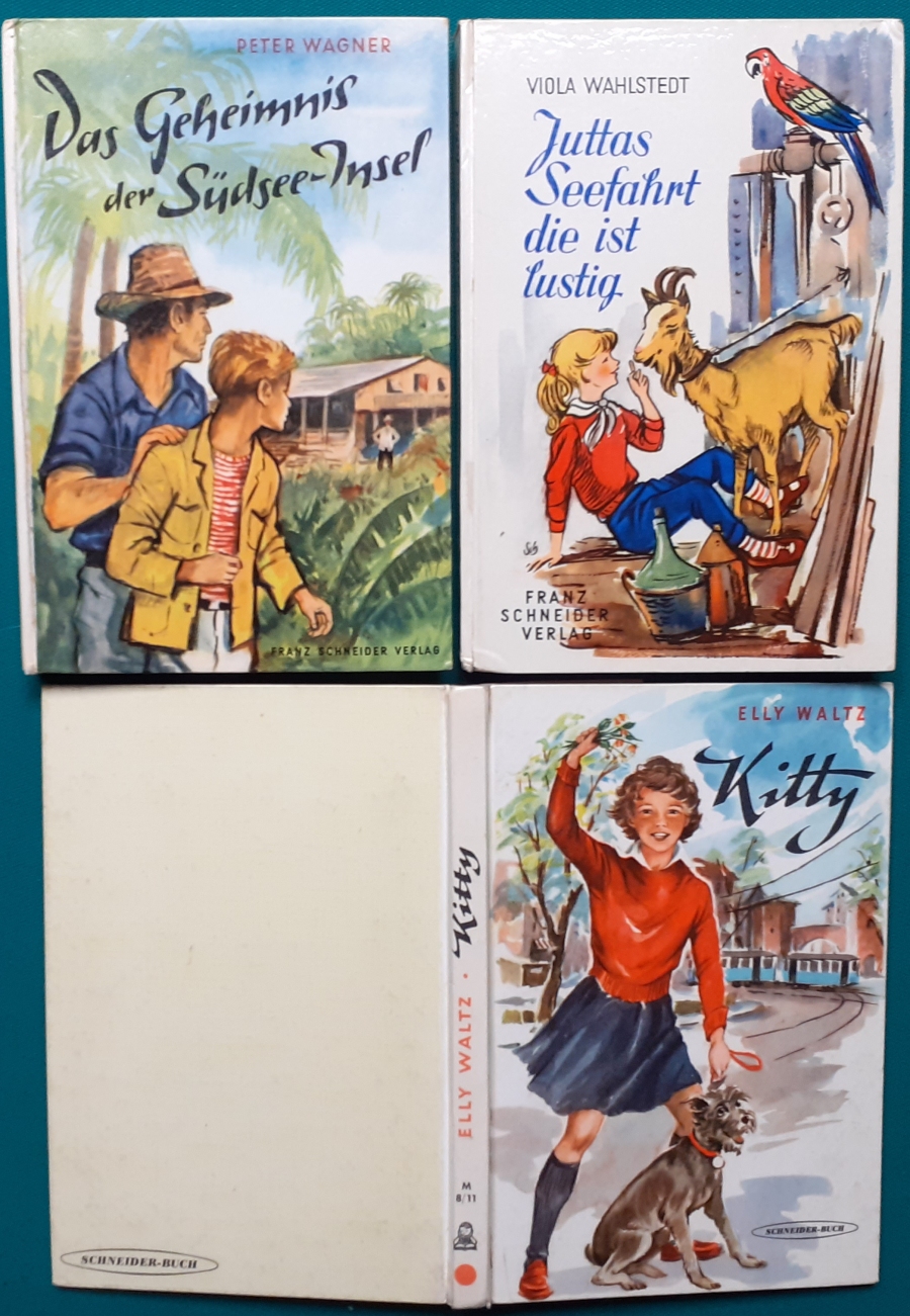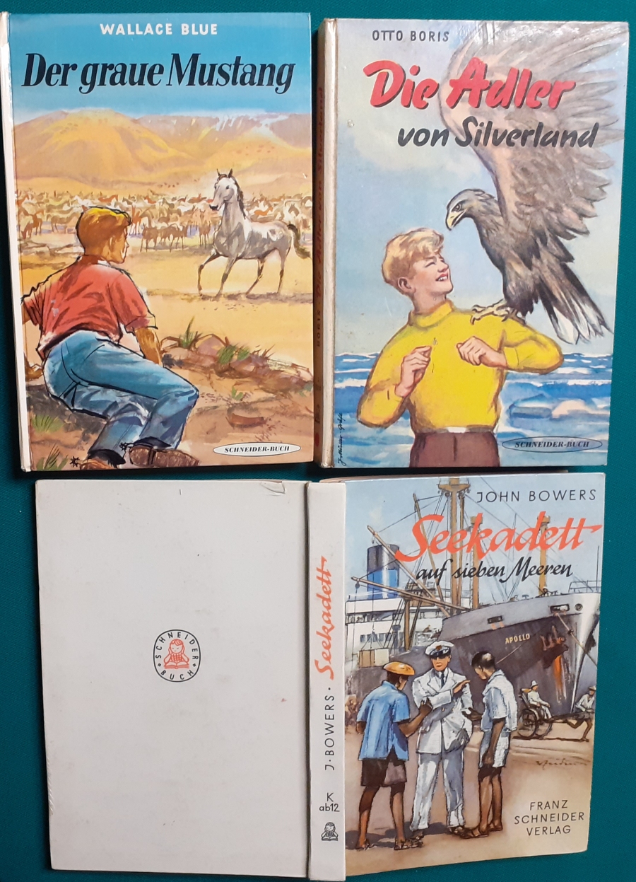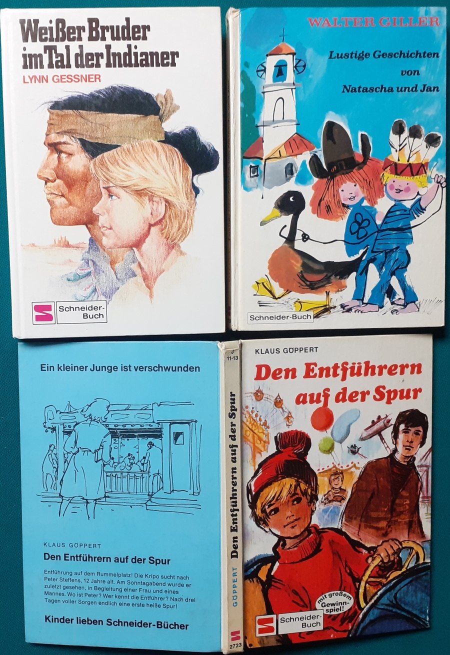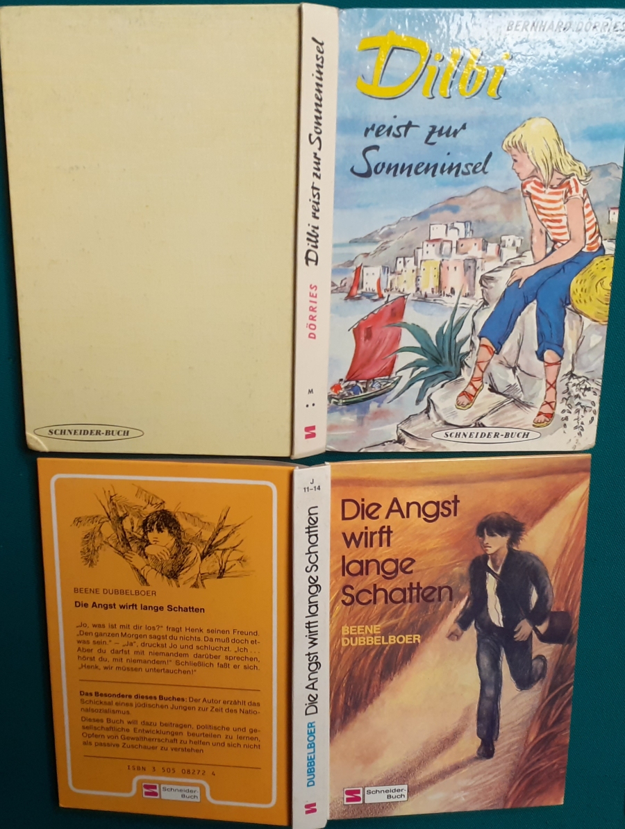 Schneider Verlag: Bernhard Dörries: Dilbi reist zur Sonneninsel 128 Seiten, Illustrationen von Marga Karlson; guter altersgemäßer Zustand Preis: 6 EUR Bernhard Dörries: geb. 1927 in Hannover, Schriftsteller, Drehbuchautor und Regisseur. Hier zur Illustratoren-Galerie mit typischen Arbeiten von Marga Karlson Beene Dubbelboer: Die Angst wirft lange Schatten Illustrationen von Haidrun Gschwind, Ausgabe von 1982, 190 Seiten, guter altersgemäßer Zustand Preis: 6 EURO Beene Dubbelboer; 1906-1982, niederländischer Schriftsteller und Automechaniker Hier zur Illustratoren-Galerie mit typischen Arbeiten von Haidrun Gschwind |