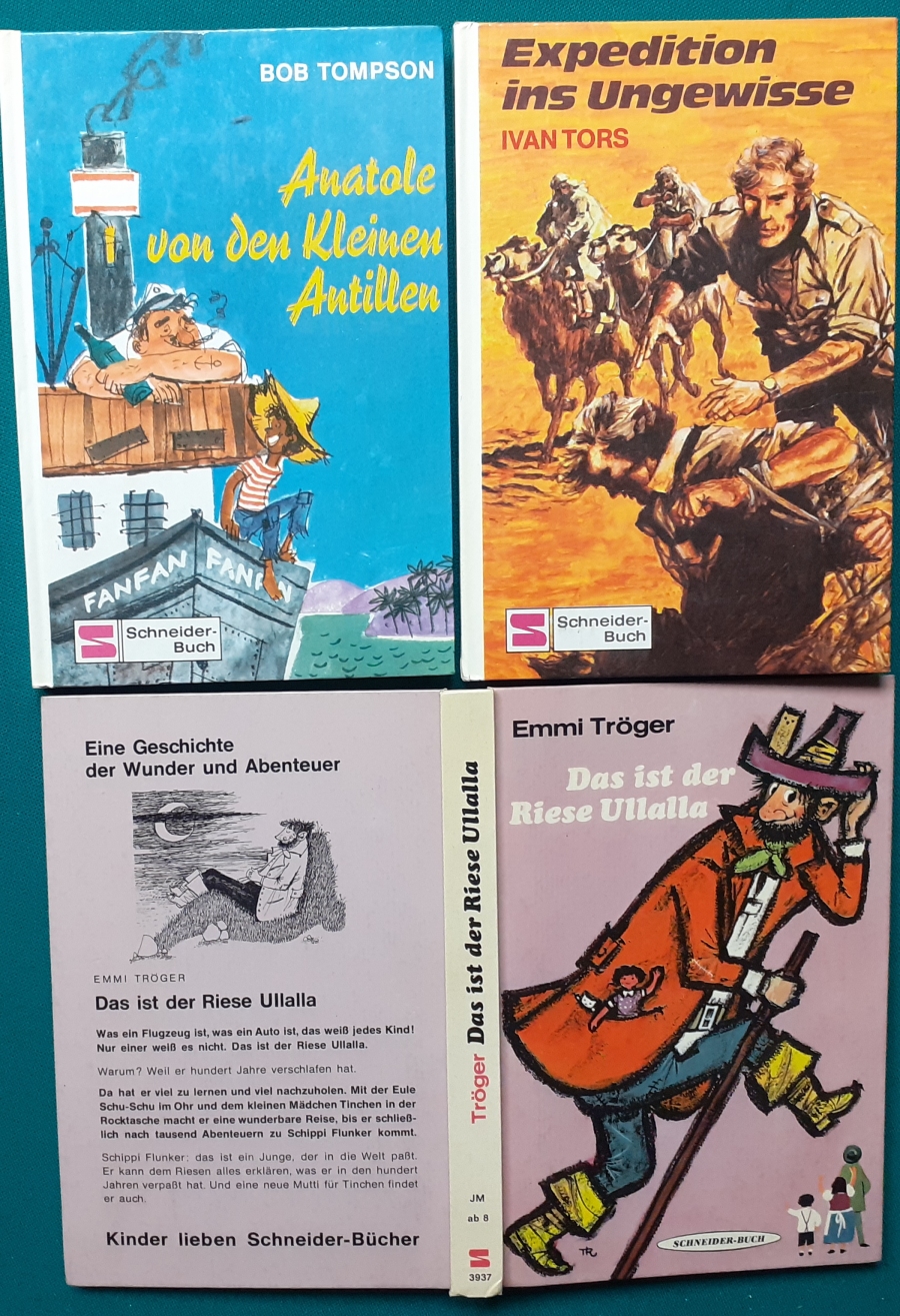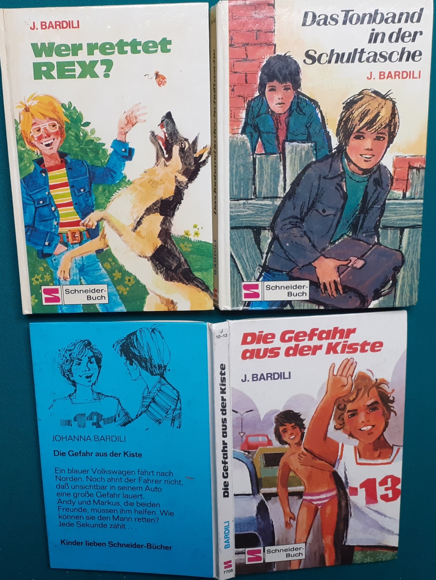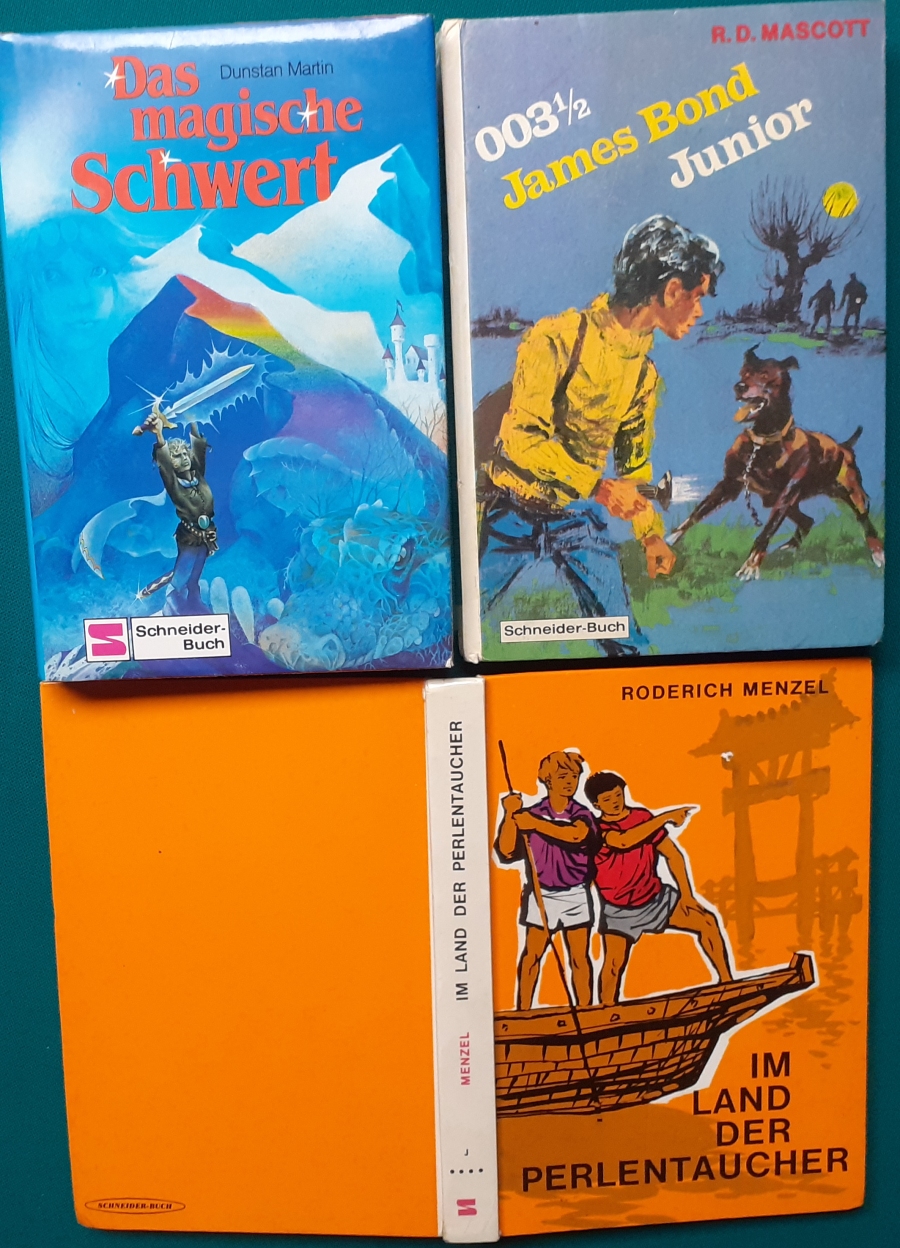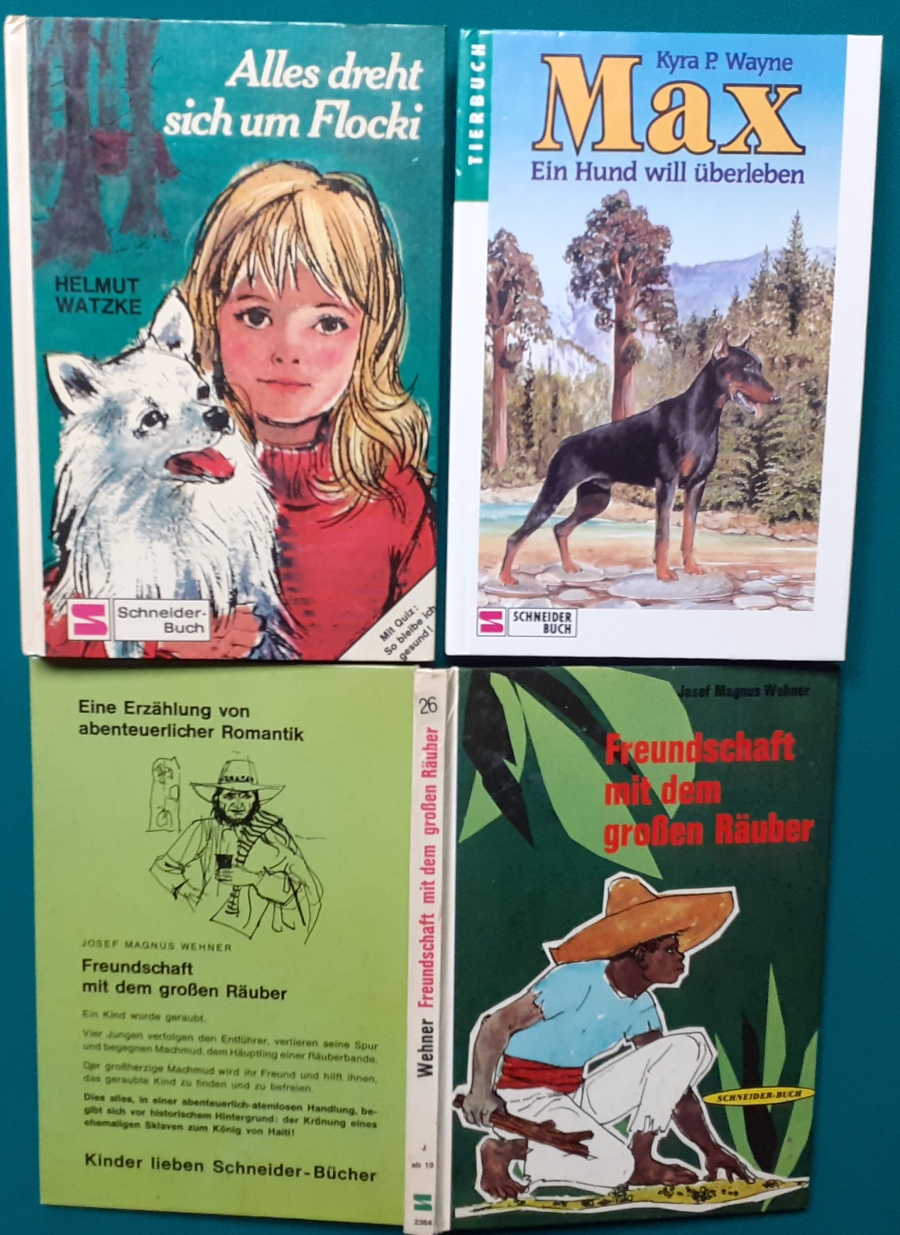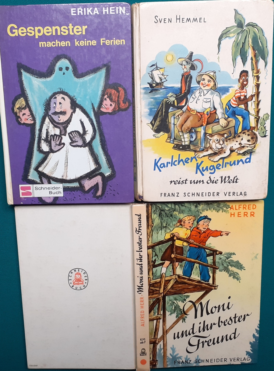 Schneider Verlag: Bernhard Dörries: Dilbi reist zur Sonneninsel 128 Seiten, Illustrationen von Marga Karlson; guter altersgemäßer Zustand Preis: 6 EUR Bernhard Dörries: geb. 1927 in Hannover, Schriftsteller, Drehbuchautor und Regisseur. Hier zur Illustratoren-Galerie mit typischen Arbeiten von Marga Karlson Beene Dubbelboer: Die Angst wirft lange Schatten Illustrationen von Haidrun Gschwind, Ausgabe von 1982, 190 Seiten, guter altersgemäßer Zustand Preis: 6 EURO Beene Dubbelboer; 1906-1982, niederländischer Schriftsteller und Automechaniker Hier zur Illustratoren-Galerie mit typischen Arbeiten von Haidrun Gschwind |