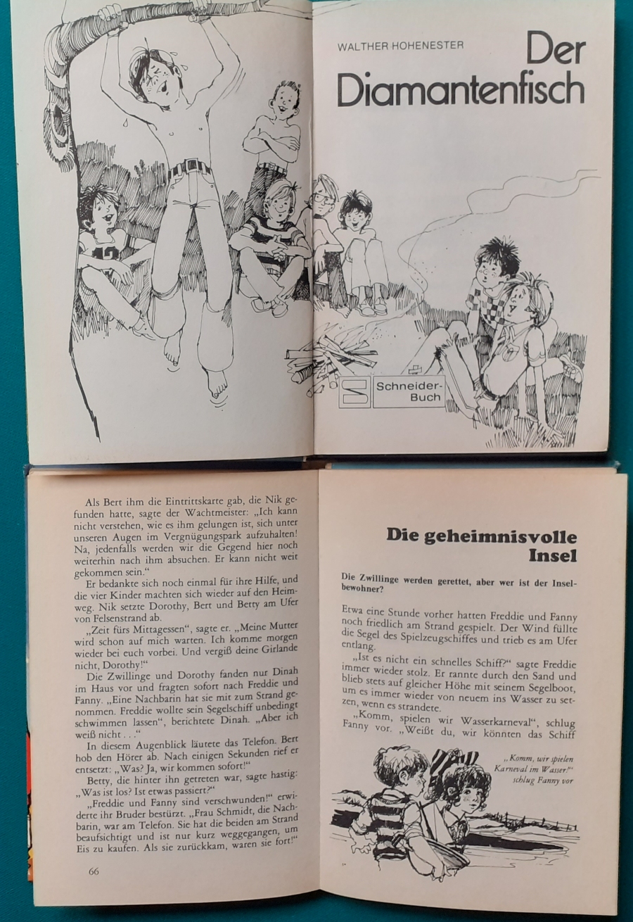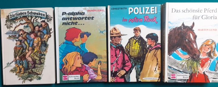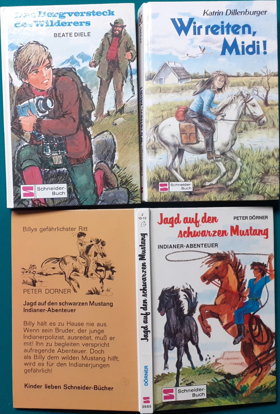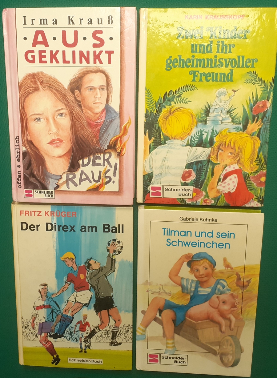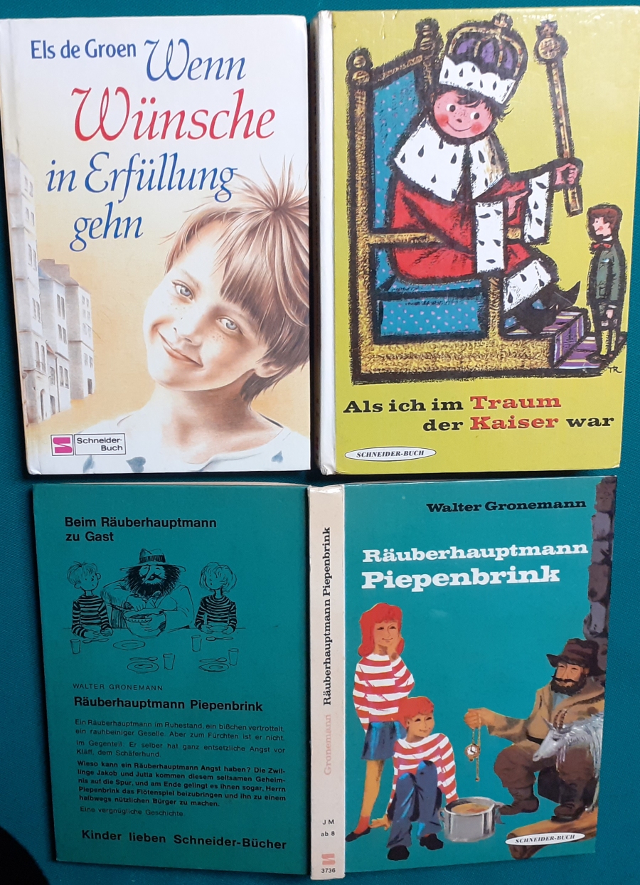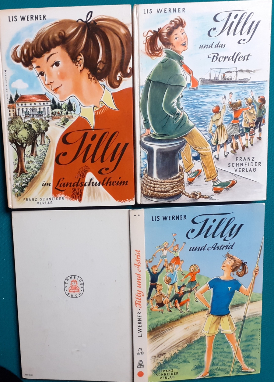Schneider Verlag: Bernhard Dörries: Dilbi reist zur Sonneninsel 128 Seiten, Illustrationen von Marga Karlson; guter altersgemäßer Zustand Preis: 6 EUR Bernhard Dörries: geb. 1927 in Hannover, Schriftsteller, Drehbuchautor und Regisseur. Hier zur Illustratoren-Galerie mit typischen Arbeiten von Marga Karlson Beene Dubbelboer: Die Angst wirft lange Schatten Illustrationen von Haidrun Gschwind, Ausgabe von 1982, 190 Seiten, guter altersgemäßer Zustand Preis: 6 EURO Beene Dubbelboer; 1906-1982, niederländischer Schriftsteller und Automechaniker Hier zur Illustratoren-Galerie mit typischen Arbeiten von Haidrun Gschwind |