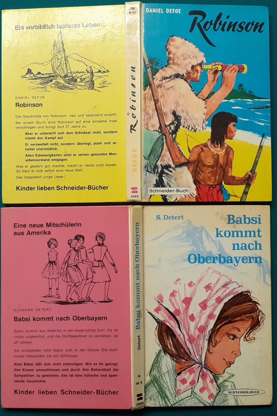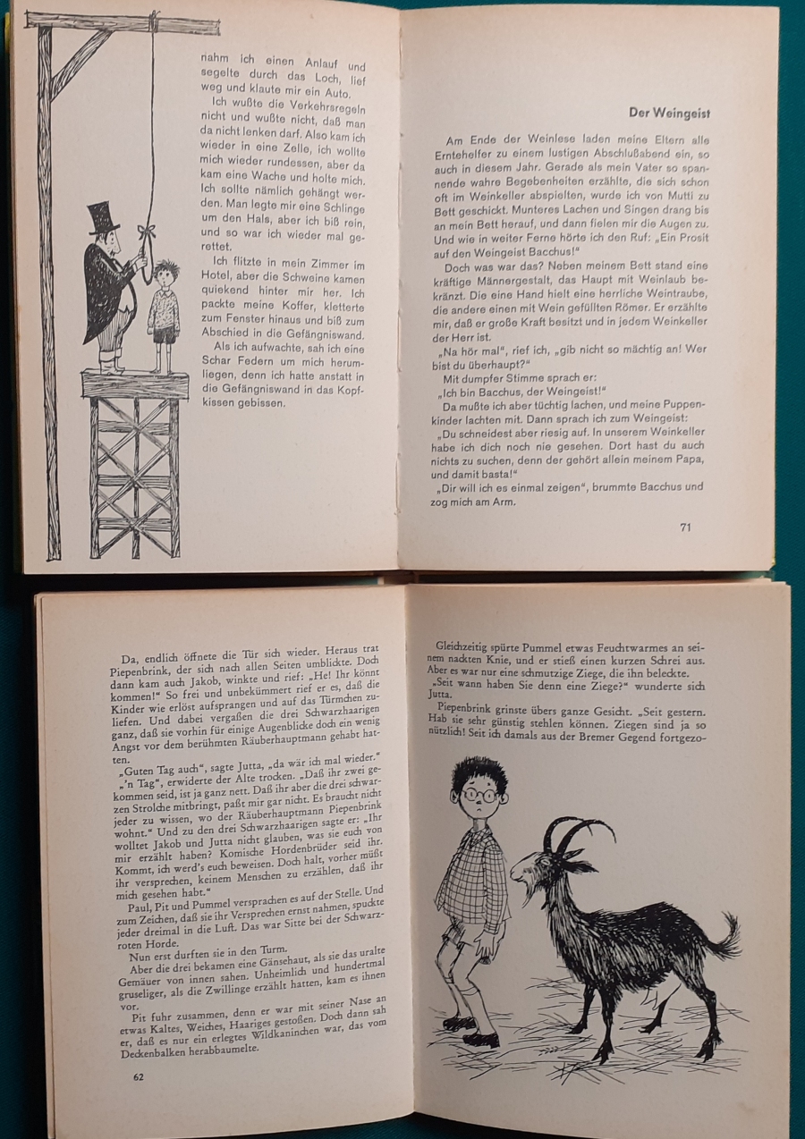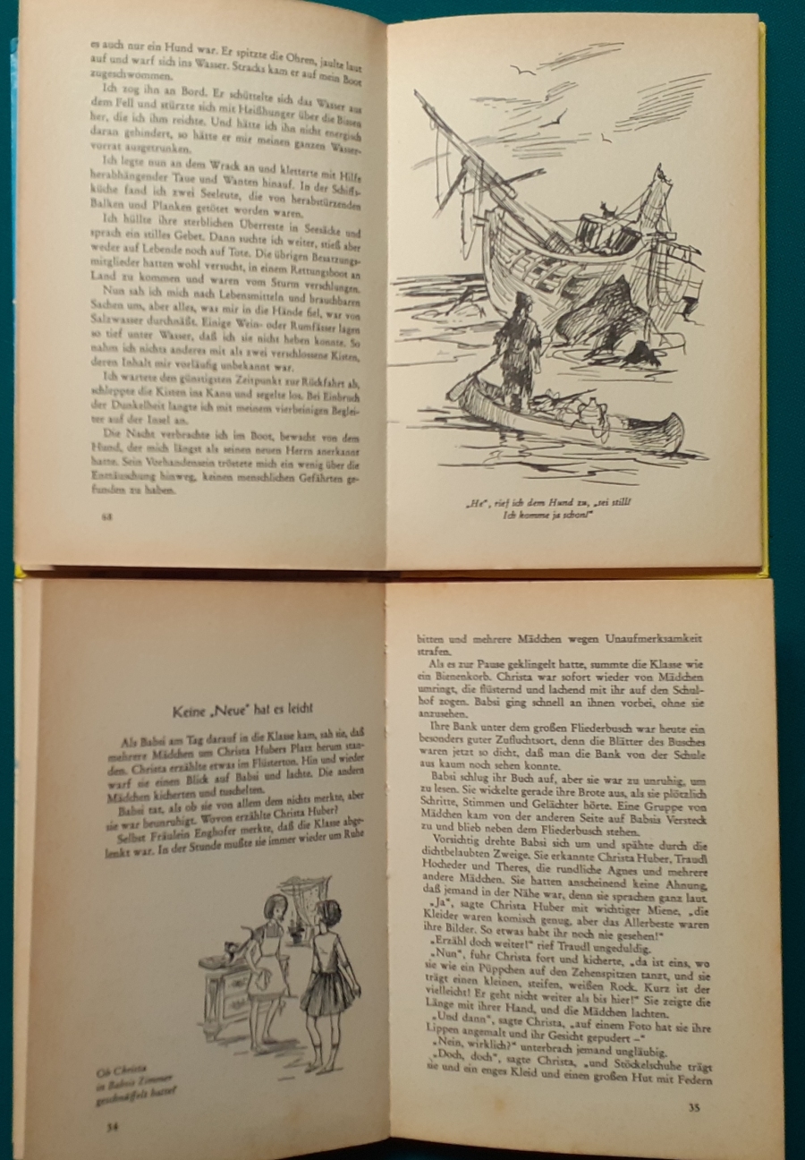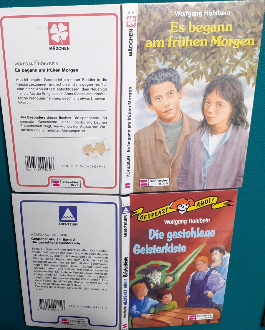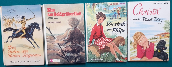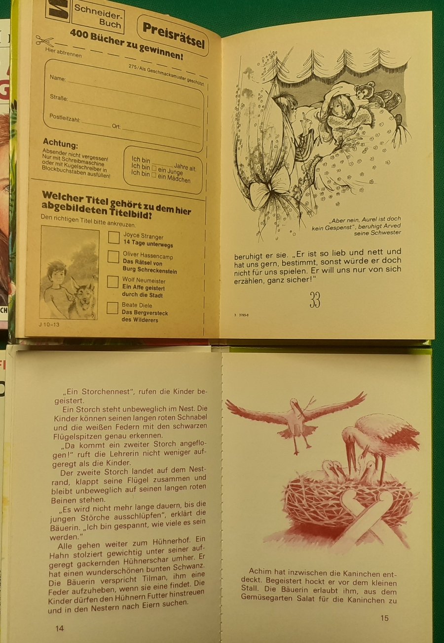 Schneider Verlag: Bernhard Dörries: Dilbi reist zur Sonneninsel 128 Seiten, Illustrationen von Marga Karlson; guter altersgemäßer Zustand Preis: 6 EUR Bernhard Dörries: geb. 1927 in Hannover, Schriftsteller, Drehbuchautor und Regisseur. Hier zur Illustratoren-Galerie mit typischen Arbeiten von Marga Karlson Beene Dubbelboer: Die Angst wirft lange Schatten Illustrationen von Haidrun Gschwind, Ausgabe von 1982, 190 Seiten, guter altersgemäßer Zustand Preis: 6 EURO Beene Dubbelboer; 1906-1982, niederländischer Schriftsteller und Automechaniker Hier zur Illustratoren-Galerie mit typischen Arbeiten von Haidrun Gschwind |