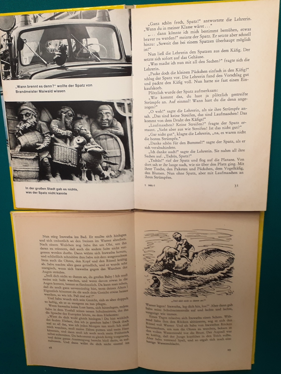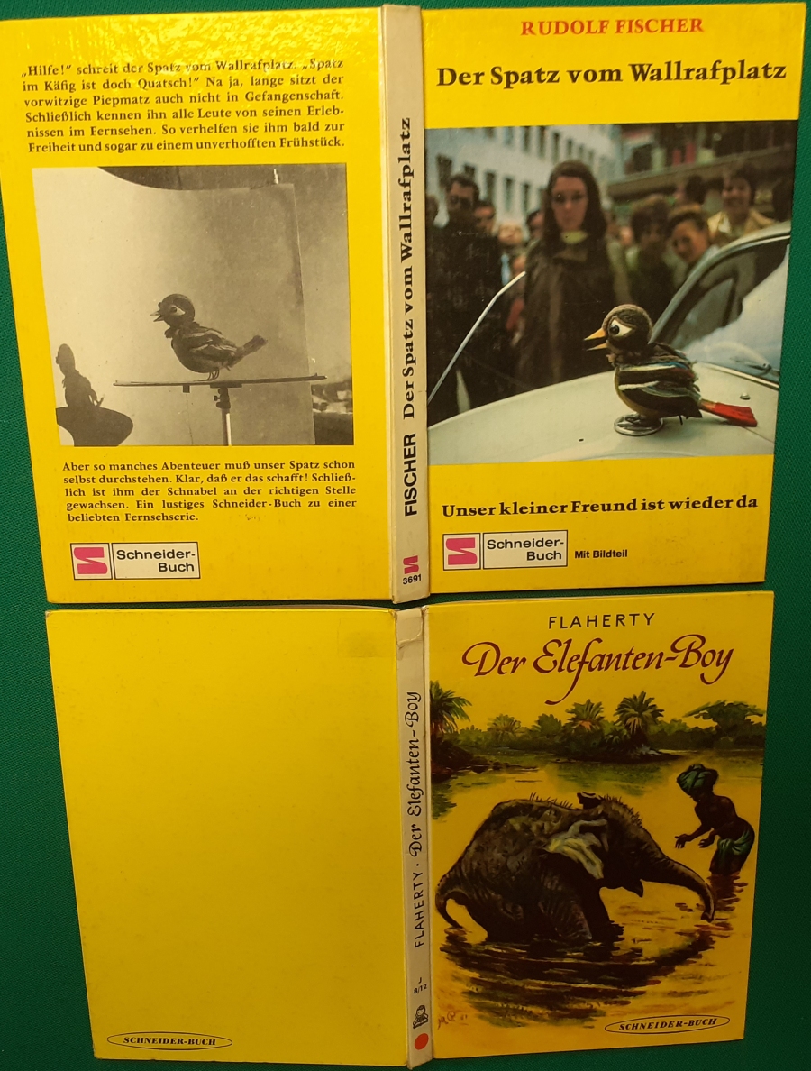 Schneider Verlag: Rudolf Fischer: Der Spatz vom Wallrafplatz Unser kleiner Freund ist wieder da Ausgabe von 1971; 100 Seiten, Illustrationen von Werner Heymann, sehr guter altersgemäßer Zustand Preis: 6 EUR Hier zur Illustratoren-Galerie mit typischen Arbeiten von Werner Heymann Frances Flaherty: Der Elefanten-Boy Abenteuer des kleinen Sabu im Dschungel Ausgabe um 1955; 64 Seiten, Illustrationen von Moritz Pathé, guter altersgemäßer Zustand Preis: 6 EUR Hier zur Illustratoren-Galerie mit typischen Arbeiten von Moritz Pathé |