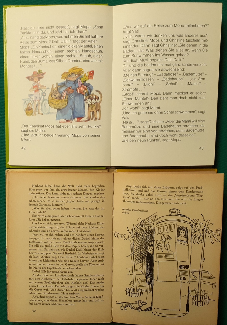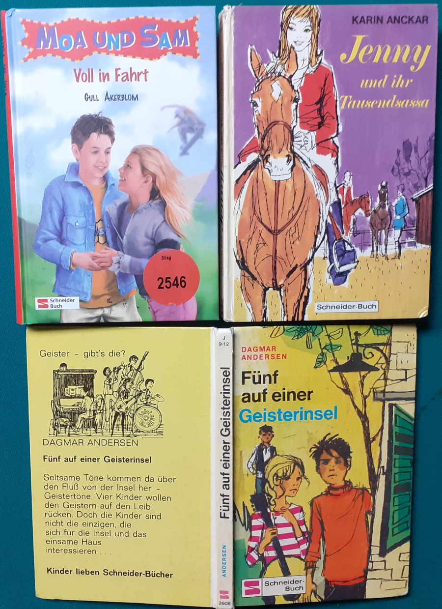 Schneider Verlag: Gull Åkerblom: Schwedische Schriftstellerin, geb. 1943 in Ulricehamn Moa und Sam: Voll in Fahrt Einbandillustrationen von Breunig / Vorbrugg, Ausgabe von 2002, 142 Seiten, sehr guter altersgemäßer Zustand Preis: 6 EURO Karin Anckar: Jenny und ihr Tausendsassa Schneider Verlag München, Ausgabe von 1969, Illustrationen von Ulrik Schramm; 124 Seiten; altersgemäßer guter Zustand, Preis: 6 EURO Eigentlich Karin Inez Maria Anckarsvärd, schwedische Jugendbuchautorin und Übersetzerin; geb. am 10. August 195 in Stockholm; gest. am 16. Januar 1969 in Malmö. Hier zur Illustratoren-Galerie mit typischen Arbeiten von Ulrik Schramm Dagmar Andersen: Fünf auf einer Geisterinsel Illustrationen von Nikolaus Moras (Deckelbild) und Friedrich A. Kohlsaat (Textillustrationen), Ausgabe von 1969, 74 Seiten, guter altersgemäßer Zustand Preis: 6 EURO Hier zur Illustratoren-Galerie mit typischen Arbeiten von Friedrich Kohlsaat Hier zur Illustratoren-Galerie mit typischen Arbeiten von Nikolaus Moras |