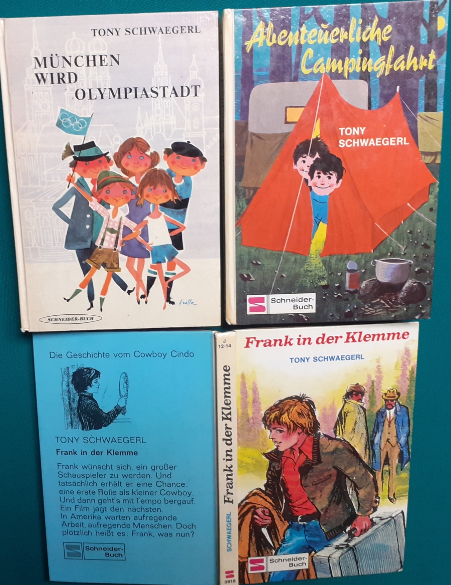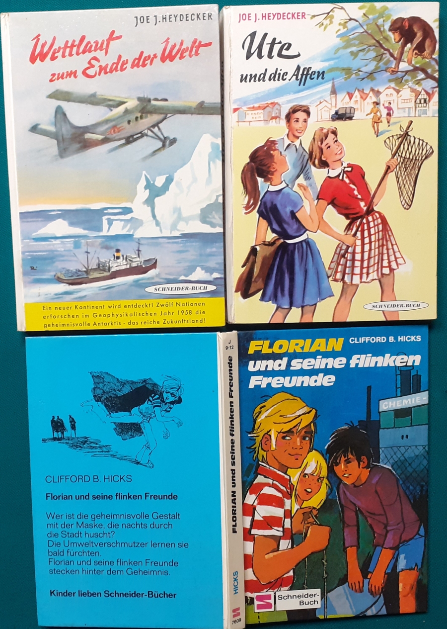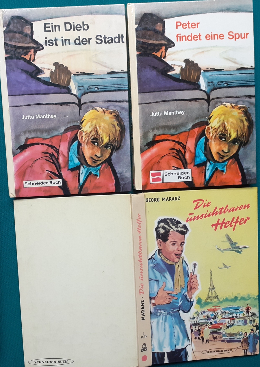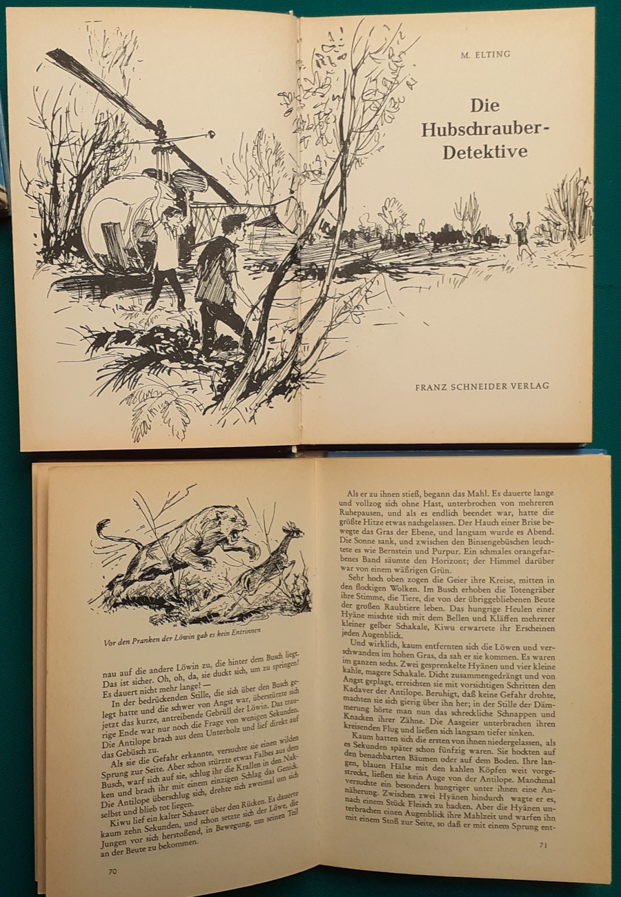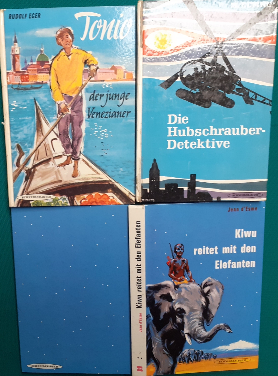 Schneider Verlag: Rudolf Eger: Tonio der junge Venezianer 88 Seiten, Illustrationen von Ulrik Schramm, guter altersgemäßer Zustand Preis: 6 EUR Rudolf Eger (auch: Rudolf Georg Christian Eger, Rudolph Eger, geboren am 16. Januar 1885 in Wien; gest. am 18. Februar 1965 in München) war ein österreichisch-schweizerischer Schriftsteller und Regisseur. Er schrieb auch unter den Pseudonymen Rudolf Hochglend und Georg Rudolph. Eger war Verfasser von Romanen, Kinder- und Jugendbüchern, Theaterstücken und Libretti. Hier zur Illustratoren-Galerie mit typischen Arbeiten von Ulrik Schramm M. Elting: Die Hubschrauber-Detektive Illustrationen von E. Puelma und Werner Kulle, Ausgabe um 1965, 128 Seiten, guter altersgemäßer Zustand Preis: 6 EURO Mary Elting (geb. am 21. Juni 1906 in Creede, Colorado, gest. am 29. Januar 2005) war eine US-amerikanische Schriftstellerin. Sie verwendete auch das Pseudonym Cole Davis. Hier zur Illustratoren-Galerie mit typischen Arbeiten von Werner Kulle
