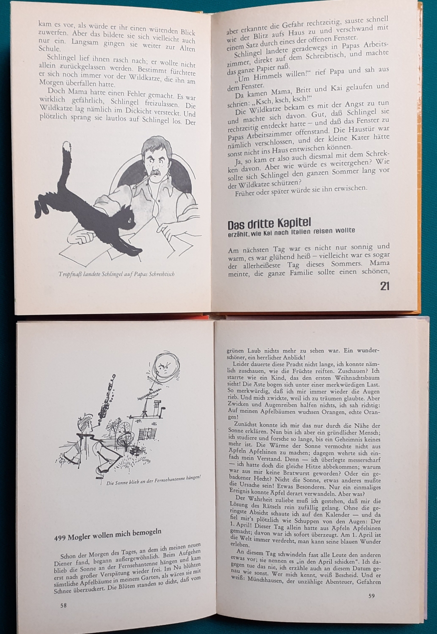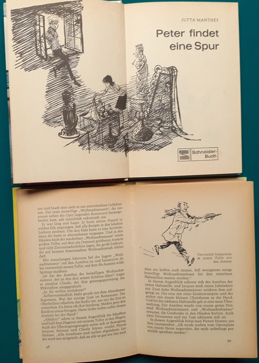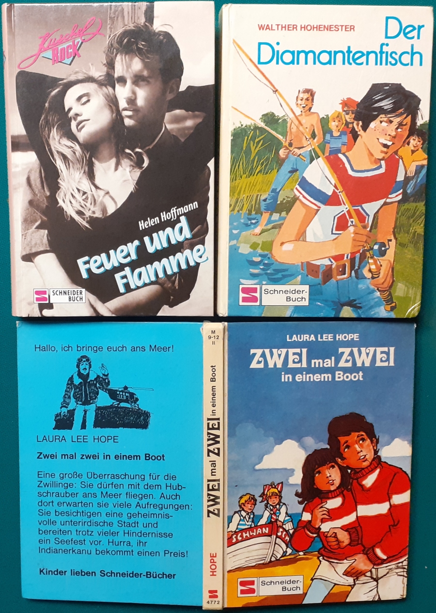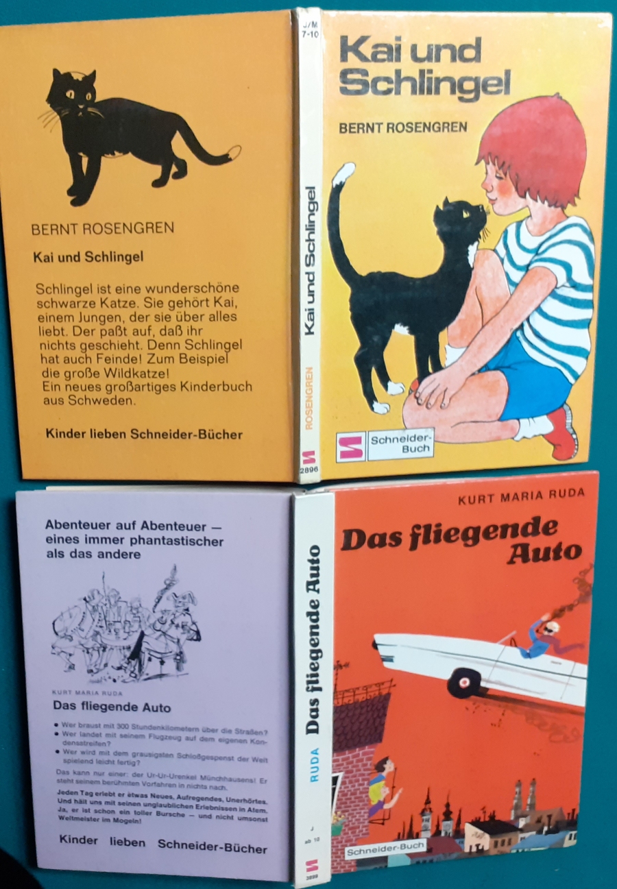 Schneider Verlag: Rudolf Eger: Tonio der junge Venezianer 88 Seiten, Illustrationen von Ulrik Schramm, guter altersgemäßer Zustand Preis: 6 EUR Rudolf Eger (auch: Rudolf Georg Christian Eger, Rudolph Eger, geboren am 16. Januar 1885 in Wien; gest. am 18. Februar 1965 in München) war ein österreichisch-schweizerischer Schriftsteller und Regisseur. Er schrieb auch unter den Pseudonymen Rudolf Hochglend und Georg Rudolph. Eger war Verfasser von Romanen, Kinder- und Jugendbüchern, Theaterstücken und Libretti. Hier zur Illustratoren-Galerie mit typischen Arbeiten von Ulrik Schramm M. Elting: Die Hubschrauber-Detektive Illustrationen von E. Puelma und Werner Kulle, Ausgabe um 1965, 128 Seiten, guter altersgemäßer Zustand Preis: 6 EURO Mary Elting (geb. am 21. Juni 1906 in Creede, Colorado, gest. am 29. Januar 2005) war eine US-amerikanische Schriftstellerin. Sie verwendete auch das Pseudonym Cole Davis. Hier zur Illustratoren-Galerie mit typischen Arbeiten von Werner Kulle