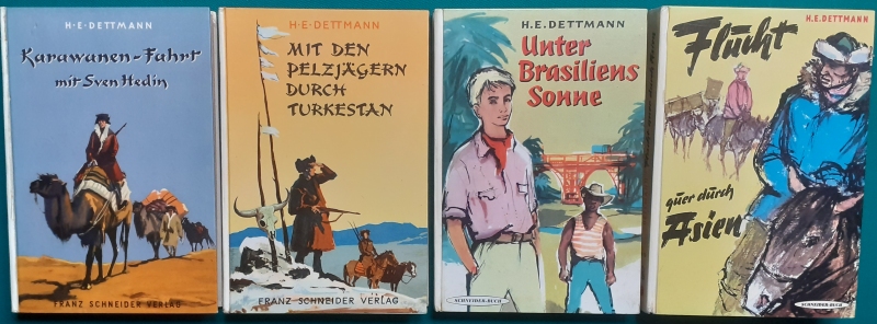 Flucht quer durch Asien Hans Eduard Rudi August Dettmann (geboren am 2. Juni 1891 in Charlottenburg; gest. am 1. Mai 1969 in Bad Harzburg) war ein deutscher Schriftsteller. Dettmann arbeitete als Flugkapitän in der deutschen Zivilluftfahrt, ab 1935 in der Luftwaffe. Mit seinen Reisen gewann er den Stoff für mehrere Abenteuerromane für ein jugendliches Lesepublikum. Die Bücher erzielten zum Teil mehrere Auflagen und wurden in den 1950er Jahren in der Bundesrepublik nachgedruckt. Teilnehmer der chinesisch-schwedischen Forschungsreise unter Sven Hedin 1927-1935 nach Ostasien. Er verwendete auch das Pseudonym Edward Dann (siehe bei unseren Schneiderbüchern weiter oben) ... |