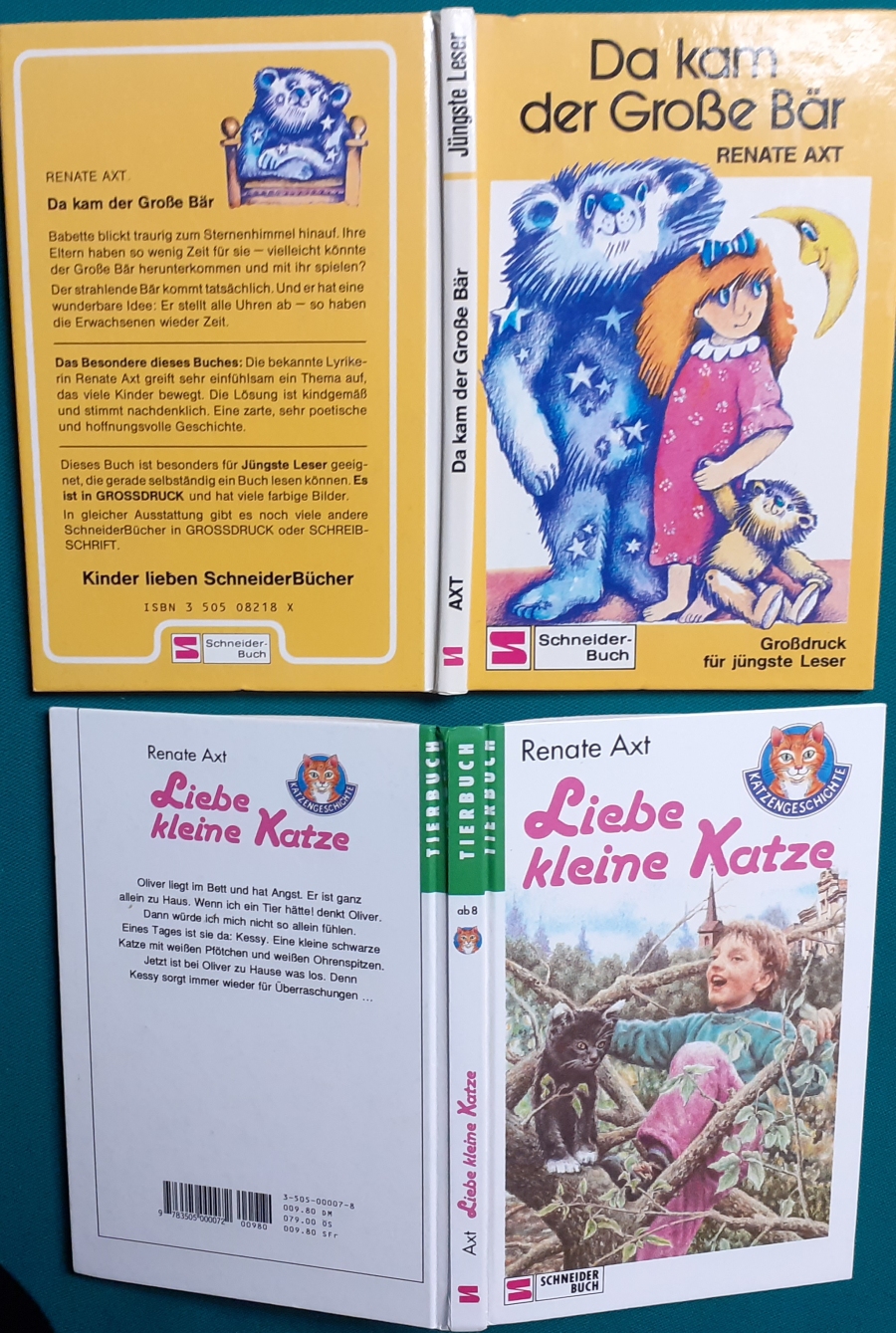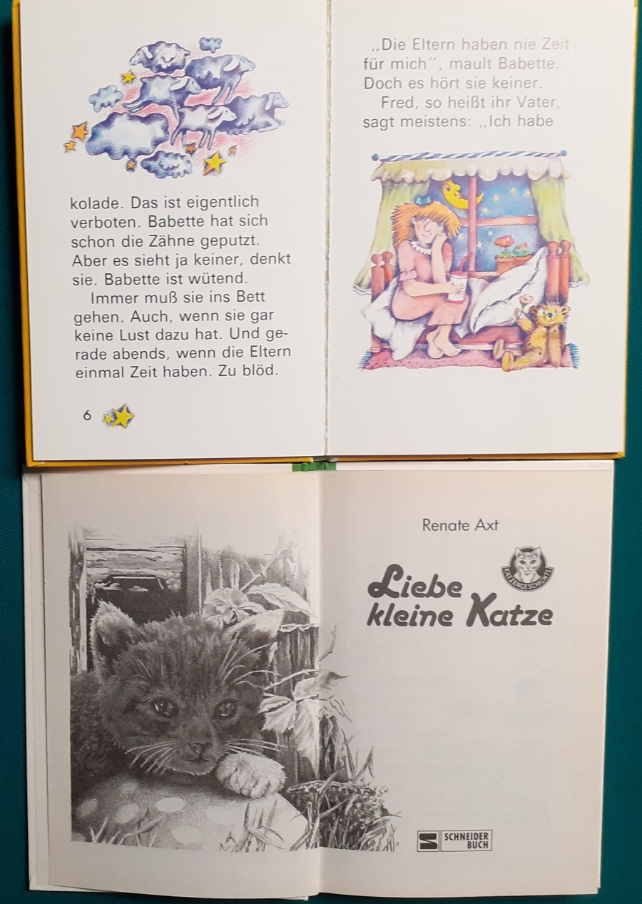 Ausgaben von Renate Axt: Da kam der Große Bär Preis: 6 EURO Petra Probst wurde 1958 in München geboren. Sie studierte später Grafik und Kunst in München und Turin. Jetzt wohnt sie mit ihrer Familie in Cinzano, einem kleinen Weinort in der Nähe von Turin. Kinderbücher illustriert sie seit vielen Jahren. Veröffentlichungen der von ihr illustrierten Kinder- und Jugendbücher erfolgten bisher bei zahlreichen Verlagen. Liebe kleine Katze Renate Axt , früher auch Renate Eitel-Axt (geb. am 9. August 1934 in Darmstadt; gest. am 2. Dezember 2016 in Trier) war eine deutsche Schriftstellerin. Renate Axt absolvierte nach dem Abitur eine Ausbildung als Redakteurin und war anschließend als Journalistin für den Südwestfunk und verschiedene Tageszeitungen tätig. Seit Anfang der 1970er Jahre war sie freie Schriftstellerin. Renate Axt war Verfasserin von Gedichten, Erzählungen, Kinderbücher und Theatertücken. |