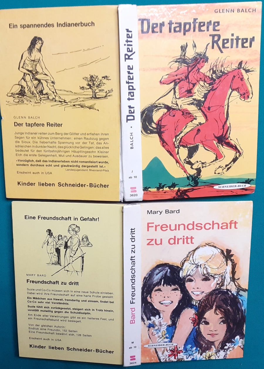Schneider Verlag: Glenn Balch: Der tapfere Reiter Illustrationen von Kajo Bierl, Ausgabe um 1962, 142 Seiten, etwas am Rücken beschädigt; sonst altersgemäßer recht guter Zustand Preis: 4 EURO Glenn Balch: US-amerikanischer Autor, geb. am 11. Dezember 1902 in Venus, Texas; gest. am 16. September 1989 in Idaho. Hier zur Illustratoren-Galerie mit typischen Arbeiten von Kajo Bierl