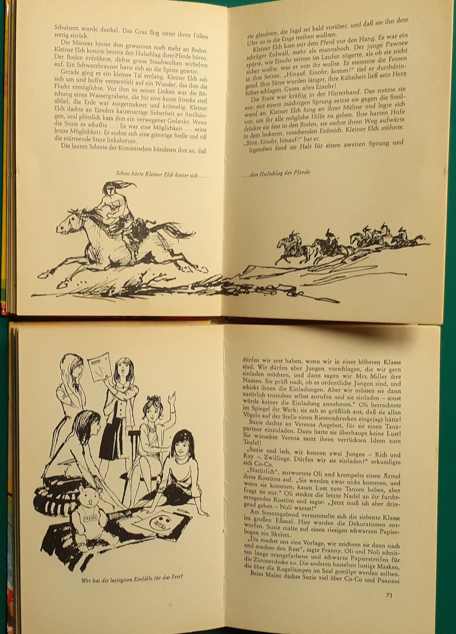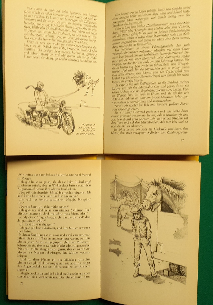 Katrin Dillenburger: Peter Dörner: Jagd auf den schwarzen Mustang Illustrationen von Bärbel Skarabela, Ausgabe von 1972, 90 Seiten, guter altersgemäßer Zustand Preis: 6 EURO Peter Dörner; Pseudonym für Peter Dubina (geboren am 1. Juli 1940 in Iglau, Tschechien; gest. am 7. März 1990 in Illertissen, Allgäu) war ein deutscher Autor tschechischer Herkunft. Er schrieb in den Genres Western, Science-Fiction, Krimis und Horror unter zahlreichen Pseudonymen ca. 150 Romane, die hauptsächlich in Leihbuchreihen und Heftromanserien erschienen. Am bekanntesten ist er durch seine unter dem Pseudonym R. F. Garner verfassten Western-Romane. Laut Verlagsangaben beträgt die Gesamtauflage seiner Romane über 20 Millionen. Sein Science-Fiction-Roman Entscheidung im Weltraum (1973) wurde unter dem Titel Decision in Space 1976 ins Englische übersetzt. Hier zur Illustratoren-Galerie mit typischen Arbeiten von Bärbel Skarabela |