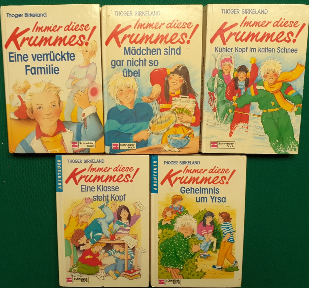 Verlag: Die Abenteuerreihe Immer diese Krummes! von Thøger Birkeland: Reihe von Ende der1980er Jahre mit Illustrationen von Kirsten Hoffmann und Rieke Riekenberg; Umfang der Bücher etwa 120 Seiten, jeweils altersgemäßer guter Zustand Preis je Band: 5 EURO Band 1: Eine verrückte FamilieAusgabe von 1989 Band 3: Mädchen sind gar nicht so übelAusgabe von 1989 Band 4: Kühler Kopf im kalten SchneeAusgabe von 1989 Band 5: Eine Klasse steht KopfAusgabe von 1990 Band 6: Geheimnis um YrsaAusgabe von 1990 Thøger Birkeland, (geb. am 30. März 1922; gest. am 6. April 2011), dänischer Lehrer und Kinderbuchautor. |