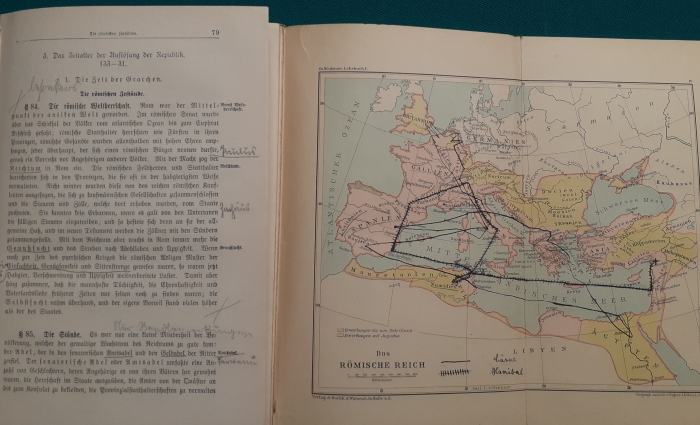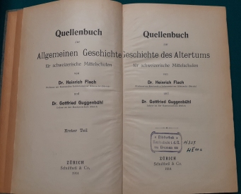 Quellenbuch zur Geschichte des Altertums für schweizerische Mittelschulen Ausgabe von 1914, Schultheiß Verlag, Zürich; von Heinrich Flach und Gottfried Guggenbühl, 350 Seiten, Leinenrücken mit festem Hartpappeinband - der komplette Einband wurde offensichtlich restauriert und ist sehr fest; guter altersgemäßer Zustand