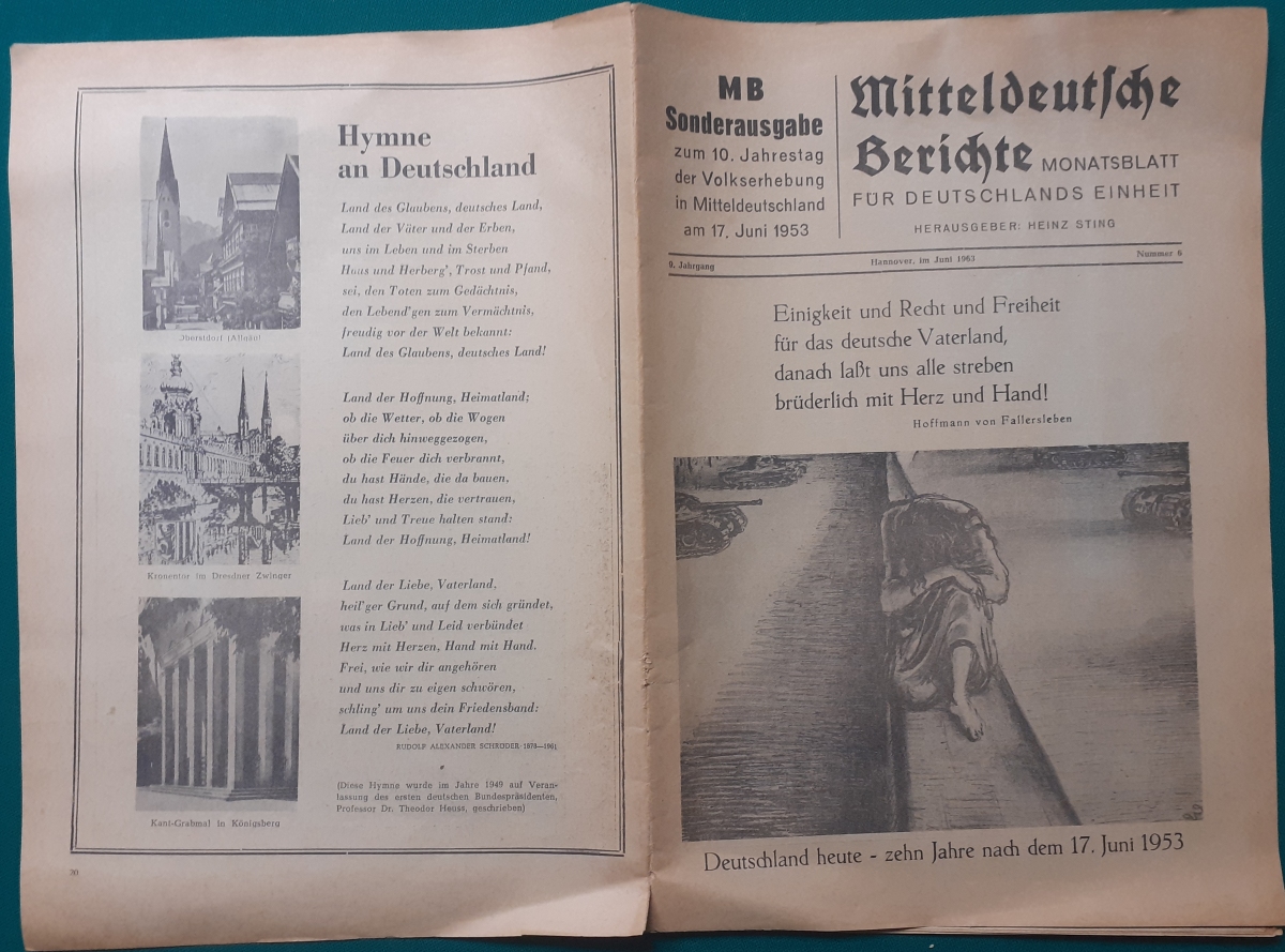 Mitteldeutsche Berichte (MB)  Hrsg. Heinz Sting; erschienen im Juni 1963 in Hannover, Heft mit 20 Seiten; Format 29,5 x 21 cm, Papier altersgemäß recht gelb; sonst guter altersgemäßer Zustand - offensichtlich kaum benutzt,