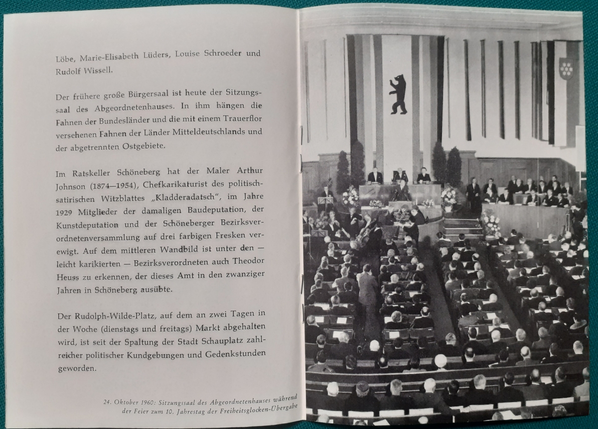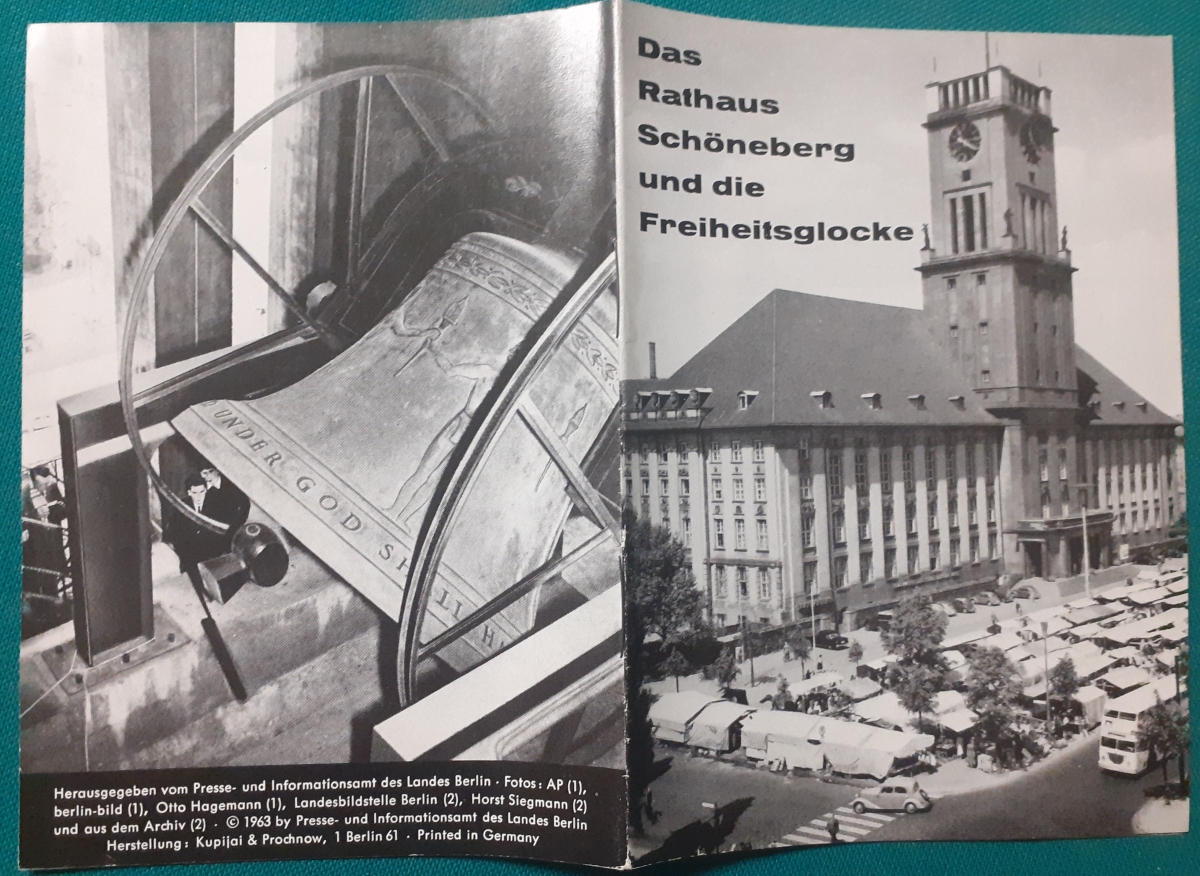 Das Rathaus Schöneberg und die Freiheitsglocke Hrsg. Presse- und Informationsamt des Lands Berlin (West); erschienen 1963, Heft mit 16 Seiten in Seidenglanz - voller ganzseitiger Fotos; Format 14,5 x 10,5 cm, guter altersgemäßer Zustand - offensichtlich kaum benutzt,
