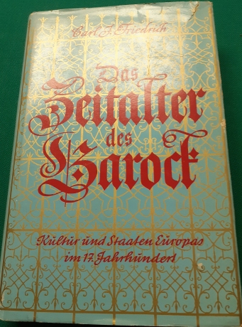 Das Zeitalter des Barock von Carl J. Friedrich; Kohlhammer Verlag; Stuttgart; Ausgabe von 1954; 380 Seiten, mit diversen Abbildungen; sehr stabiler fester Voll-Leinen Einband mit Schutzumschlag; Papier-Schutzumschlag etwas beschädigt; sonst guter altersgemäßer Zustand Preis: 7 EUR  |