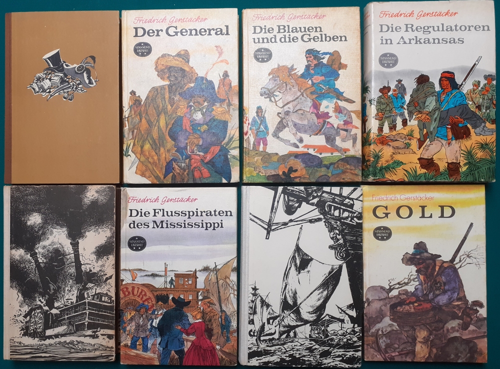 Abbildung unten das zweite Buch von links: Die Flusspiraten des Mississippi Aus dem Weltleben Amerikas |