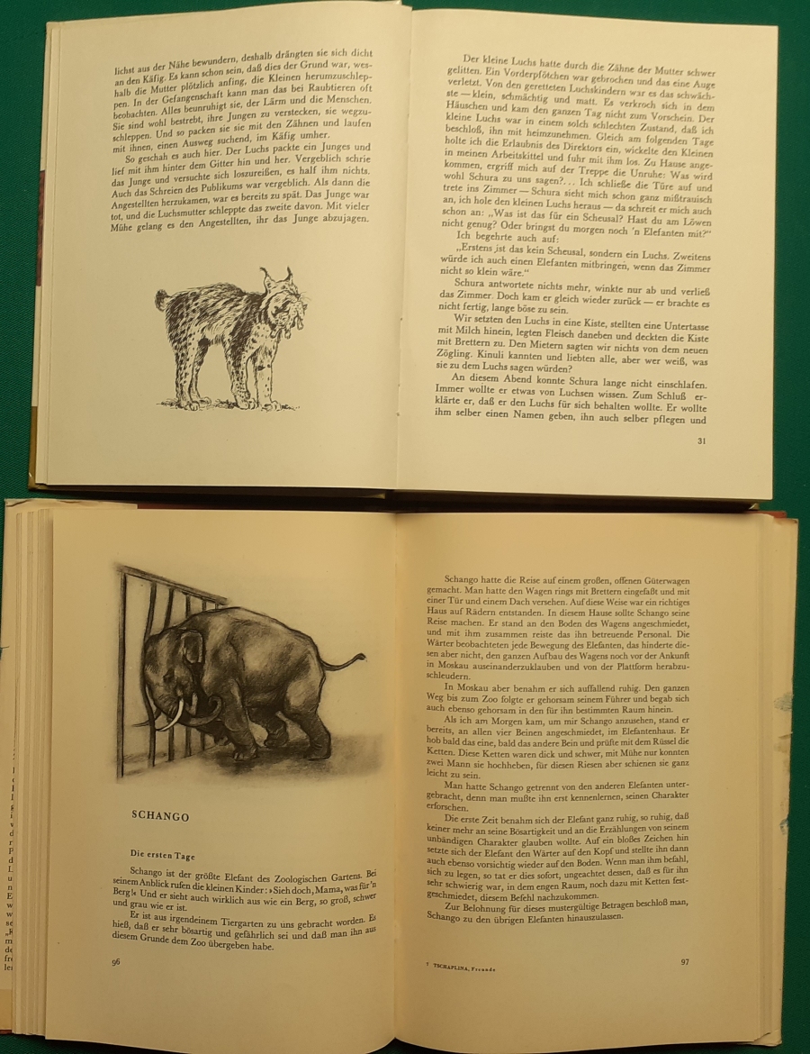Wera Wassiljewna Tschaplina; geb. am 24. April 1908 in Moskau; gest. am 19. Dezember 1994 ebenda) war eine russische Autorin von Kinder- und Tierbüchern. Ihr Leben und Schaffen war mit dem Moskauer Zoo eng verbunden war. Wera Tschaplina wurde in einer alten Adelsfamilie geboren. Nach der Oktoberrevolution 1917 ging die Zehnjährige im Chaos des Bürgerkriegs verloren und landete in einem Kinderheim. 1923 fand die Mutter ihr Kind wieder und zog mit ihm zurück nach Moskau. Im selben Jahr wurde Tschaplina Mitglied des Zirkels Junger Biologen im Zoo. Mit 25 Jahren gründete sie als ein Experiment den Kinderzoo, in dem alle Jungtiere miteinander auskommen sollten. 1933 erschienen in der Zeitschrift Der Junge Naturforscher ihre ersten Tiererzählungen. Ihr erstes Buch Kleine Tiere aus dem grünen Tiergehege im Zoo wurde 1935 vom Moskauer Kinderbuchverlag publiziert. 1935 zog sie das von seiner Mutter verstoßene Löwenjunge Kinuli bei sich zu Hause groß, d. h. in einer für das damalige Moskau typischen Gemeinschaftswohnung, in der noch andere Familien wohnten. 1937 wurde sie Leiterin der Sektion Raubtiere des Moskauer Zoos. Im Jahr 1939 wurde ihr Buch My animal friends in London veröffentlicht. Tschaplina arbeitete bis 1946 im Moskauer Zoo und widmete sich dann ausschließlich der literarischen Arbeit. Ihre Erinnerungen verarbeitete Tschaplina in dem Buch der Vierbeinige Freunde (1947) und Zöglinge des Zoo (1955–1965), das auch im deutschsprachigen Raum mehrfach verlegt wurde. Sie starb 1994 in Moskau. Informationen von wikipedia vom 14.1.2020 |