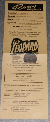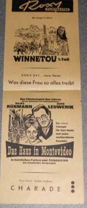 Werbung für die Produktionen; Blatt um 1960 Der Leopard mit Burt Lancaster und Claudia Cardinale, Winnetou I mit Pierre Brice; Das Haus in Montevideo mit Heinz Rühmann und Ruth Leuwerik einmal gefaltet; Format 31 x 11 cm; guter altersgemäßer Zustand Preis 2 EUR |