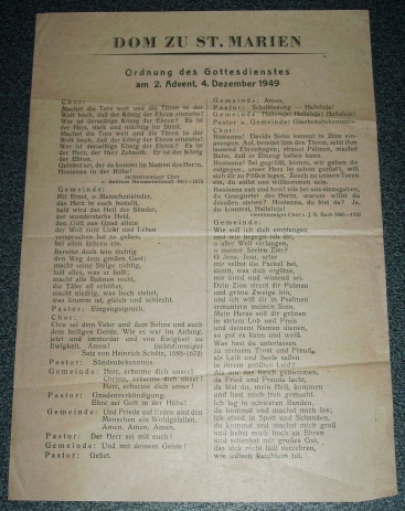 Ordnung des Gottesdienstes Kirchenmusik vor dem Gottesdienst von Heinz-Georg Oertel Einzelblatt; Knicke, insgesamt befriedigender altersgemäßer Zustand Preis: 1 EURO |