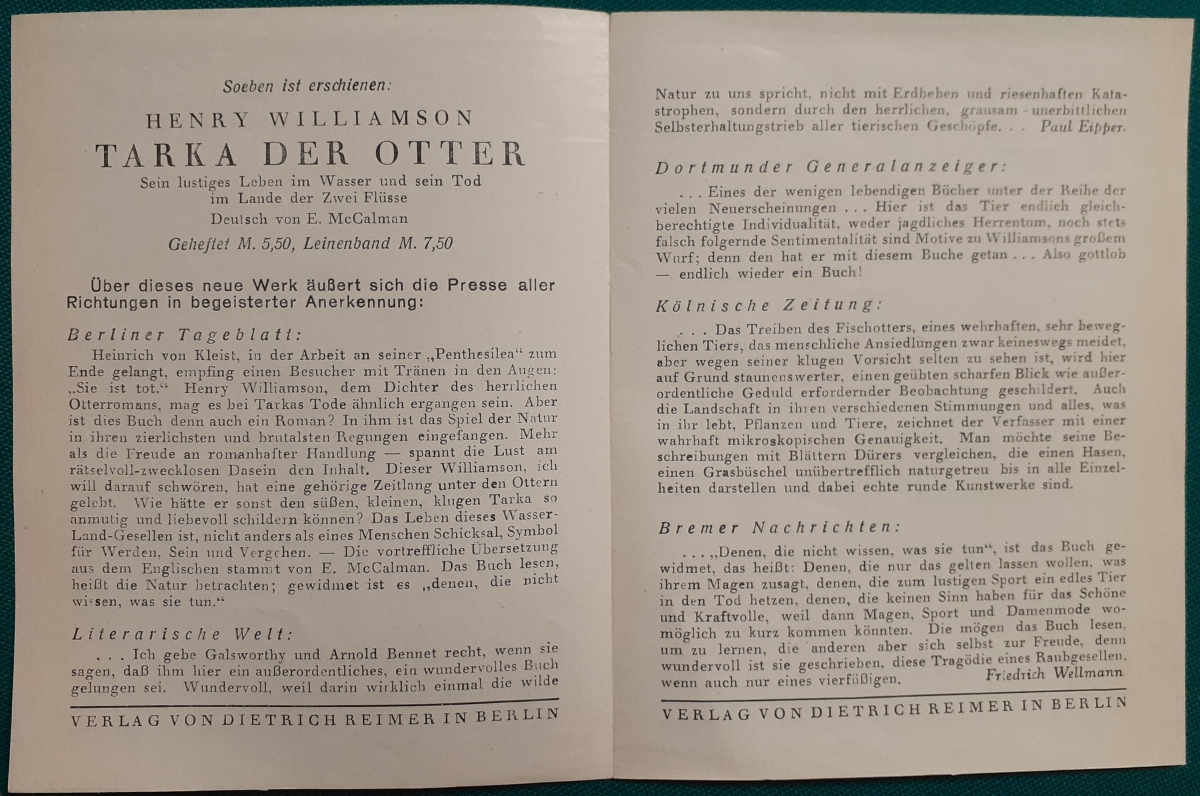 Präsentation des Buches von Ausgabe um 1927; Faltblatt 14 x 11 cm mit 4 Seiten, Urteilen aus der Presse und einem Foto; Blatt in sehr gutem altersgemäßen Zustand Preis 2 EUR |