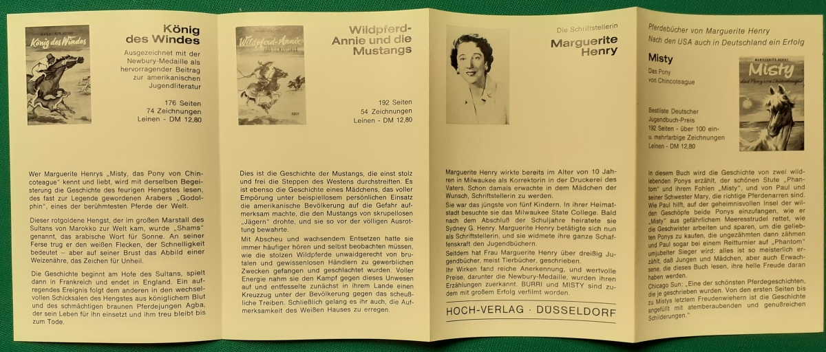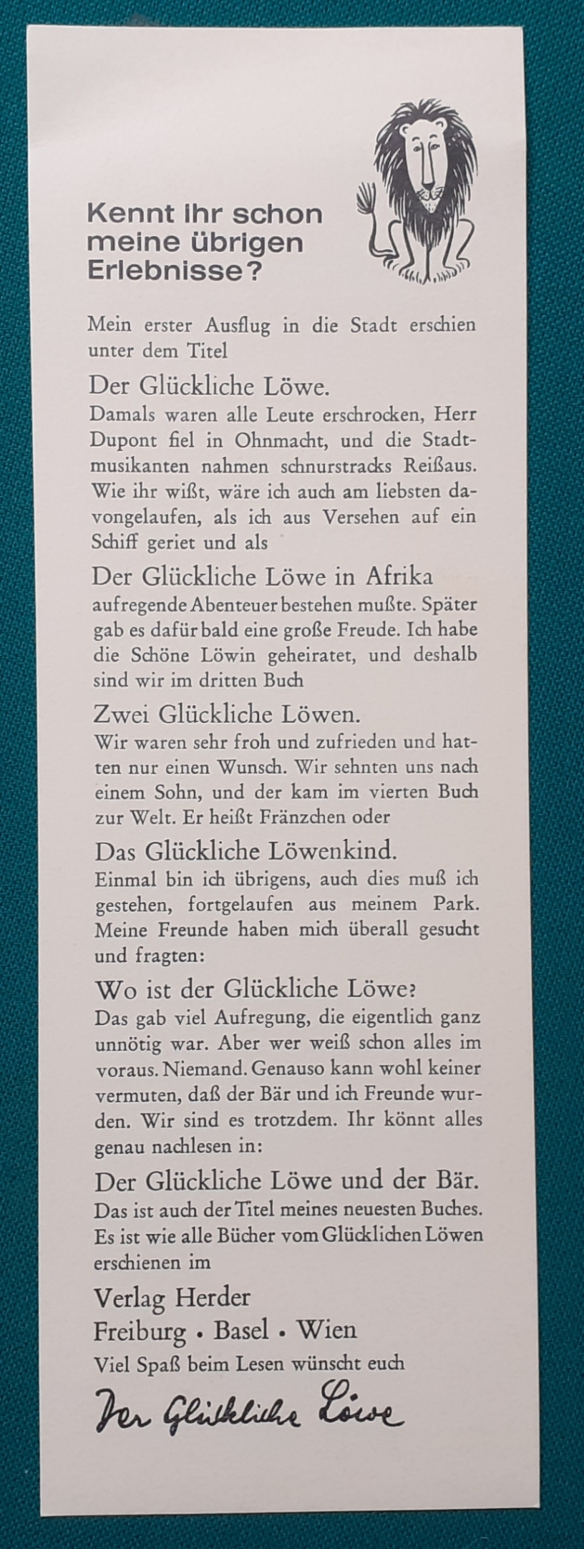 Werbeblatt zu Büchern um den Glücklichen Löwen im Verlag Ausgabe um 1965; Doppelblatt in Pappe im Format 24 x 8 cm, beidseitig beschrieben; Blatt in gutem altersgemäßen Zustand Preis 1 EUR |
