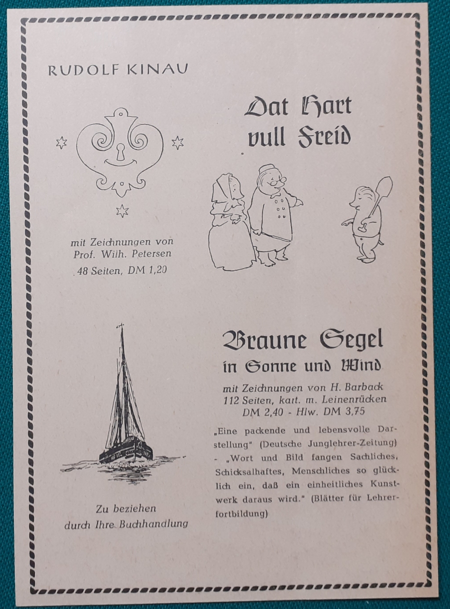 Dat Hart vull Freid - Braune Segel Ausgabe um 1960; Werbe-Postkarte für zwei Bücher des Autors; Karte in gutem altersgemäßen Zustand Preis 1 EUR |