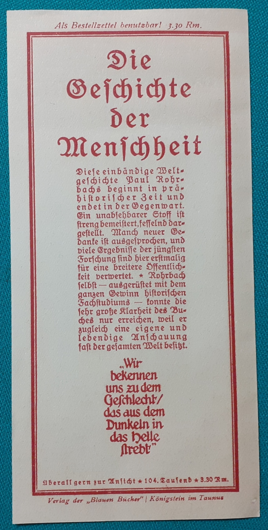 Renzension zum Werk Rankes: Zwei Jahrtausende Deutsche Geschichte Ausgabe um 1930; Werbeblatt - doppelseitig bedruckt - im Format 17 x 8 cm für das Werk im Verlag; Blatt in gutem altersgemäßen Zustand Preis 1 EUR |