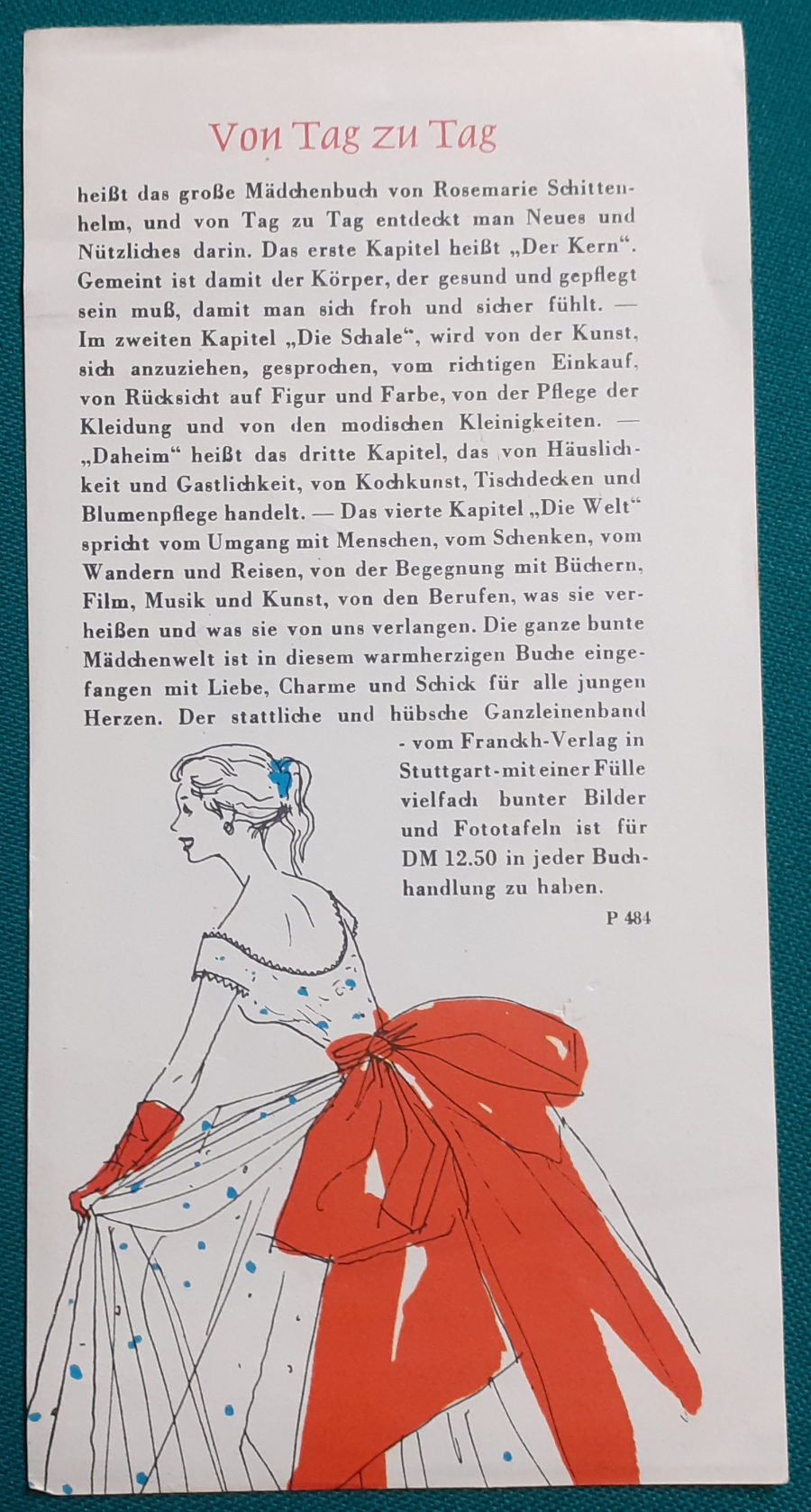 Ausgabe um 1955; Werbeblatt im Format 18,5 x 9 cm für das Werk im Verlag; Blatt in gutem altersgemäßen Zustand Preis 1 EUR |