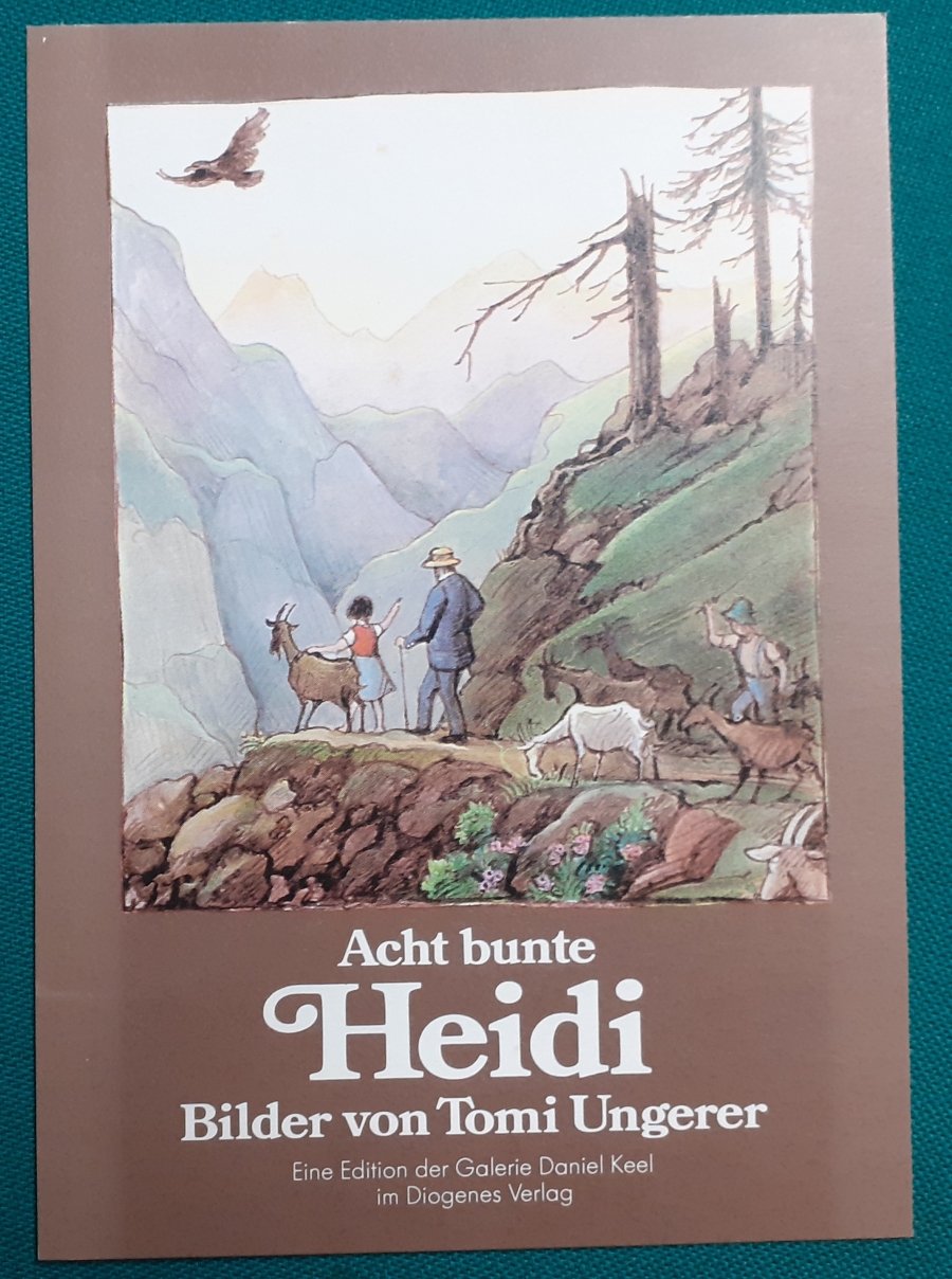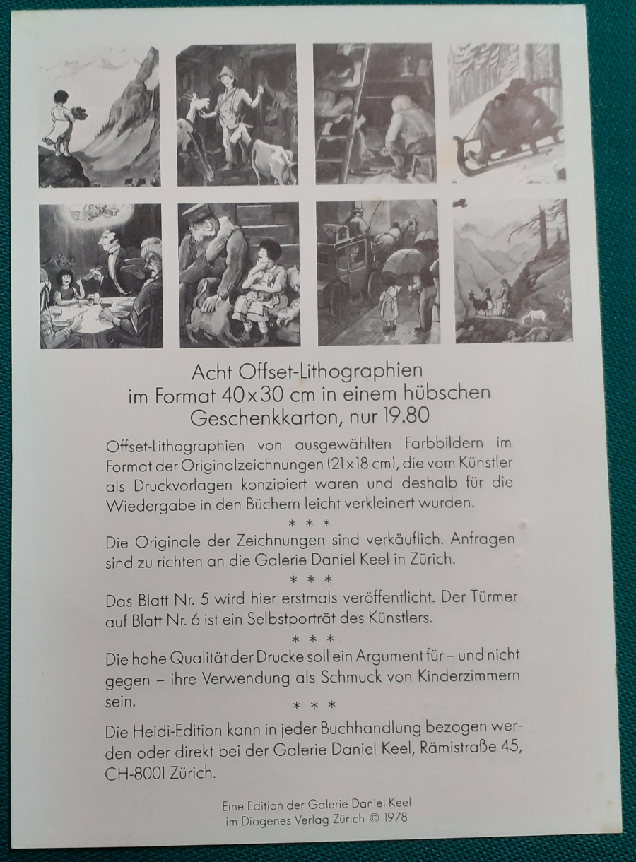 Ausgabe von 1978; Werbekarte im Postkartenformat für 8 Lithographien des Illustrators zu "Heidi" von Johanna Spyri; Karte in gutem altersgemäßen Zustand Preis 1 EUR |